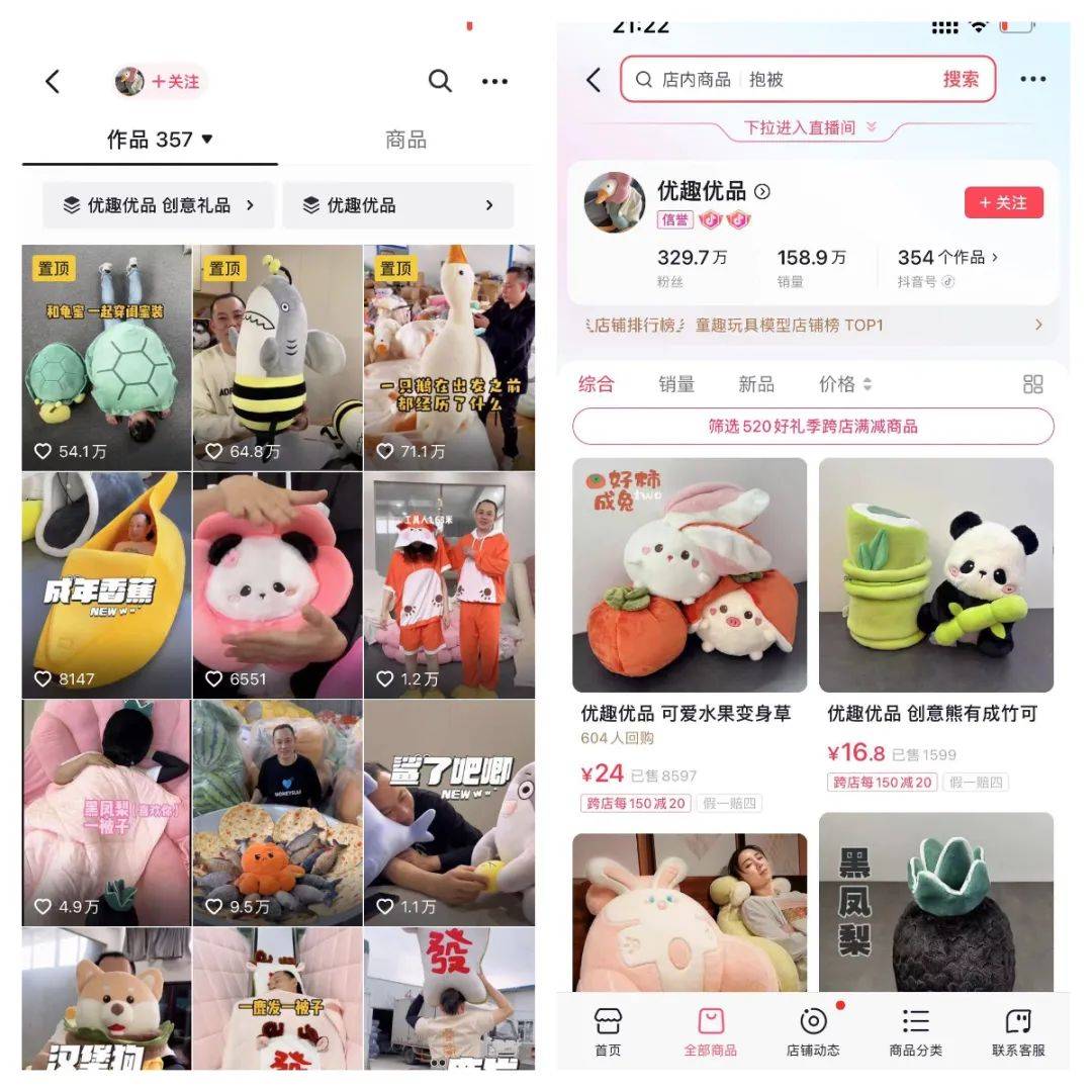 作者 | 张知白编辑 | 杨佩汶设计 | 晏谈梦洁来源 | 运营研究社 2023 年,抖音电商的生意规模还在持续增长: 根据 5 月 16 日,抖音电商公布的数据显示,近一年的 GMV 增速超过了 80%,超过 18 万家成长中的新商家年收入突破百万,上万款商品成为 GMV 破千万元的“爆品”。 ![]() 在 GMV 和新商家收入双增长的情况下,抖音电商进一步提升产品能力、扶持措施,商家达人也借助抖音电商,继续在「全域经营」上有所突破。平台、商家、达人经过实践,沉淀出了不少有效的方法论。 今天运营社就来聊聊,抖音电商最新趋势,以及商家达人如何通过经营全域兴趣电商,实现业绩增长。 01 、GMV 年增幅超过 80%,抖音全域兴趣电商仍在快速发展 所谓全域兴趣电商既包括短视频和直播为主的“内容电商”,也包括抖音商城、搜索、店铺等渠道为主的“货架电商”。 全域兴趣电商既可以通过「内容」激发用户的「潜在消费」意愿,又能通过「货架」满足用户的「主动购物」需求。两者互联互通,不仅能打造面向用户的一站式的消费场景,又可以满足商家多元经营的需求。 经过一年多时间的实践,抖音电商又提出了“全域互联互通”的飞轮模型,「内容」和「商品」成为了驱动增长的飞轮,具体而言,发生了哪些变化呢? 1)全域内容建设,成为内容场新增量 在抖音电商上,内容是流量的关键环节。但不少经营者对内容的理解是,认为在抖音上经营,就只需要做短视频。 但其实,在抖音电商,好的内容不仅仅局限于短视频,全域内容还包含直播、短视频、图文,这些形式的内容建设也在成为重点。依靠高质量且多元的内容让商家持续获得流量,才能促进生意的增长,变成实实在在的销量。 ![]() 其中「内容场」的三个变化趋势值得注意: 首先,图文正在成为新的机会点。 自从今年 2 月,抖音电商全面开放图文带货入口后,抖音图文取得相当不错的成绩。仅有 5000 粉丝的@宛宛爱分享,一篇图文就卖出了 33 万的销售额。拥有深度内容池的抖音电商,能容纳多样且丰富的内容,而更丰富的内容形式能带来更多的「消费动机」。 其次,内容能够丰富商品信息。 有些商家勤于短视频引流,却疏于商品信息的完善。抖音电商公布的数据显示,有短视频封面的商品卡比大盘(整体平均)转化率高 20% ,带有详实评价的商品转化率会提高 98% 。这意味着,丰富商品的信息,也是另一种维度的内容力,想要经营好抖音电商的商家们不应该忽视。 最后,内容能力可以促进生意。 抖音电商拥有繁荣的内容生态,和多样丰富的用户人群。优秀的内容能力,能够持续为商家带来稳定的客流,形成高效转化。 总体而言,全域内容建设,意味着商家,要不断提高内容能力,并将其作用于整个商业版块,让内容能力全面且丰富,这样才能让生意持续增长。 2)抖音商城增长 277%,“好商品”成为新的流量引擎 随着直播电商的不断发展,不少消费者的消费习惯也在不断发生改变。 过去,在直播间看了就下单,而如今,不少消费者会先看种草视频,对商品感兴趣之后,再“蹲守”直播间进一步了解,再通过“切片”、商城搜索等等方式多方位了解商品,才确定最终下单行为。 在这种情况下,好的商品就成为了第二流量引擎,也就是所谓的“好的商品自带流量”。根据数据显示,过去一年,抖音商城 GMV 同比增长 277% ,全平台货架场 GMV 占比已超过 30% ,好商品带来的贡献正在不断增长。 另一边,消费者因为长期在抖音购物,培养了购物习惯。越来越多的消费者,会因为需求,主动在抖音商城里搜索商品,下单购买。 「主动消费」也成为了抖音消费增长的一大动因,抖音电商搜索订单量同比增长 202% 。 面对消费者消费行为的变化,想要承接好抖音的「主动消费」的流量,商家们做好抖音商城才能更好满足消费者的需求。 3)全域飞轮模型,打通内容与货架 不久前的,抖音电商生态大会上,抖音电商首次提出“全域一体,飞轮增长”的经营导向。 在这个模型下「内容场」和「货架场」的双场景驱动,是抖音电商增长的主要动力。内容场推动货架场的增长,货架场又反过来推动内容场的增长,形成良性循环的飞轮效应。 ![]() 在这个模型下,全域互联互通能够让飞轮的增长更加迅速。为了打通内容场和货架场,实现全域互通互联,抖音电商在产品、运营方面推出诸多举措: 第一,内容场景与货架场景轻松切换,沉浸式浏览消费; 第二,内容场景的“新品”“爆品”,在货架场景有更高分发权重; 第三,营销产品配合全域兴趣电商迭代,巨量千川推出全域推广 这种变化下,也就是说内容场做的好,可以带动货架场的流量;货架场做的好,也能带动内容场的流量。在全域兴趣电商下,「全域内容建设」和「全域商品经营」需齐头并进,才能实现更加高效的发展。 02 、商家如何借助抖音电商在「全域经营」下实现生意增长? 在抖音电商升级做全域兴趣电商后,不少商家告别过去在局部找增量的办法,转变为了追求整体增长。一年过去了,不少商家,在转变增长方向后都取得不俗的成绩。 它们是怎么做到的呢?运营社总结了以下几个方法,并分享几个高效运营的商家案例,给到大家一些经营的思路和启发。 1)提高「内容」质量,放大流量价值 @优趣优品 是一家抖音上的潮玩电商,粉丝量高达 329.8万。其“谐音梗”玩具火遍了全网,比如“菜狗”(白菜+狗)、“鲨蕉”(撒娇,鲨鱼+辣椒),其龟壳玩具种