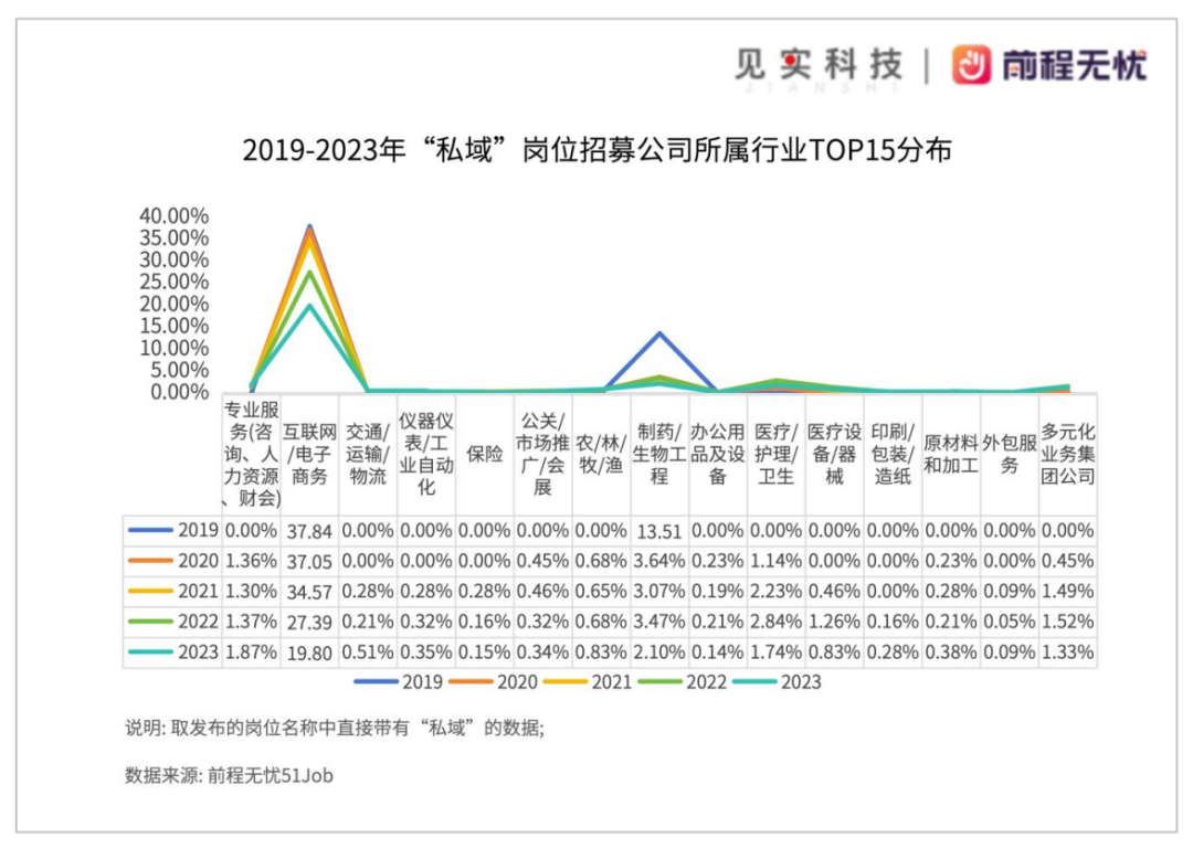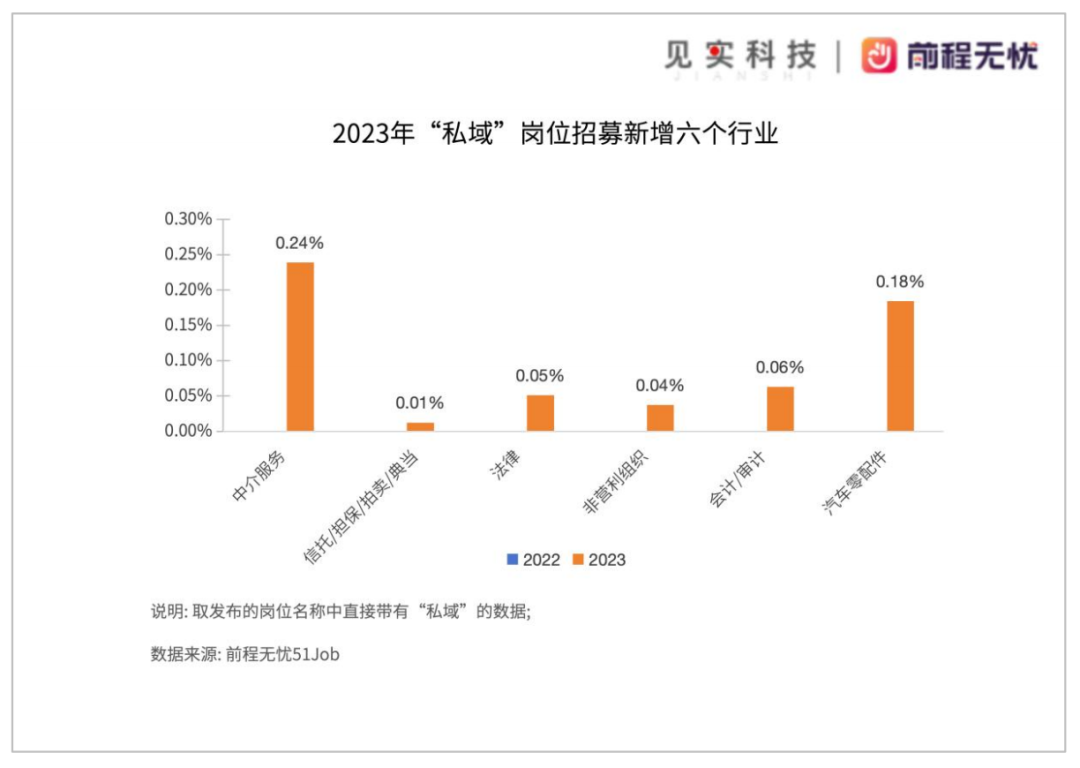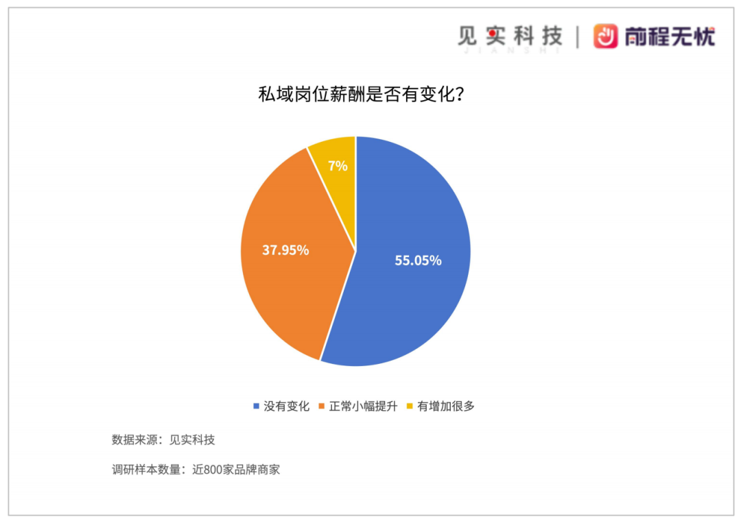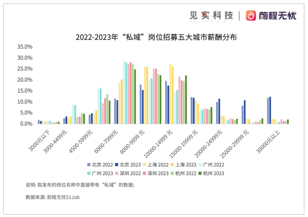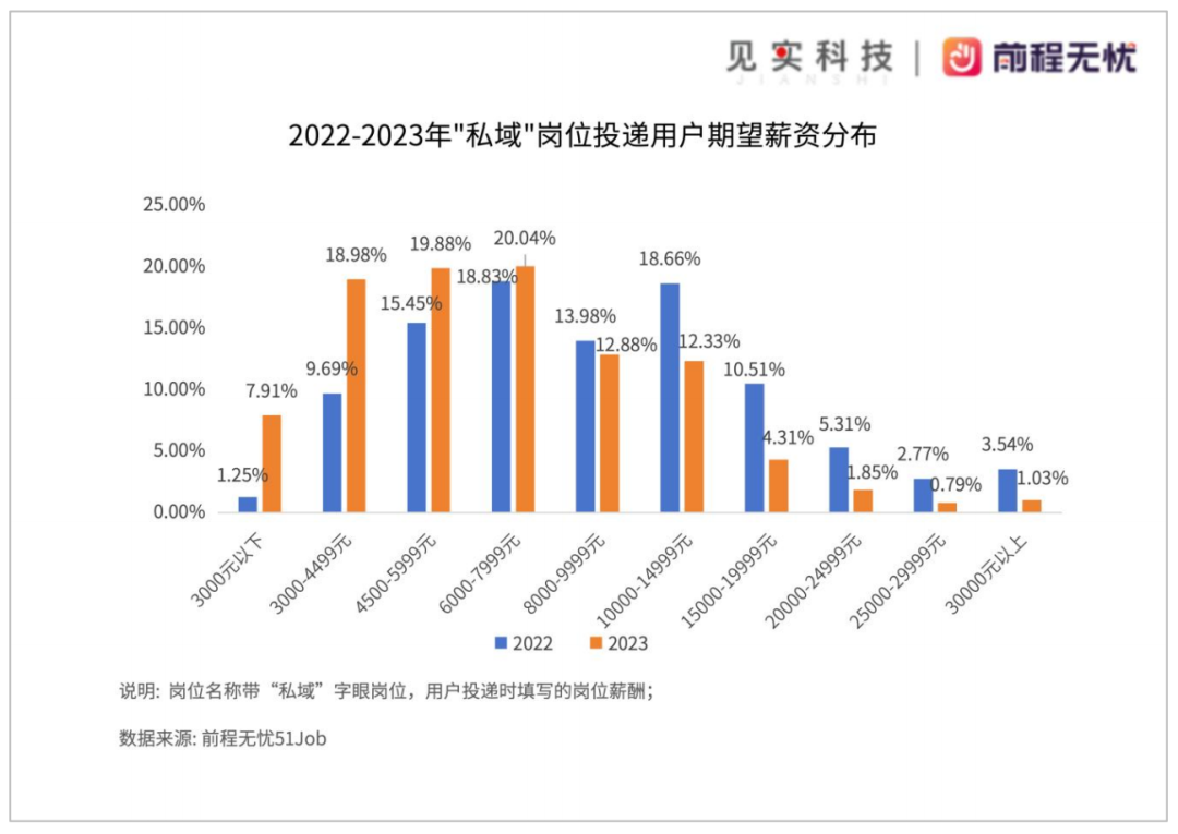 来源| 见实 01企业给出私域岗月薪范围多在6千~1万元之间 在2023年企业发布岗位薪资范围中,企业给出最多的月薪范围是“6000-7999”元(占26.81%),和“8000-9999”元(占20.44%)。 如果对比2022年,会发现在企业的薪资预算中,超过1万元的比例都有所下降,不到1万元的薪酬占比上升。 ![]() 结合报告其他章节内容,基于2023年行业的变化,如发布相关岗位的企业、覆盖的地域和行业的增多等因素,则会传递出更多信息: - 更多中小企业涌入私域,通常无法给出和大品牌相当的岗位预算(薪资);表现在年度数据中,就出现了薪资预算的下降。 - 更多二三四线城市的企业开始布局私域,同样给出的薪酬会拉低大盘的薪资。 - 此外,一些成熟行业将业务转移至代运营,部分代运营公司习惯于将团队配置在用工成本较低的二三线城市,以降低运营成本。 - 私域从2019年开始,经过了4-5年的孕育和发展,部分团队的私域高阶岗位(总监以上)已经确定,体现在这类高阶岗位招聘需求在下降。 - 在私域中也存在一个越来越普遍现象,企业将电话销售、微信上对用户的销售转化等工作纳入到私域岗位职责中来。通常这部分岗位以“底薪+销售提成”组合出现。 02高阶私域岗位需求仍在上扬 基于全国越来越多的企业开始招募私域岗位,见实与前程无忧51Job团队特别分析“北京、上海、广州、深圳、杭州”这五大私域领先的城市与“2022-2023年间发布的私域岗位薪资”进行比对,分析月薪走势是否与全国一致,还是受新入场地区起薪的影响。 ![]() 我们发现: 以北京为例,2万元以上高阶岗位相比2022年保持了上涨态势,尤其是3万元以上的高阶岗位,在2023年度发布的私域人才需求中占据了12.35%。 另外,报告中《2019-2023年“私域”岗位招募公司规模占比》图表中显示的“1万人以上超大规模企业,对私域的人才需求量从2022年的3.58%上升为2023年的5.05%,反映出随着超大规模企业在越来越重视私域,需要更多的高阶人才;相比2022年,北京2万元以上岗位占比均有不同程度的上升。 而上海、广州、深圳三个城市中各自呈现不同,如广州,1万元-2万元之间的私域岗位需求在增加,2万元以上私域岗位需求则出现了微跌。上海、深圳两大城市的不同层级预算更像是一个正常波动。杭州则是1万元以上私域岗位的需求都在上涨。 通过不同城市的数据可以看出: 市场两端在分别发力私域的不同阶段,中小企业在构建私域基础、超大集团则将私域升级至全域。 综合数据来看:北上广深杭仍对私域人员有较大需求,特别是高薪管理人才的需求。 03应聘者对薪水预期也有下调 基于上述对企业给出的私域月薪下降同样判断(更多中小企业和二三线城市的涌入),也带来了应聘者对薪水预期的变化。 ![]() 在上图中,薪水预期出现了整体下移,即8000-9999元月薪作为分水岭,8000元以下每个薪资区间都呈增长趋势,10000元以上每个薪资区间均呈下降趋势。 部分也反映出在大环境裹胁下,求职者对期望薪水的预期变化。 04私域岗老员工薪水略有上涨 上述数据都集中在“新”字上——新人求职、企业新招聘需求下,薪酬的预期分别如何。不过从业多年的老员工呢?他们在2023年中薪酬变化如何? 在2023年度行业大调研中,见实设计的问卷也有涉及这一问题。虽然没有直接问薪水范围,不过直接向调研人群问到了薪水涨跌。 ![]() 有37.95%参与调研的品牌商家回复有“小幅提升”,7%回答“增加很多”。而总占比55.05%的调研品牌商家则没有变化。 结合上述数据及另外两个小结论: - 各大品牌商家对高端私域/全域人才需求量在增大; - 在2023年,品牌商家有23.32%增加了人力投入,19.69%增加了预算投入,21.63%增加了资源投入。 由此我们可以分析得出: 即使数据显示市场艰难,且求职者对薪酬预期发生了些许改变,在实际工作中,能带来实效的部门成员的薪酬待遇仍会保持继续增长的态势。 05影视/媒体/艺术/文化传播成私域涨幅第一另9大行业增幅迅速 通过对2023年发布私域岗位所属企业行业分析,发现“互联网/电子商务“行业岗位发布量仍居第一。 “影视/媒体/艺术/文化传播”行业是2023年所有行业中,招募私域岗位涨幅增速排第一,岗位发布量排第二。 ![]() 这直接反映出文化相关领域对于私域的重视,正在加大布局私域的力度。 我们欣喜地看到,更多行业私域需求保持高速增长,尤其以“汽车、房地产、家具/家电/玩具/礼品、建筑/建材/工程、机械/设备/重工、家居/室内设计/装潢、电子技术/半导体/集成电路、网络游戏、专业服务(咨询、人力资源、财会)”等行业涨幅领先。 这些行业过去数年或多受益于私域的发展,因此在2023年也保持了对人才的渴求,岗位数仍在增加中。 06电商仍是私域岗位需求第一教育对私域需求回升 在所有招募私域岗位的行业中,前十大行业分别为: - 互联网/电子商务 - 影视/媒体/艺术/文化传播 - 快速消费品(食品、饮料、化妆品) - 服装/纺织/皮革 - 计算机软件 - 批发/零售 - 贸易/进出口 - 家具/家电/玩具/礼品 - 汽车 - 教育/培训/院校 运用私域最多的是“互联网/电子商务”行业,2023年该行业招募私域岗位数占比虽有所下降,但仍是私域岗位招募最多的行业。 究其原因,一方面,私域招募岗位总量上涨,拉低了“互联网/电子商务行业”招募岗位数量所占百分比;另一方面,这些企业开始将私域团队人员转外包或转至外部代运营团队有一定