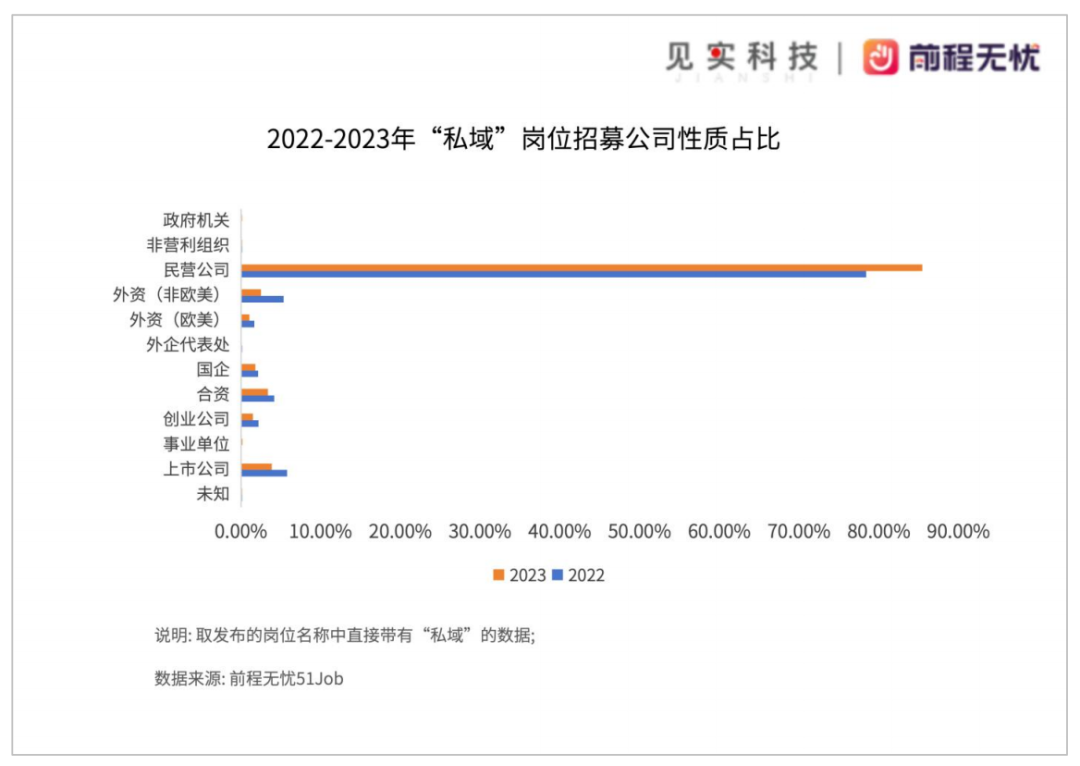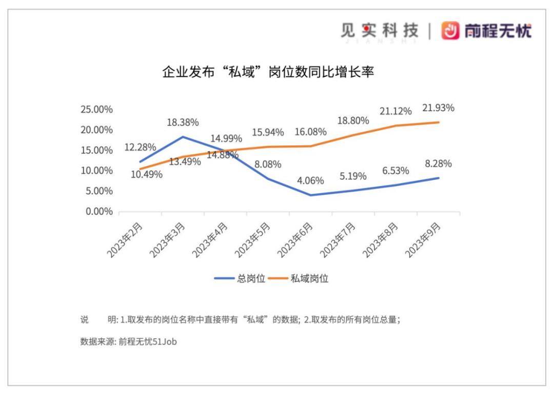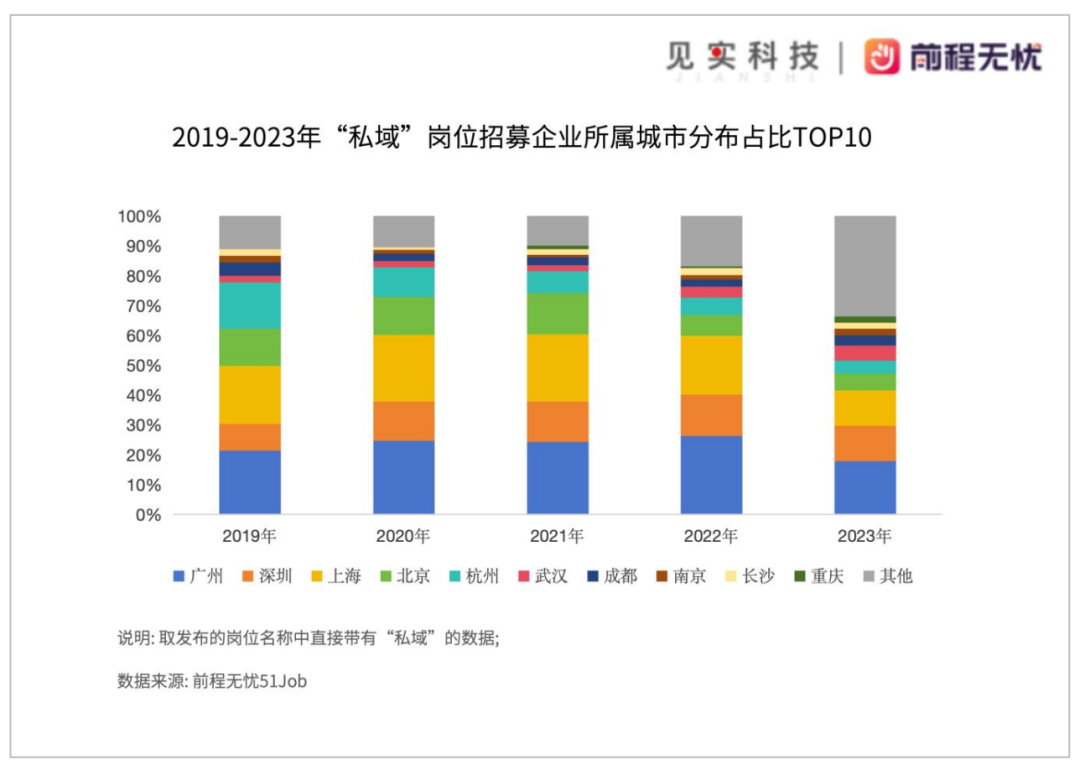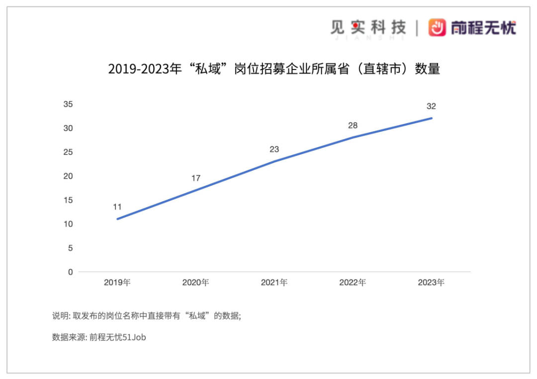 来源| 见实 在即将结束的2023年,我们看到了私域岗位需求的哪些变化? 01、2023年私域岗位数增长优于大盘表现 2023年,企业发布私域岗位的招聘数量是2019年时的61.47倍。尽管与2022年(60.62倍)相比是低速增长,但考虑当下市场环境,在2023年这个增长已经优于大盘表现。 而在2023我们观察的4个岗位(私域、社群运营、直播、短视频)中,除了私域持续上升以外,其他三个岗位发布量均有微量减少。 ![]() 2019年通常被认定为私域元年,私域大起步是在2020年这个特定的时间点。得益于见实团队和前程无忧51Job持续三年都在梳理和发布私域人才需求和薪酬报告。从上图中可以看出,近几年私域行业的急速增长变化。 在市场感知中,2022年已经非常具有挑战,许多从业者预测在大开放后的2023年会迎来市场回归,但事实并非如此,有专家表述当下市场环境为“疤痕效应下的经济复苏”,显然相比2022年,2023市场面临的挑战更甚。 反映在人才需求上,即便伴随着诸多企业“降本增效”,优化组织结构动作,HC(Head Count,岗位数)趋向保守和减少的情况下,私域岗位数仍然不减反增。 见实在同期展开的另一项行业大调研中(该问卷近800家品牌商家样本),其中,61.4%的品牌商家明确表示,在2023年,私域带来的转化效果和收入更大了;而认为收入“持平没有变化”的,占到21.76%。 ![]() 见实团队和前程无忧 51Job团队在结合上述不同数据讨论时认为,私域岗位的稳步增长得益于私域行业诞生的立身之本: 私域能帮助企业的各个部门、各个环节、各个渠道带来实际营收增长。 因此,2023年私域的实际岗位发布数依旧保持增长趋势,并不足为奇,该数据或仍将在2024年继续保持上升趋势。 02、2024年私域岗位数需求会更大 见实团队和前程无忧 51Job团队同样关注私域人才需求的增长是否具有持续性,尤其是2024年表现会如何? ![]() 对2023年2-9月的数据进行逐月分析,以月为单位,私域岗位需求量逐月上升,从2023年5月起,私域岗位的增长率超过了总岗位增长率,显示出企业对私域人才的需求在逐步放大,上升速度超过了总岗位增长率。 同期,在见实开展的2023年度行业大调研中(该调研结果即为见实同步发布的《收入跃升与平台偏爱:2024全域运营趋势年度调研报告》),我们也直接问了许多品牌这个问题:“2023年中,贵司对私域的投入有增加吗?” 在品牌商家的回复中,23.32%增加了人力投入,19.69%增加了预算投入,21.63%增加了资源投入。 相反,只有9.58%的企业减少了私域投入。 ![]() 将两组数据一起分析,可以看出: 不仅私域岗位数一直处于上涨态势,企业对私域的资产投入也在不断增加。由此可以推断,2024年行业对私域人才的需求量或许会更大。 如前言所提,过往推测私域人才缺口,是因为在一个新崛起的快车道中,成熟人才是匮乏的,比较容易估测需求。 但经过多年发展,配备私域运营的企业数已经十分庞大,已经有足够多成熟团队为业界源源不断培养和贡献人才,包括运营、市场等在内的其他相关岗位转岗至私域也越发普遍。 因此,需求已经不再是“缺口”。2024年中,业界对私域人才的需求比以往都大,从其他岗位的吸纳也将变得更多。 03“直播”、“短视频”、“社群”三大岗位处于波动中 和私域同步发展的还有直播和短视频两大赛道。 在对人才需求和薪酬的分析中,见实团队和前程无忧 51Job团队增加了这两大岗位的观察。加上一直作对标分析的社群运营,本次年度报告一共分析了四大岗位。 ![]() 从上图数据来看,直播、短视频、社群运营等岗位投递量均有不同程度的上涨,说明这几年间,市场大热的短视频和直播,如抖音、微信视频号等,已经成为大部分公司的市场营销策略,和私域流量的渠道来源。 04“广深上北”排名前四 通过对各省市的私域招聘岗位进行统计分析,能看出不同地域对私域人才的需求变化。 某种程度上,这也是私域服务商需重视的市场开拓地图。 如果仅看城市,2019至2022年间,广州、深圳、上海、北京、杭州,为需求私域人次最多的前五大城市。 这些都是私域运营很强的城市,过去几年来,变动的只是这五大城市之间的排序;2023年单看城市数据,武汉地区的招募量首次超过杭州,排名第五。 杭州、成都、南京、长沙、重庆则紧随其后,位列第六和第十之间。 ![]() 见实一直深耕私域运营领域,和许多从业者都交流紧密,因此有一个感受很深的体会: 一个城市的私域运营发展和增速是否火热,多半看该城市中是否有一个主动分享的人群,或核心交流社群。如排名第五和第十之间的城市就是如此。 见实曾和见实会员们一起,前往杭州、南京、长沙、成都等城市进行私域游学,能感受到这些城市的浓厚交流氛围。 至于排名前四的城市,大部分行业交流都集中于此,就不再赘述了。 05更多地域企业开启私域布局 2023年,“私域”岗位招募企业所属地区中: 广东省、深圳市、上海市、浙江省、江苏省、湖北省、北京市、四川省、湖南省、云南省排在前十。 ![]() 2023年,甘肃省、内蒙古、山西省、西藏,这些地域的企业加大了招募私域岗位的数量,加上这些地区过往基数低,故在增长比例上体现得比较明显。 ![]() 纵观上图中2019年-2023年连续5年的数据,通过岗位招募地区的变化可以看到一个积极的信号: 越来越多地区的企业开始布局私域,这说明未来私域仍将需要大量人才。06民企发布了超过8成私域岗位需求 通过分析