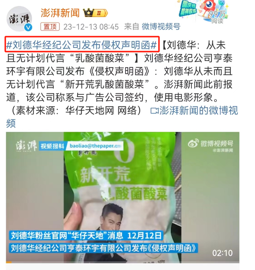 来源 | 顶尖广告 01 上一次看到酸菜上热搜,还是315被曝脚踩酸菜,那叫一个酸爽。 这一次看到酸菜上热搜,是天王刘德华代言酸菜,那叫一个炸裂。 最近网友反馈一款“新开荒乳酸菌酸菜”包装,竟然印着刘德华人物形象,甚至配了文案“电影《拆弹专家2》主演携手助力新开荒品牌”。 ![]() 图源:澎湃新闻 你让我怎么看?就像看到朴树参加小杨哥演唱会,有人发问是不是没钱,所以被迫接个商演。 ![]() ![]() 我以为的刘德华代言,可是遥遥领先。 但现在的刘德华代言,却是酸里酸气。 怎么刘德华接酸菜代言了?一顿吃瓜后发现,这事还真跟缺钱无关,而是缺德。 酸菜背后公司回应说,是与广告公司签约,属于电影,和本人没关系。刘德华经纪公司也出来辟谣否认刘德华代言酸菜。 ![]() 图源:新浪新闻 所以看到这儿大家也知道咋回事了,就是有人借天王的名气做虚假代言,涉嫌侵害刘德华肖像权、名誉权。 ![]() 哪怕没辟谣,也有网友迷惑,一个酸菜公司请刘德华代言,真的合适吗? ![]() ![]() 不过说起来,刘德华接“奇奇怪怪的代言”接到手软了。 据传仅仅2023这一年,刘德华被单方面代言84次:包括衣服、手机,麻将机、减肥药、楼盘、地锅鸡店、私房菜等,都是“没名气的杂牌”,所以经纪公司也忙着发声明函辟谣虚假代言。 ![]() 图源:微博网友 刘天王这事,让我想起更炸裂的AI换脸侵犯明星肖像权现象,就看不久前一个AI换脸热搜: 刘诗诗、刘宇宁主演的《一念关山》开播后,男主刘宇宁就一直困在颜值争议里,被嘲“年度最丑古偶男主”,甚至还有网友居然通过AI脸整活儿,将刘宇宁换成自己心中的“古装男神”,比如霍建华、胡歌、焦恩俊等。 ![]() ![]() 不得不说,盗用明星肖像权打虚假广告、AI换脸侵犯明星肖像权的现象,真是越来越普遍。 02 回到刘德华代言酸菜话题上,首先咱不是歧视酸菜这个品类,也不是说高人气明星,就不能接边角料品类、平民牌子。 哪怕是接了不少大牌、高奢的天仙刘亦菲,一旦下凡也很丝滑,接美团外卖被夸亲和力、很接地气。 ![]() 图源:@江南春 但涉及到明星代言和明星带货,大家都看重一个契合度。 无论是品牌和明星,背后都站着一群粉丝、消费者。如果因为代言太违和翻车,粉丝也会用脚投票。 可以想象刘德华代言酸菜,第一反应是太违和。 细数刘德华所接的品牌代言,包括海飞丝、奥迪、华为等,品牌商看中的显然是其国民度、实力、精神等,对于刘德华来说,接这些代言也符合自身咖位的定位。 刘德华代言华为手机,一个是内娱影圈顶流,一个是手机顶流,两者牵手堪称是“任正非凡”的王炸。 ![]() 图源:华为手机官微 又比如当时奥迪官宣刘德华刷屏全网,虽然陷入抄袭门风波,但必须承认两者确实很配,都是“进取派”和“长期主义者”。 ![]() 图源:奥迪官微 现在被告知酸菜公司找刘德华代言,多少有点颠覆我们对于刘德华过往代言品牌的认知。 虽然酸菜也配有光环,不然太二也不会宣传酸菜比鱼还好吃,但酸菜品类作为低关注度品类,有没有必要拉上顶流明星做宣传? ![]() 有必要必要是一方面,选代言不到位是另一方面,品牌/明星翻车就猝不及防。 劳斯莱斯、北京汽车先后找网红“晚晚”站台这事,都遭到了车主、网友的疯狂吐槽,表示拉低了品牌的档次。 ![]() 图源:劳斯莱斯官微 古力娜扎被曝接游戏代言接到手软,有的广告整出“美女荷官,在线发牌”缅北风,被评价乱接代言是明星不爱惜羽毛。 ![]() 按理说,明星和品牌合作是两方的事情,恰饭也不寒碜。但要是代言和品牌格格不入、没有cp感,用户觉得明星或者品牌掉价。 所以有时候提高明星、品牌形象这事费时间,但掉价只要一瞬间。 03 说起来像刘德华被当工具人,被虚假代言坑惨的现象,早就屡见不鲜。 被禁言的杨颖,今年6月曾经把一家卓护医疗的给告了,因为对方公司在增加产品包装及品牌手提袋上用上了杨颖照片,还写上“电影《建党伟业》主演杨颖助力卓护品牌推广”。 ![]() 图源:中新经纬 杨颖为了维权证明自身商业代言价值,曝光自己与丸美生2年的广告代言合同,服务费高达2400万元。 ![]() 图源:中新经纬 这也暴露出品牌邀请明星代言当真烧钱,动辄成百上千万。因此对于商家来说,与其砸钱合作,倒不如盗用肖像权做擦边球代言,主打一个花最少的钱,收割最顶的流量。 这些商家用一个个炸裂广告的告诉你,盗用用得好,打广告、做直播没烦恼。 侵犯明星肖像权的现象,不仅是存在于广告当中,还活跃在ai换脸技术中。 除了开篇提到的刘宇宁被换脸事件,把时间拉到今年5月,女装品牌SDEER、八马茶叶就被曝直播间主播通过AI换脸,换上“杨幂脸”、“迪丽热巴脸”直播卖货,这样的换脸全套模型价格为3.5万。 ![]() ![]() 最尴尬的不是商家把“明星照”用在广告、直播方面,而是用在不可描述的特殊服务上。 比如早些年就出现的这则日本街头广告,搬来了某幂照片,它会告诉你只需要花2500円日元(相当于人民币157元),就可以享受某幂为你全身按摩30分钟。 ![]() 图源:世界知识局 还可能在某按摩店门口,看到某甜的甜美照。 ![]() 图源:世界知识局 如果说特殊服务业是盗用女明星照片的主场,那莆田男科就是盗用男明星照片的主阵地。 ![]() 图源:世界知识局 千万别低估商家,不仅盯上明星肖像,还拿明星名字玩梗,一个比一个野。 莫文蔚自己都想不多,自己的名字会被四舍五入