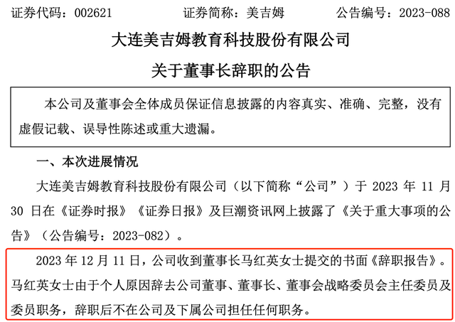 来源:侃见财经 A股“早教第一股”,深处漩涡之中。 近日,“早教第一股”美吉姆(002621)突然被推上了“风口浪尖”,关于“董事长跑路”、“大规模关店”、“家长维权”等消息持续发酵,引发热议。据最新公告显示,董事长马红英已辞职。 ![]() 值得注意的是,马红英出自“中植系”,曾就职德勤华永会计师事务所有限公司,中国免税品(集团)有限责任公司,中植企业集团有限公司。在其辞职之前,美吉姆爆发了一场内斗大战,双方分别是资本方“中植系”、公司创始团队。 内斗的同时,美吉姆的经营也正在陷入困境。据财报显示,2020年至今年三季度,美吉姆累计亏损达12.7亿元。对于业绩下滑、巨亏的原因,美吉姆表示,受美吉姆各中心阶段性、永久性闭店影响。截至2023年三季度末,美吉姆签约的早教中心数量较去年同期净减少了149家。 董事长突然辞职 据美吉姆发布的最新公告,公司董事长马红英女士已于近日辞职,辞职后不在公司及下属公司担任任何职务。对于辞职原因,公告中只提到“个人原因”。 ![]() 这则公告披露前夕,关于“马红英跑路”的消息闹得沸沸扬扬。 11月29日,美吉姆公告称,公司通过电话、微信等方式,均无法与马红英取得联系。与马红英家人沟通,尚不确定无法与其取得联系的具体原因。 随后,网络上出现了大量关于“董事长失联”、“美吉姆宣布破产”、“美吉姆总部已跑路”的消息。 面对凶猛的舆论危机,11月30日,美吉姆国际早教官微紧急发布“致关注美吉姆的社会各界人士的一封信”,信中表示,目前美吉姆各职能部门稳定履职,各个条线工作正常运转,美吉姆总部仍将致力于为会员家庭提供持续升级的课程和优质服务,为各家美吉姆中心提供全方位的支持。 12月8日,美吉姆再次紧急发布声明,谴责目前网络上的虚假言论,也表明了目前美吉姆运营稳定的信念。 美吉姆似乎有意想要打消大众的疑虑,试图挽救口碑形象。 截至12月15日收盘,美吉姆股价报3.37元,年内累计跌幅达22%,相较于2022年3月高点,累计跌幅更是达到63%,最新总市值缩水至27.7亿元。 据公开资料,美吉姆(MyGym)早教品牌诞生于美国,2008年,曾在IBM、HP等公司工作的刘俊君,取得了美吉姆品牌在中国的授权,成为美吉姆在中国的主加盟商,并于2010年起在北京、上海、广州等城市陆续成立美吉姆早教中心。 高峰时期,美吉姆一度在全国开了548家门店。2018年,美吉姆登陆A股,成为“早教第一股”,一度名声大噪。 “中植系”浮现 值得注意的是,随着马红英的突然辞职,美吉姆背后的“中植系”逐渐浮出水面。 据悉,马红英曾在中植企业集团有限公司任职,2021年12月,“中植系”掌门人解直锟去世,马红英的名字还出现在其“治丧委员会”名单中。 就在前不久,“平安北京朝阳”发布《情况通报》称:“近期,北京市公安局朝阳分局依法对‘中植系’所属财富公司涉嫌违法犯罪立案侦查,对解某某等多名犯罪嫌疑人采取刑事强制措施。” 而就在马红英失联、辞职前夕,美吉姆一度爆发了一场激烈的内斗大战。 大战的一方为马红英背后的“中植系”,另一方则是以刘俊君、王沈北等人为首的创始成员,双方的持股比例分别是30.18%、7.01%。 “中植系”向股东大会提案,调整刘俊君第六届董事会董事等职务,并提议提名金辉为独立董事。随后,刘俊君立即“反击”,提交了一份调整马红英董事职务的临时提案。 最终在11月16日的股东大会上,有关刘俊君职务调整的提案通过,而马红英职务调整的提案未通过。 12月3日,美吉姆宣布,解聘刘俊君的总经理职务,解聘后,刘俊君先生不再担任公司任何职务。同时聘任金辉为总经理。 就此,创始人刘俊君被踢出局,“中植系”获得阶段性胜利。 据公告显示,刘俊君持有美吉姆1648.65万股,占公司股份总数的 2.01%。 如今,美吉姆董事长之职仍悬而未决,新上任的总经理、副总经理均出自“中植系”。 巨亏、关店 内斗的同时,美吉姆的经营也正在陷入困境。 据最新披露的财报显示,今年前三季度,美吉姆实现营收1亿元,同比减少21.4%,净利润巨亏1.53亿元,亏损同比扩大91.2%。其中,第三季度营收约2886万元,同比减少31.8%。 拉长周期来看,2020至2022年期间,美吉姆累计亏损金额高达11.16亿元。 对于业绩下滑、巨亏的原因,美吉姆表示,受美吉姆各中心阶段性、永久性闭店影响。 据官方数据,截至2023年三季度末,美吉姆签约的早教中心数量较去年同期净减少了149家。 据2023年半年报,截至2023年上半年,美吉姆在全国拥有407家美吉姆与小吉姆签约早教中心,而2022年年底是479家。 业绩巨亏,大量门店倒闭之下,美吉姆频频曝出维权事件。 据一位杭州东站万象汇美吉姆店顾客反应,目前门店已经关门歇业,还剩3.5万的托班课时费,当前的状态是,门店关了、找不到老板,自己打过消协电话和报警,暂无回应。 ![]() 实际上,近期广州、上海、杭州等多地出现了美吉姆闭店后消费者维权的现象。对此,美吉姆似乎一直未给出明确解决方案。 在社交平台上,大量消费者反映,退费困难、强制转课、联系不到门店负责人等情况。有数据显示,在黑猫投诉平台上,与美吉姆相关的投诉累计达1100宗。 今年7月,马红英曾表示:“市场经济的事就让市场经济来解决,这对所有的投资人来说都是生意。” 美吉姆的经营模式为加盟为主、直营为辅,主要收入来自于向加盟商收取的特许经营授权费、权益金、 