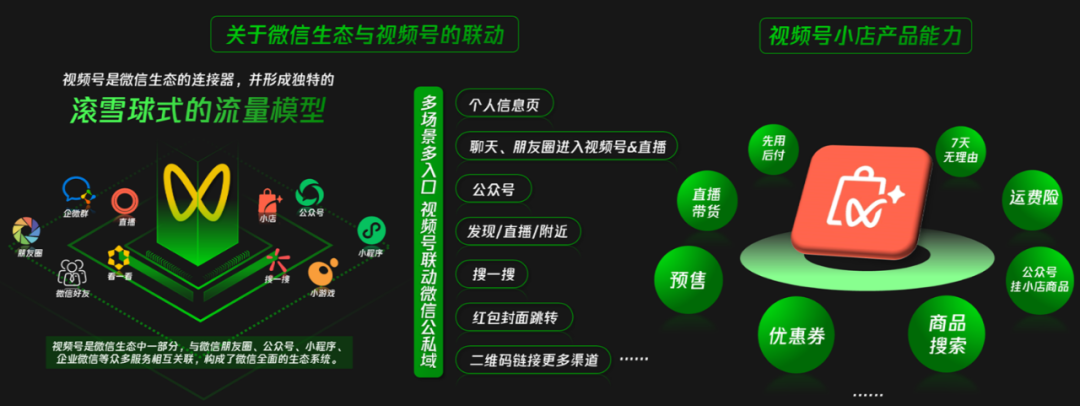 ![]() 在这个营销矩阵中,以视频号短视频或者直播为例,用户的典型场景基本上是这样的: 1️⃣用户打开微信,通过发现页,从搜一搜、问一问、看一看、听一听、视频号这几个公域入口,消费自己在公众号和视频号上感兴趣的内容。他可能会把自己喜欢的内容,通过分享转发到私聊、群聊、朋友圈这样的私域场景; 而且即使没有主动的分享转发,他的点赞、收藏、在看,也都会通过视频号和公众号的社交曝光展示体现给他的社交圈子,例如“有x个朋友在看”、“你的朋友喜欢了xxx”。 2️⃣用户打开微信,看到了社交圈内的朋友在私聊、群聊、朋友圈分享的内容,点击进入公众号或者视频号观看,也就同时进入了公域平台,有极大概率再次观看同类内容,也会同类内容在社交圈内(私域场景)的二次传播。 不难发现,公众号和视频号,本身是内容的载体,也承担着链接公私域场景的作用。 目前公众号依然是在公域中最重要的、链接一切的组件;而视频号和公众号的互相绑定,也让视频号起着越来越重要的链接作用。 微信的营销生态里,公域和私域的关系是非常特别的: 1️⃣公域流量入口不单一。 相较于抖音快手小红书,首页信息流是公域流量的最重要、单一来源; 而在微信生态下,公域的流量来源多元,尤其是微信的发现页有多个重要的公域入口,能源源不断地输送流量,并且可以和其他众多服务能够建立关联。 2️⃣微信的私域场景最全面、最具价值。 微信私域是沉淀用户、循环流量、做好服务、增强信任的重要的场景。 某种程度上可以说只有在微信,才算是真正有私域。 微信的私域能为视频号沉淀出一个有更高粉丝质量的“鱼塘”。 私域用户的经营沉淀、信任加成,能让视频号有更好的转化率、更强的粘性,在视频号电商中的人均停留时长、变现客单价、退货率等等数据都会有所体现,是视频号区别于其他平台的竞争优势。 粗略总结:以用户社交为中心的微信营销生态,通过公私域场景下的互联互通、价值沉淀,极大地推动了视频号在2023年的崛起。 ![]() 视频号的直播电商,做出了怎样的差异化? 说完微信整体的营销生态,最终还是要落脚到视频号直播电商这个板块上。 视频号做直播电商,究竟有哪些差异化特点?而这些特点又是怎么让视频号直播电商发展起来的? 我的观察是: 1️⃣去中心化的产品观: 视频号整个团队的产品观,一直都秉持着张小龙的产品理念,不希望营造高度内卷的饱和竞争生态,而是希望打造出万物生长、去中心化的生态。 视频号团队的愿景是,希望通过极致去中心化、极致利他,来繁荣整个平台的商业化环境。 具体而言,视频号不希望鼓励和扶植绝对头部,而是希望各个垂类的生态都能够被培养起来,这也是微信平台的天然底色,和抖音有天然区别。 这在2023年视频号直播带货榜单中也有所体现,618、双十一、双十二榜单中,带货达人和品牌的格局每次都有明显变化,能感知到平台对新玩家入场的开放态度,也是因为整个平台的发展都处于很早期的阶段,格局还没有固化,依然有很大的发展空间。 2️⃣平台的反卷机制: 在整个平台去中心化的产品观的驱动下,视频号具体是如何反内卷的呢? 首先,数据保护上,视频号刻意保护了很多竞争维度的数据,电商数据很难抓取,第三方平台抓取数据的难度非常高; 没有一个透明、公开的数据广场,能实时看到大盘现在整体卖得好的直播间、商品、达人,官方虽然出了达人广场,但是数据颗粒度很大,几乎没有参考价值。 内容导向上,视频号并不提倡快节奏、喊麦式、冲动情绪类的直播,更希望引导主播对用户真诚,通过讲清楚商品的核心价值和卖点,来引导用户理性消费; 视频号对卖点宣传的态度非常严谨,直播口播卖点、参数一旦和商品资质里的卖点、参数不一致,都有可能遭到违规处罚。 流量分发上,最大的特点是扁平化、强社交、强关注。 首先是扁平化逻辑,即使是头部直播间,也不会抢走绝大多数的自然流量,流量的分配不会出现马太效应;尤其是在视频号很难看到场观特别高的直播间,绝大多数场观都在10万左右,极个别的头部直播场观也基本在50万以内; 对中小体量的直播间是有好处的,至少确保每个直播间都能分配到一定程度的流量。 其次是社交逻辑、关注逻辑很强。 不是视频号不做推荐算法、赛马机制、付费投放,而是视频号天生没有这个基因,视频号团队对商业化的探索又非常克制,目前它对算法、推荐、付费流量的调教能力,都与抖音相差甚远; 所以在视频号,流量逻辑更多的依然是社交逻辑、关注逻辑。 ![]() 这也是为什么,在视频号做直播,一定要做好人设,做出自己的IP。 因为用户非常认人,只有让用户喜欢你的内容,喜欢你的人、信任你的人,用户才愿意经常看你的直播,买你的东西。 3️⃣“三高一低”的特性 在上面这些差异化特点的基础上,视频号的直播,一旦做好了公私域联动,解决了流量问题,又做好了高认同度的人设,用信任和粘性加持转化,视频号的直播电商就会呈现出三高一低的特点。 三高:高客单、高复购、高黏性; 一低:退款退货率更低,确收率更高; 这就是视频号鲜明的社交属性带来的差异化的红利,对商家而言,最直接的好处就是更能控制住成本,更能留下利润,这也是为什么很多商家愿意留在视频号,在视频号拿到了结果的原因。 视频号直播电商的成功法则 视频号直播