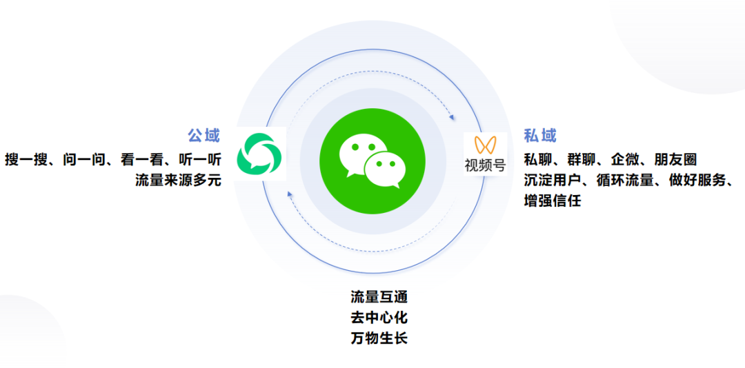 视频号为什么在2023年创造了红利?它的红利来源于何处? 如果让我自己站在平台整体视角,做一个(相对抽象的)解释的话,我的理解是: 微信作为一个体量巨大的社交平台,沉淀了巨大的用户注意力(日活&使用时长),构建了高价值的用户关系,而视频号本身在整个微信生态营销场景中,作为一个视频组件,通过满足用户的内容、社交、电商的需求,创造了商业价值。 通俗点的理解就是,用户在微信上,虽然不是为了来买东西、看广告的,但是微信一方面掌握了用户们巨大的注意力,让自己能把自己的广告、直播推出去;另一方面,微信上的社交关系,能让用户愿意相信自己朋友、自己熟人的推荐,能让用户相信一个为他推荐商品的主播,因为信任而产生成交。 2022年以前,视频号不做电商,但不代表视频号的用户没有电商购物的需求; 2022开始探索电商、直播的商业化之后,尽管磕磕绊绊、佛系运营,但依然拿到了不小的结果。 同时要理解视频号取得的成绩,理解在视频号的玩法,就必须理解视频号在整个微信生态下的定位: ——视频号是整个微信生态营销场景中的一个重要的“视频组件”。 微信生态营销场景,大致构成了一个这样的公私域矩阵: