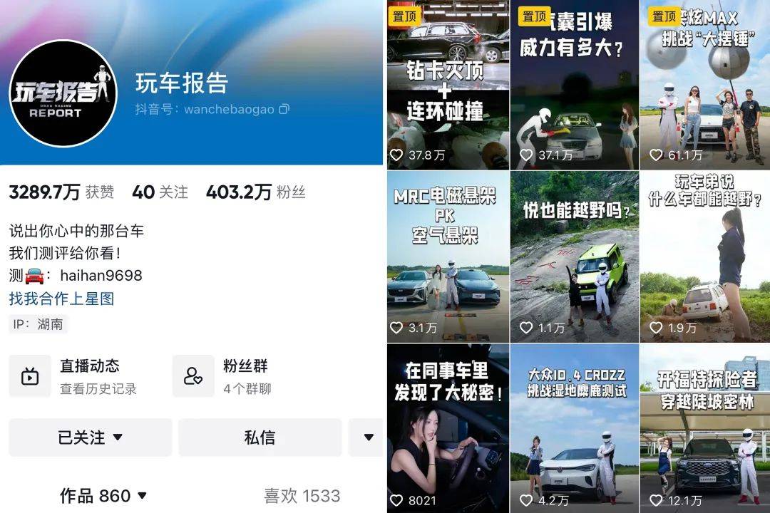 来源:卡思数据 在抖音,做专业的汽车内容还有出路吗? 从去年开始,卡思数据就观测到众多汽车头部账号不约而同地开启了内容上的跨圈转型之路,比如我们熟知的@猴哥说车、@虎哥说车、@八戒说车等,都纷纷在自己的账号中加入了大量美食探店、生活vlog、和其他达人联动等与汽车相关性不大的内容。 ![]() “不务正业”的背后,透露着诸多“无奈”。 近一两年来,在抖音月度涨粉榜上,汽车账号的身影越来越少,不少头部大V纷纷进入涨粉瓶颈期;另一方面,严肃的说车内容时间成本、内容成本都相对更高,且很难在短内容中充分展现,增粉效率也相对较低。与之相对应的,由于大部分汽车账号是通过广告变现,而受市场情况影响,众多汽车厂商纷纷在短内容上缩减投放预算,这也使得汽车账号在陷入涨粉困境的同时,又陷入了变现困境。 双重困境下,转型、跨圈、拓宽内容边界、覆盖流量池中的更多用户,也就成为众多汽车账号的无奈之举。 然而,在这种局面之下,我们仍能在抖音上看到一些聚焦于专业汽车内容的账号,凭借着过硬的专业性同时收获众多用户和品牌主的青睐,比如参加了第二期“增长引擎·创始人增长战略班”的黄海涵便一手打造出了这样一个账号——@玩车报告。 据了解,从入局到现在,@玩车报告 在抖音共吸引了403W粉丝关注,全网粉丝量突破800W,节目播放量突破30亿,且在疫情的3年里,公司规模实现了100%扩张。 ![]() @玩车报告 为何能在一众跨圈的汽车账号中杀出重围?在抖音,专注做专业内容还有机会吗?在账号打造上,黄海涵还有哪些经验可以分享?带着这些问题,我们和黄海涵聊了聊@玩车报告背后的创作思路。 以内容为出发点,打造强专业性质的汽车账号 硬核的专业测评体系、脑洞大开的测评创意、极具视觉冲击的画面质感或许是@玩车报告 带给用户最直观的几个感受。 据卡思观测,@玩车报告 在抖音发布的视频作品包含了“极限测评”“大事件”“原创试驾”“情怀老车”等多个板块,在这之中,以“极限测评”和“大事件”两个内容系列最为突出。 具体来看,极限测评和大事件,会由专业团队在机场赛道或专业越野场地实景拍摄,通过玩车报告科技+硬核的测评体系,针对车型进行不同的极限测评内容,由此精准而清晰地呈现出每辆车的独特性能,比如极限测油耗、不达标就烧车,用车尾撞击测试来验证高速追尾的严重性,做撞毁测评来看日系车和德系车谁更耐装等;打造出兼具曝光度和话题度的创意级大事件,最终实现广泛传播和深度种草。 ![]() 不同内容板块下发布的一系列作品,均强调专业、真实,能带给用户可靠且有意义的参考。与此同时,在其发布的视频中,我们会看到两个形象鲜明的固定IP人物,一位是身穿白色赛车服、头戴深色面罩赛车头盔且车技过人、拥有丰富汽车专业知识的神秘人“玩车弟”,另一位则是活泼靓丽、擅长烘托气氛,且有胆量和玩车弟一起参与各种极限测评的“玩车妹”小橙,两个人一冷一热,密切配合,一起带领用户见证着每一次极限测评,在专业性之余,又补足了视频的趣味性、加深了用户的记忆点, ![]() 深耕汽车垂直内容是黄海涵在2019年转行踏入汽车赛道时便有的认知。“汽车垂类账号不仅要看粉丝有多少,还要看能存活多久,所以我一开始对整个团队的定位就非常清晰,那就是要深耕汽车垂类、不完全以商业为导向,打造一个以内容为核心基因的团队,然后产出专业且优质的汽车内容。”@玩车报告就是在这样的规划之下应用而生。由于内容的稀缺性和专业性,账号很快在抖音上迎来了快速增长,并收获了多方认可。 一方面,账号粉丝量不断增长,且据黄海涵透露,@玩车报告 的粉丝主力军以男性为主,占比95.36%,最具购车潜力的年轻人(18-30岁)占比高达71.36%,广东、北京、上海是粉丝核心聚集地,同时山东、江苏、河南、浙江等经济发达、人口基数大的地区粉丝覆盖率也相对更高,整体来看,出于内容的专业度,账号吸引的粉丝也更精准,也更具有商业价值。 ![]() 与之相对应,作品的各项数据表现也非常可观,且经常会有“轰动型”视频诞生。比如2022年11月28日,@玩车报告发布的沃尔沃XC90“车祸复刻”行动,通过实景拍摄深度还原了火车削顶+连环追尾、侧翻压顶两大严重事故场景,紧张的氛围和真实的画面不仅能让用户有身临其境的代入感,汽车的性能也在这样的“死亡”测验中得到了验证。这条视频累积播放量达到5500W+,其中钻卡削顶碰撞测试在抖音的播放量超过1250W,点赞量则达到了37W。 ![]() 而作为深耕汽车垂类的专业账号,@玩车报告 还收获了抖音之外的更多认可。比如2021年@玩车报告登上了懂车帝年度综合影响力榜TOP1、成为今日头条百大人气作者;更是荣获了短视频领域的最高荣誉金秒奖。2022年,@玩车报告 再次登上了懂车帝年度综合影响力榜TOP2,并成为今日头条的年度顶流作者。在以专业为主导的创作之路上,@玩车报告 备受用户和平台肯定。 “内容迭代是每个账号都要面临的问题” 尽管凭借着专业优势一步步地在竞争激烈的内容生态中扎下根来,但已经走到了第五个年头的@玩车报告 仍然不可避免地遇到了增长过程中的瓶颈。 “现在的内容行业越来越卷,竞争越来越激烈,要想在其中存活得更久,必须要进行转型迭代。那些汽车头部账号之所以转型、跨圈去做很多与汽车无关的内容,其实也是为了在