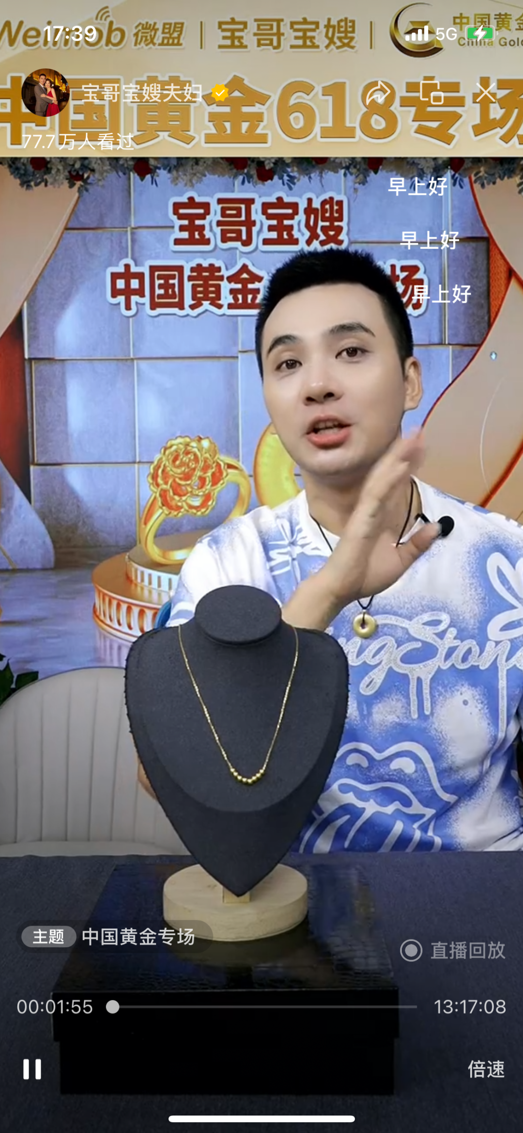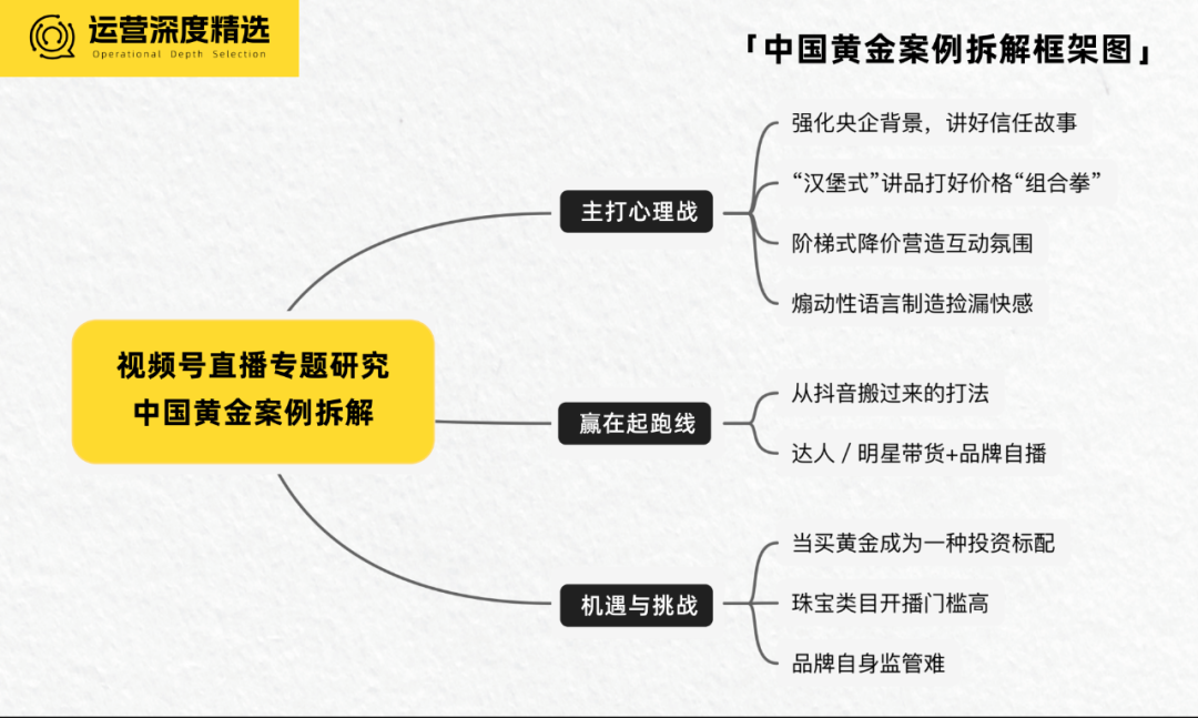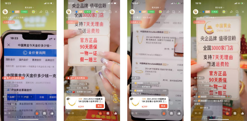 来源 | 剑锋 撰文 | 文清 编辑 | 少波 如果按对标头部品牌直播间的逻辑,在视频号珠宝类目中,不得不看的一个品牌就是中国黄金。在此前视频号 618 品牌带货榜单中,中国黄金长期霸占着珠宝类品牌带货榜单的 TOP1。 ![]() 在抖音 618 好物节上, 中国黄金也是珠宝类品牌带货榜单中的第一。事实上,2023 年以来,“中国黄金旗舰店直播间”一直稳坐黄金珠宝品牌抖音影响力排行榜榜首位置。而在快手 618 购物节十大类目热卖品牌榜中,中国黄金也在珠宝钟表类目中排名第二。 ![]() 在一个平台成为“一哥”或许有运气成分,但是在多个平台都能独占鳌头,就不单单是运气的原因了,这也是我们将它列为本期拆解对象的主要原因。乍看之下,中国黄金直播间吵闹的氛围与司空见惯的很多直播间并无二致,甚至在呼吁“慢直播”的当下,与董洁式直播形成了鲜明的反差,但仔细拆解下来,仍然有很多有价值的发现。 在进入正文拆解之前,先普及一下中国黄金的背景方便后续理解:作为有上游强大矿业实力支持的珠宝首饰央企,中国黄金一直被视为资本市场上的稀缺标的。营收规模已经由成立之初的千万级提升至 2022 年的近 500 亿。2023 年一季度,中国黄金也以出色的业绩实现开门红:净利润 3 亿元,同比增长 19.13%。2022年末,中国黄金旗下门店总数为 3642 家,其中自营门店有 105 家,加盟门店 3537 家。 今天这篇文章,我们将以霸榜的中国黄金视频号直播间的人货场打法拆解为切入点,进一步挖掘中国黄金在各大电商平台崛起的战略选择,同时,延伸探讨珠宝品类在视频号直播带货的机遇和挑战。 ![]() 01. 主打的就是心理战术 强化央企背景 讲好信任故事 一进入中国黄金视频号直播间,首先印入眼帘的除了主播、背景大 LOGO,就是显眼的KT板,上面赫然写着“央企品质,值得信赖“几个大字,然后是“全国 3000 家门店,支持 7 天无理由的退货”等信息。 ![]() 主播在开播后,除了介绍今天的福利,首先要重点强调的就是“我们是央企中国黄金指定的官方直播间”。在讲解的过程中,“央企”这个背景信息也被不断强化,比如:“只有中国黄金有金矿,我最后再说一遍;你们如果在央企待过的就知道,央企的流程真的很多。”强化央企背景,背后是为了破除消费者的疑虑,建立信任关系。有央企背书,消费者自然对品牌没有那么强的防备心。 “汉堡式”讲品打好价格“组合拳” 直播间在产品的选择上,采取的是低价和高价产品穿插讲解的方式,用 99-399 元左右的低价项链,甚至是反常识的超低价产品附加多个赠品引流,穿插介绍售卖价格更高的黄金手镯等产品,既满足了大部分进入直播间的消费者的需求,又给到他们更多的选择空间,也能够更好地刺激销售转化。 ![]() 黄金产品的选品和定价,其实非常讲究:单价低的产品虽然可以刺激消费者,但是长期会影响获利,单价高的商品盈利空间大,但销售转化也是一个问题。所以打好商品价格的“组合拳”就显得尤为重要,用符合消费者期待的低价产品引流,用高价商品保证盈利,就成为一个不错的讲品设计。 此外,低价款连着高价款再继续低价款的“汉堡式”讲品策略,用“低价引流——高价转化——低价再留存用户”的节奏,这感觉就像是电影里“交叉蒙太奇”效果,悬念一波接着一波,持续调动消费者的情绪,将一部分消费者尽可能长地留在直播间。 阶梯式降价营造互动氛围 选择在直播间购物,不少用户的出发点是想淘到性价比更高的产品, 比如看到一款标价 3999 元的金手镯,你可能会觉得贵,不想买。但是如果看到原价 5999 元,现在只要 3999 元时,会不会瞬间觉得物超所值,觉得买了就等于省了 2000 元?而中国黄金直播间“阶梯式”降价策略更是将这种“物超所值”的感觉推到一个新的高度。 “现在点关注的新朋友,我们继续降价 1000 元,3999 元;如果你能点亮我们直播间的粉丝灯牌,我继续降 1000 元, 现在 2999 元,要不要?要的直接扣要,我看看有多少位姐姐要。”一次又一次的拉开与产品锚定价格的差距,消费者的心墙就像被一波又一波的浪花冲击着,这力量自然比一下子给出最低价格更强。 另外,这种互动感还能给新进入直播间的消费者一种直播间确实很热闹的感觉。尽管这种套路式降价在年轻人中已经被免疫,但对于直播带货“涉世未深”的中老年来说,仍屡试不爽。 煽动性语言制造捡漏快感 与主打珍珠品类的珠宝直播间娓娓道来产品故事,让消费者在强化认知中下单不同的是,中国黄金直播间更偏向通过煽动性的语言制造捡漏快感,这大概是因为黄金价格相对比较透明的原因。黄金以克论价值的理念已经深入一部分消费者的内心,这意味着,在产品特点的讲解上,主播可发挥的空间相对比较小。 ![]() 总结下来,中国黄金直播间语言话术设计可以拆分为四个节奏: 首先圈定福利人群。比如:今天是针对新粉的福利,新人才可以享受新人福利; 其次说明产品超值。比如:原来一件是 399 元,我们现在三件只要 399 元,有手链、项链、金珠; 紧接着告诉大家库存有限,已经有很多人下单了。比如:有个姐姐买了 13 条,倒计时三秒,我们要下链接了; 最后承诺正品保障。比如:都有国检证书,正品礼盒,支持线下验货。 煽动性语言结合卡库存营造的秒杀压迫感以及支持复检的承诺,一连串的操作下来,捡漏的氛围感拉满。 02. 赢在起跑线上 拆解完中国黄金直播间的打