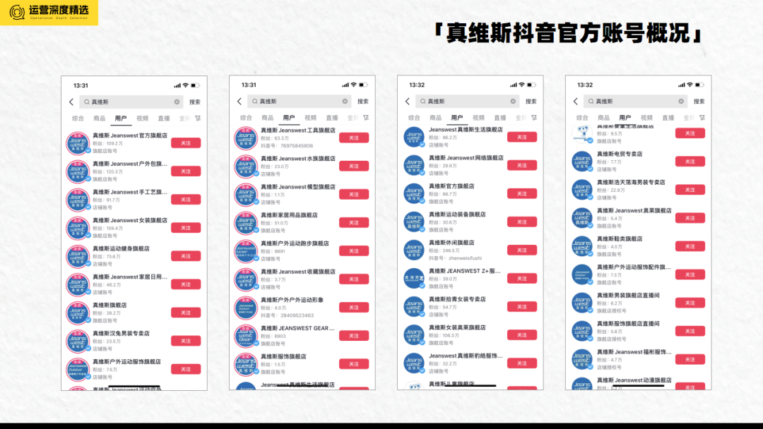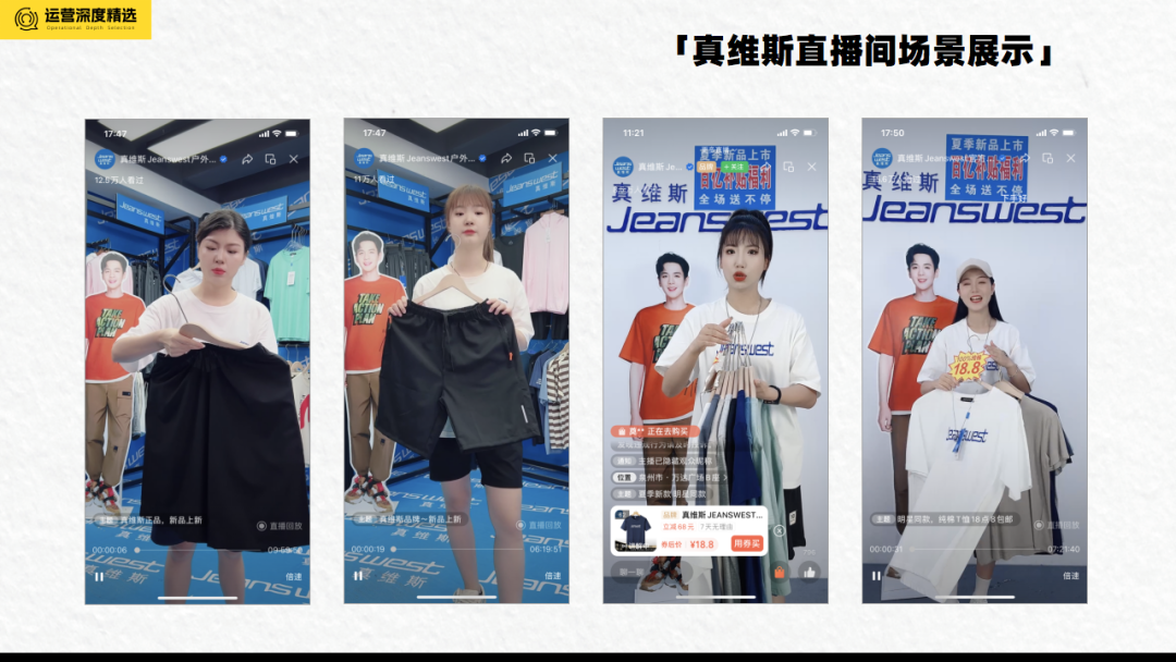 来源 | 鉴锋 撰文 | 文清 编辑 | 少波 初代潮牌、80/90后的时尚印象、牛仔裤之王。这三个词,让你想到了哪个服装品牌? 答案对一些人来说,再明显不过了,它就是真维斯。 曾经穿着真维斯的人们长大了,开始追明星同款,看博主带货,发现衣服可以有如此多元的风格选择。在一波又一波的时尚浪潮中,真维斯也难逃被时代遗忘的命运:如今在各大商场中,已经很难看到它的身影。 属于80/90后的青春记忆可能是一去不复返了,但在中老年人聚集的视频号直播间,真维斯却在刚刚结束的618大促中,凭借着惊人的冲榜速度,火了一把:在6月2日的视频号品牌带货榜单中,真维斯还排在第11位,但是在6月18日的品牌带货榜单中,真维斯已经冲到了第2位,热度甚至超过了一度在带货榜单上霸榜的影儿集团。 ![]() 抛开冲榜速度,真维斯这两年的业绩表现,其实也可圈可点:2020年销量同比增长50%,2021年同比增长80%,2022年同比增长110%。今年第一季度,在去年高速增长基础上实现100%的增长率。 数据表明,销售占比超八成以上的电商板块已成为支撑真维斯得以前行的新引擎:在2020、2021年电商板块分别增速为50%及85%,真维斯销售额从2020年不到13亿元,到2021年销售额恢复至15亿元,2022年真维斯线上销售额超20亿元。 具体到此次618大促的销售表现,也超出了预期。惠州真维斯电贸分公司总经理刘伟文在大促结束前的采访中提到,真维斯618大促原目标是3亿元,但按增长率来看,预期能完成3.6亿元。截至6月14日,真维斯已经完成2.6亿元。虽然视频号直播间为此次大促贡献的GMV没有具体提及,但我们仍然可以在直播间看到一个老品牌翻红的迹象。 新旧交替是时代进步的注脚,对于老鞋服品牌来说,如何在日新月异的市场变化中不被“抛弃”,或许从真维斯,我们可以找到一些启发。我们将从真维斯品牌调研、 视频号直播间拆解、以及转型战略以及翻红方法论四个方面展开论述。你将获得以下的信息: 1、真维斯布局直播的背景信息; 2、真维斯视频号直播间打法和策略; 3、在直播间之外,真维斯做了什么? 4、老品牌翻红,靠的是什么? 01.被遗忘的真维斯选择“不躺平” 2020年,真维斯澳大利亚公司宣布开始破产清算,让人们恍然惊觉,原来真维斯还在。 虽然真维斯国际(香港)有限公司董事长杨勋一直在采访中强调澳洲真维斯和中国真维斯分属于不同的子公司,彼此独立运营,但也难难掩其被市场逐渐遗忘的事实。 彼时,媒体对于真维斯报道,悲观情绪是主旋律,从《再见了!真维斯》、《真维斯被时代丢下了车》、《真维斯,你是怎么把一手好牌打得稀烂的?》等一系列报道中,我们可以看到,一个老牌服装品牌的沉浮记。 老生常谈的真维斯往事,我们就不再赘述了。但有两个数据可以窥见真维斯的失落。鼎盛时期的真维斯,也就是在2013年的时候,真维斯在中国内地近3000家门店,年销售额近50亿元。此后真维斯业绩不断下滑,接连亏损不止。2018 年上半年,真维斯的销售额只有7亿港元,并且在五年时间里,真维斯裁员6000多人、关店1300多家。 如果将真维斯的式微放在中国快时尚服装品牌的整个大背景下,我们不难理解,这是时代洪流下不可逆的趋势。其实不仅仅是真维斯,还有包括ZARA、H&M、GAP等在内的国际品牌以及以美特斯邦威、拉夏贝尔、艾格等为代表的国产品牌,都无一例外,经由巅峰期进入到下坡路,甚至跌落低谷 。比如前段时间,正式进入破产清算的拉夏贝尔,2017年上市,经营网点一度达到九千多家,随后就开始逐年亏损,2019年传出了“半年亏损5.65亿”的消息。 有意思的是:我们仍然可以看到一些品牌活跃在直播带货的第一线。可以说,电商,特别是直播电商渠道的发展,确实给了一些被市场抛弃的老品牌再次赢得曝光的机会,甚至不乏有借助直播电商再次翻红的案例,比如鸿星尔克。 曾被市场遗忘的真维斯,也选择了“不躺平”。 最近,70多岁的杨勋频繁出现在媒体的采访中,虽然头发已经花白,但作为真维斯的掌舵者,他还是试图通过自己的讲述,向大众传递一个不一样的真维斯,谈及最多的,是真维斯的改变和进步。他说:“如果不进步、不改变、那你就一定没有生命力。我们作为一个企业,一定要有这个意识,一定要改变,一定要进步。” 真维斯的改变就藏在惠州江北真维斯总部大楼的直播间里:人、衣、数“交织”的直播间,如火如荼的景象支撑起了真维斯抖音及视频号的常态化直播。2009年,真维斯组建电商板块,当时团队成员只有9人;如今,真维斯电贸公司已超过260人,另外配套的集团IT技术团队就有近5 02.直播间拆解 正如我们上述提到的,真维斯的改变就藏在直播间里,那么它在视频号直播间的打法和策略,都有哪些值得拆解的地方?我们选定了目前正在进行常态化直播的账号真维斯Jeanswest户外旗舰店、真维斯Jeanswest官方旗舰店作为观察对象进行拆解。 视频号布局情况 视频号直播账号矩阵: 真维斯在视频号上认证的账号包括:真维斯Jeanswest户外旗舰店、真维斯Jeanswest官方旗舰店、 真维斯旗舰店、 真维斯男装旗舰店、真维斯官方旗舰店、真维斯商城、JEANSWESTZ+新亿专卖店。 ![]() 值得一提的是,在抖音上,真维斯建立了100多个账号矩阵,粉丝最多的账号高达159万人。据悉,2021年初真维斯才开始运作抖音,目前已经占到电商销售总额的20%左右。当时有一款牛仔裤,在传统电商平台上计划能够销售2000-3000条,但利用抖