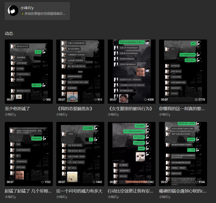 作者|花花小萌主 你有过这样的经历吗?为了把事情说清楚,直接截图聊天记录或者合并转发聊天记录给朋友?或者说,看到别人发给你的聊天记录,一定仔仔细细看清楚上面的对话?聊天记录本是扁平化的存在,但现在有人把它做成了视频。 视频号博主@小味吖y通过晒聊天记录频出爆款,在7月感情榜中占据榜首位置,据数据统计,其在七月共发布了222个作品,作品累计推荐561.33w,获得评论7.06w,转发75.51w,其中有20个作品推荐数达10w+。 情感赛道原本就是视频号的热门赛道,如今,聊天记录引发共鸣,成为视频号新的流量密码。 与其他情感博主不同,没有余音缭绕的嗓音娓娓道来情感的波折,也没有抓人眼球的视觉呈现情感冲突,甚至没有任何视频制作的技巧,简简单单7秒的时间,让人看清一个主题对话,然后在评论区炸锅。那么,这里面到底藏着什么流量秘密呢? ![]() 社交八卦的废话文学 在@小味吖y的聊天视频里,我们会发现并没有多么深奥的理论,就像是平常的小情侣之间的一些有趣互动,或者称之为情感废话文学。 朱自清在《论废话》中曾经说过:得有点废话,我们的生活才有意思。而心理学家研究发现,一个人说的话,如果90%都是废话,那么说明他是比较快乐的,如果说废话不到50%啊,那么他的快乐指数就比较低。 可见,无论是说废话还是看废话,都能给人带来快乐,一个能带给用户快乐的7秒视频,为什么要拒绝呢? 为什么情感废话文学会受欢迎,除了快乐因素之外,还有2个原因: 1.大众对情感需求的升级,没有负担的轻社交。 随着经济水平的不断提升,情感需求得到满足成了目前最大的矛盾,一方面大家对情感社交有渴望,一方面又不想过多的社交,于是,看别人社交成为了越来越多的选择,从别人的情感里满足需求,慢慢成为了一种替代品。 人的情感需求可以分为三个阶段,一是确定性和重要性,代表着人的底层安全感,怎样才让人觉得最安全呢?佛学说,“由爱故生忧,由爱故生怖,若离于爱者,无忧亦无怖。”于是,旁观“爱”这个情感,成为了人们的选择。 二是成长和不确定性,很容易只追求自我成长,而忽略了身边的人,沉浸在自己的世界中,@小味吖y的视频就抓住了这些矛盾点,利用聊天记录的形式发布出来。 三是爱与链接和贡献,把自己的成长赋能给他人,我们可以看到,在@小味吖y视频里,都是充满了理解和贡献的,才不至于让人看了之后越看越生气。 ![]() 2.基于好奇心和凝聚力的大众八卦需求 蔡康永说:八卦本来就是人生的一部分,关键是水准。尽管很多人否认自己的八卦,但不可否认,只要你还在说废话,你就会成为八卦的一份子,哪怕只是个吃瓜群众。关乎大众为什么喜欢八卦,罗宾·邓巴所著的大众科学的神作《梳毛 八卦及语言的进化》中给出了答案,他认为,语言的进化就是为了八卦。 书中提到,首先,八卦起源于猩猩梳毛。梳毛是灵长类动物的典型社交,能一起梳毛的才是靠得住的伙伴。每天花10-20%时间来一对一地梳毛,互惠互利结为联盟,让群体内部关系更稳定。 其次,语言进化是为了更好地聊八卦。随着社群规模越来越大,梳毛不能满足群体的需求了,怎么办?进化出语言,是理想高效“声音形式的梳毛”。所以聊八卦就成了更好的社交方式,从古至今、从动物到人类,一直如此。 最后,男女都爱八卦,重点不同。八卦不止是女人的天性,是所有人的天性。研究发现:女性聊天时三分之二的时间在八卦别人,三分之一聊自己,男性反之。 从中我们可以发现两点,一是八卦能够增强凝聚力,正如猩猩梳毛,互惠互利结成同盟,相当于视频号@小味吖y开设了一个视频社群,大家在观看视频的过程中,凝聚在一起; 二是社交的好奇心,人类与生俱来的好奇心, 早期现代心理学家威廉·詹姆斯将好奇心称为“促使更好认知的一种冲动”,英国曼彻斯特大学语言和交际发展讲师凯瑟琳·图米称,虽然确定一个定义是非常棘手的,但人们普遍认为这是一种收集信息的重要手段。好奇别人的情感对话,一方面出自社交需求,一方面出自对“怎么了”答案的收集。 因此,大众对情感的需求及八卦的需求,最终导致了情感废话文学的流量盛行。 ![]() 话题属性的多样化 我们来看一下@小味吖y视频的一些标题,或者称之为话题,话题是指人们在交流沟通中所涉及的主题或内容,是引发讨论、交流的核心点。 “至少他坦诚了”“我的恋爱脑男友”“女生眼里的被凶行为”“你懂我的这一刻真要碎了”……话题中都包含着网络情感热点。 在我看来,这些视频起码具备了4个属性: 一是反转属性,看上去很离谱,如有雷同,纯属虚构。例如一则视频中,双方问及谈了几个男朋友,男方回答2个,女方质疑明明有4个,男方回答,不是问谈了几个男朋友吗?谁说男人只能谈女朋友呢?反转来得猝不及防,让人莞尔一笑。 二是共鸣属性,情感共鸣能带来换位思考的力量,比如“女生眼里的被凶行为”既说到了女生心里去,也说到了男生心里去,共鸣一出,谁与争锋。 三是真实属性,对于普罗大众来说,聊天记录具有私密性,自然也就具备真实性,哪怕知道如今的聊天记录可以造假,但骨子里依然会更信赖聊天记录。 四是生活属性,情感是我们日常生活中不可或缺的元素,从生活中来到生活中去,若是视频里都是电视剧般的爱恨情仇,就缺少了地气,从生活的小细节中展开对话,才会让人甜得快乐。 ![]() 你的故事价值连城 其实凭借情感聊天记录