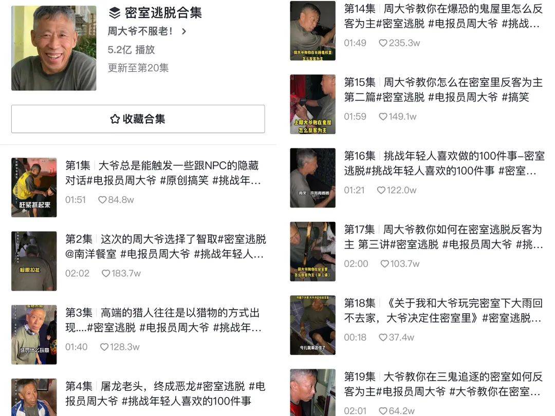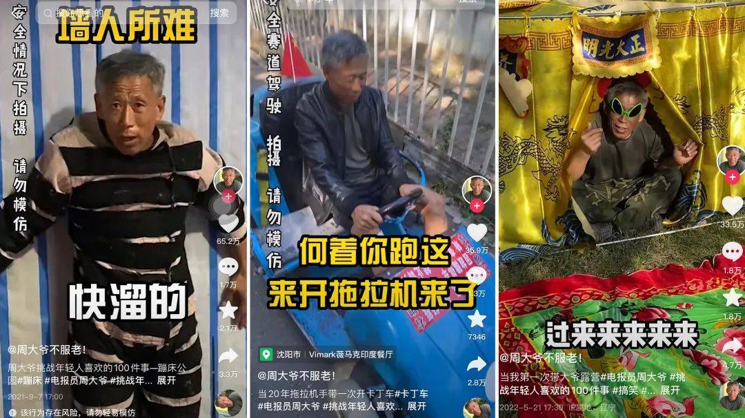 来源:卡思数据 7月抖音涨粉榜已出,我们一起来看榜: ![]() 从增粉情况来看,7月相比5、6月有了一定程度的滑落。排在榜首的账号增粉量为337.3W,是近段时间凭借参加《中国好声音》积聚了大量人气的“挑战型”达人@李炮儿;其后,增粉量在200W-300W之间的账号还有4个,分别是传承古法手艺的非遗创作者@山白、专注输出考研干货和高考相关知识的@张雪峰老师、展现乡村日常和美食的@王奶奶农村一家人、正能量打假网红@铁头惩恶扬善,余下账号的增粉量则都在100W-200W之间。 ![]() @王奶奶农村一家人@铁头惩恶扬善抖音视频截图 从上榜账号类型来看,共覆盖了剧情、美食、影视娱乐、音乐、户外、vlog、母婴、才艺技能等赛道,整体分布得较为平均,没有哪个类型占据绝对优势。 具体来看上榜账号,依然和前几个月的情形保持着一致,即除了首次亮相的新鲜面孔占据半壁江山外,从今年开始大放异彩的一些“半新鲜”账号也持续发力,比如@李炮儿、@东北雨姐、@湖远行、@瑶一瑶小肉包等,都属于此列。 ![]() @东北雨姐@湖远行 抖音视频截图 接下来,我们就对一些“新鲜面孔”进行更为细致的分析。 @周大爷不服老!:银发网红的“吸睛力”有多强 银发网红的吸睛实力依然不容小觑。本期涨粉榜上,位列涨粉榜第六位的@周大爷不服老!就是一位有着强劲吸粉实力的银发网红。 @周大爷不服老!,目前的抖音粉丝量已经突破了1200W。正如其账号名字所显示的那样,不服老的周大爷在视频中主打尝试各种年轻人喜欢的事物,反差感被狠狠拉满。 据观测,早在2020年6月中旬,@周大爷不服老 !就开始在抖音上发布作品,但早期的主人公并不是周大爷,而是着重介绍一个印度餐厅的菜品和环境。直到2020年9月15日,原本在后厨刷碗的周大爷因为服务员的突然离职而被迫上岗,干活利索的他专门为接待外国顾客学了几句英语,一句带着口音的welcome瞬间引爆流量,为账号引来了前所未有的关注。 命运的齿轮就此开始转动,一个月后,该账号正式成为大爷的主场,与之伴随的,是粉丝量的不断增长。 ![]() @周大爷不服老!抖音视频截图 具体来看,周大爷的“不服老之旅”主要分为两个部分,一是进行“怪味挑战”,即尝试吃各种他不熟悉的美食,比如鲱鱼罐头、生腌蟹、排毒芦荟汁等,然后记录下他“一言难尽”的爆笑反应; ![]() @周大爷不服老!抖音视频截图 另一个吸睛重头戏则是“挑战年轻人喜欢做的100件事”。截至目前,年近60的周大爷已经尝试了玩密室逃脱、做美甲、开卡丁车、蹦床、去电竞酒店、去女仆咖啡厅、去撸猪、学街舞、去露营等年轻人钟爱的一系列潮流活动。 ![]() @周大爷不服老!抖音视频截图 在镜头的记录之下,我们能看到周大爷与这些潮流活动相遇时碰撞出的独特火花,比如去了电竞酒店认真玩黄金矿工,去玩蹦床一只鞋子被卡住后,怒而离席说着“不要了”,去开卡丁车时先是声称自己有20年的开拖拉机经验,结果进去之后开的比走得还慢…… 一众挑战活动中,密室逃脱系列内容尤其受到用户的喜爱。在密室中行走的周大爷,不仅背着手,整出了在家遛弯的架势,丝毫不惧各路NPC,甚至还反客为主,一边吓起了NPC,一边给NPC做起了培训、指导他们如何当家做主。自信胆大的大爷加上反转+反差的故事走向,让用户看得不亦乐乎。 ![]() @周大爷不服老!抖音视频截图 截至目前,密室逃脱已经更新了20集短视频,播放量已达5.2亿,且点赞在百万以上的视频占比将近一半,用户对该主题的喜爱程度可见一斑。 ![]() @周大爷不服老!抖音视频截图 此外,我们还能看到东北人周大爷在进行各项活动时输出的相声式搞笑语录,比如在尝试编完奶奶灰的脏辫后,他吐槽“这我上大街不老实让人锤一下子,抓住脑袋头发薅一根不带剩的”;去学街舞时,换上了一身宽大潮服,他吐槽“这衣服还系后屁股上了,怕放屁跑着味啊”;第一次去拍写真,发型师给他做完造型后,他看着镜子说“东非大裂谷整我脑袋顶上来了?”……让人忍俊不禁的搞笑语录之外,他还会不自觉地输出一系列“神秘电报”,这不仅让视频的搞笑程度进一步加深,也在粉丝心中树立起了“电报员周大爷”的搞笑人设。 ![]() @周大爷不服老!抖音视频截图 总体来看,@周大爷不服老!之所以能一路涨粉,一是因为老年人X年轻人活动的反差设定,二则是因为周大爷在视频中展现出了幽默、乐观、大胆、接地气、直言不讳的爽朗性格,以及作为一个长辈但却极其开明、包容性强、不会扫晚辈兴致的特质,极具个人特色和辨识度。双重因素作用下,用户在观看视频时得以收获满满的乐趣和能量,对账号的喜爱程度也由此增加。 而再观测账号7月迎来的这次涨粉高峰,则是因为7月15日,发布的一条“‘特种兵大爷’帮我在路边打球”的视频。 视频中,路过气球摊的大爷准备上前试手,摊主一开始还不屑地发出询问:“这大岁数能看清吗”,谁料大爷在一句“那我就干了啊”后,反手拉栓,啪啪啪地将墙上的气球射爆一大半,后期他觉得打固定靶不爽,又接连打爆了几个移动靶。整个过程一气呵成,爽感十足,原本不屑的老板先是睁大双眼,然后又满脸惊恐地见证了大爷的一系列操作。 视频最后,大爷扛着一身战利品潇洒而去,气球摊摊主则双手握拳一脸委屈地站在自己的摊前,背后是已经关上的店门,场面滑稽又好笑。 ![]() @周大爷不服老!抖音视频截图 这条视频不仅