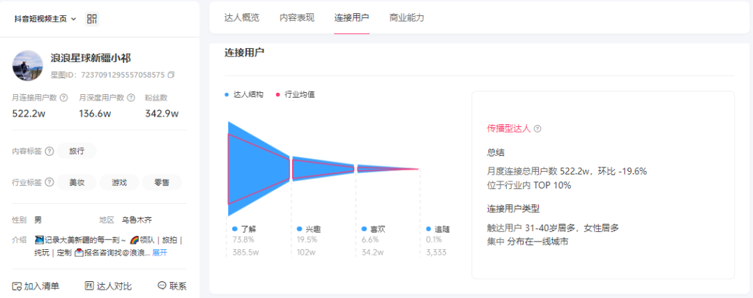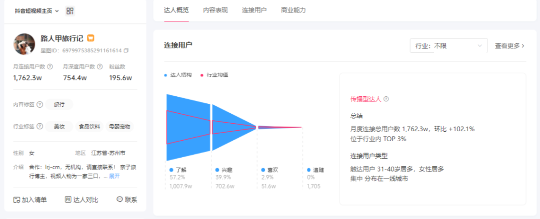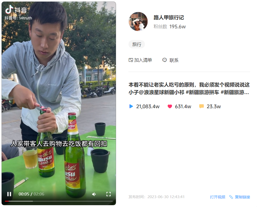 来源|运营公举小磊磊 关于我:全网近30W粉丝,旅游摄影类短视频号年涨粉5W,累计收入几百W。只写干货,教你自媒体怎么做,快速起号赚钱。 6月底,抖音博主“路人甲旅行记”发布了一条新疆旅行短视频,迅速爆火。 短短几天,视频点赞数从几万暴涨到631万,播放量突破1.5亿,总结为其增长了近百万粉丝。 ![]() 更夸张的是,这条视频还带火了一位普通人“小祁”。仅仅一周时间,“浪浪星球新疆小祁”从粉丝接近于零的素人,逆袭成为拥有324万粉丝的大博主。还登上了抖音2023抖音美好奇妙夜,和歌星同台演唱音乐。 ![]() ![]() 一个2分钟的旅游视频,是如何带火了一个普通素人?并且带来了双赢的局面呢? 1. 路人甲成为小祁的”推手“ “路人甲旅行记”从2021年6月开始做抖音,至今共发布了98个视频,获赞2652.7W,粉丝量达204.3W。 ![]() 他的视频主要内容,都是东北爸爸和香港妈妈带着宝宝旅行的故事,有时是分享旅游攻略、旅行过程中的所见所闻、也有旅行中遇见的温暖的人。 在他发布的98条视频中,6月30日发布的《本着不能让老实人吃亏的原则,我必须发个视频说说这小子》为题的视频最火,共获得了2.11亿浏览量,631.4W点赞。 文案中还提到了一位素人博主@浪浪星球新疆小祁,非常夸张的是,这条视频给小祁引流了324万粉丝,带火了原本籍籍无名的导游小祁,让他受到了无数关注。 ![]() 视频内容看似简单,就是博主一家三口去新疆旅游,导游给博主安排吃住行,不踩坑。 然而每句话都设计得恰到好处,又用足够多的例子佐证了小祁为自己带来了极佳的旅行体验。 视频开头:直切主题,贴标签 第一句话便暗藏玄机,开头说“我在新疆认识了一个傻小子,他是我们的导游。” 不仅强调了主题,并且在1秒内抓住了观者眼球,还为导游小祁贴了“傻小子”、“导游”的标签,这和我们传统印象中的导游很不一样。 ![]() 第二句:对比制造反差,问句引人好奇 作者不仅使用问句形式引人好奇,还对比其他导游制造强烈的反差感,使网友观看欲望达到了顶峰。 文案连贯性强:提高完播率 所有文案一句套一句,前后关联性强,不会让网友看到后面没兴趣,大大提高了视频完播率。 ![]() 第一人称视角:增强体验感 像在对朋友分享故事一样,来跟网友分享从作者角度看到的小祁,让人“沉浸式”体验了一把来新疆找小祁当导游的感受。这样就把“找小祁当导游”和“完美新疆行”划了等号。 最重要的是,选题正能量。博主拍摄初衷是希望这样以诚待人、努力工作的老实人被更多人看到,所以网友“买账”,愿意去分享、去关注。 2. 大环境相衬,小祁显得更“稀有” 据我们了解,小祁名叫祁秦,他是一名出生于1999年的东北小伙儿,在新疆做导游。 在走红前,他只是一名普普通通的素人。博主路人甲对他的表扬视频,这一次为他带来了341W的粉丝,让他短时间内身价倍增,跻身于大博主行列。 问题来了,小祁为什么会被这么多人关注呢?我们认为除了路人甲的帮助,还受大环境和小祁本身品质稀有两个原因影响。 1)大环境:花了钱,旅行体验却糟糕 众所周知,旅游行业一直以来都是注重口碑和消费体验的产业。但是长期以来,时有关于导游态度恶劣、强制购物的消息传出。 以至于大家提到跟团就怨声载道,印象中很多导游坑人、吃回扣、态度差、带游客购物等……在这样的大环境下,导游小祁却成了出淤泥而不染的存在。 2)小祁本身的“稀有”品质 与众不同: 别的导游带客人去购物去吃饭、拿回扣,小祁却处处帮博主省钱,不让他花冤枉钱。 比如,只带博主去本地小店,一盘快赶上桌子那么大的大盘鸡才110元,性价比很高。 ![]() 又比如,博主想买价格较贵的纪念品,小祁拦着不让,要带他们去便宜的地方,一路还倒贴买雪糕、干果、水果、本地的奶皮子… ![]() 细节控: 大家为了旅游找导游,肯定是想拥有最好的体验感,想留下好看的照片、有最佳旅行路线、避开人挤人…这些小祁都能做到,甚至会做的更好。 比如,作为导游,小祁不仅会把路线安排的井井有条,避开人群去小众打卡点游玩,还能把单反、无人机玩的很6,一路上给拍很多很好看的视频和照片。 又比如,他一直在帮忙搬行李、照顾孩子,连机票都能考虑到看到风景的一班。人还没开始旅游,在飞机上就看到了连绵雪山,对新疆充满了期待感。 ![]() 以诚待人: 旅游十五天,博主仅仅是小祁的一个客户,但是小祁却能做到默默付出,以诚待人,把博主当做朋友一样相处,可以说相当难得了。 比如在旅行中,小祁的无人机丢了,他心疼的不是自己的无人机,而是担心为博主拍的视频丢了太可惜,甚至在找无人机的路上还摔了一跤,却说没关系。 ![]() 通过这些现象我们发现,“路人甲旅行记”的帮助、小祁个人的稀缺品质,共同促成了双方走红的结果。 3. 小祁爆火后,未大规模掉粉,稳定运营 值得一提的是,小祁爆火后,他的粉丝一直稳定保持在300W+,并没有出现掉粉现象,粉丝忠诚度很高。我们分析认为主要有三种原因。 1)精准引流: 根据巨量星图用户数据分析显示,“路人甲旅行记”和“浪浪星球新疆小祁”两个账号的主要受众高度重叠。 两者均为传播型达人,且粉丝受众大多为31-40岁人群,且均为女性居多,粉丝集中分布在一线城市。 双方的粉丝受众一样,都是对旅游感兴趣的用户,所以不容易造成粉丝流失,可以说是精准引流。 ![]() ![]() 2)风格调整: 我们研究了小祁
