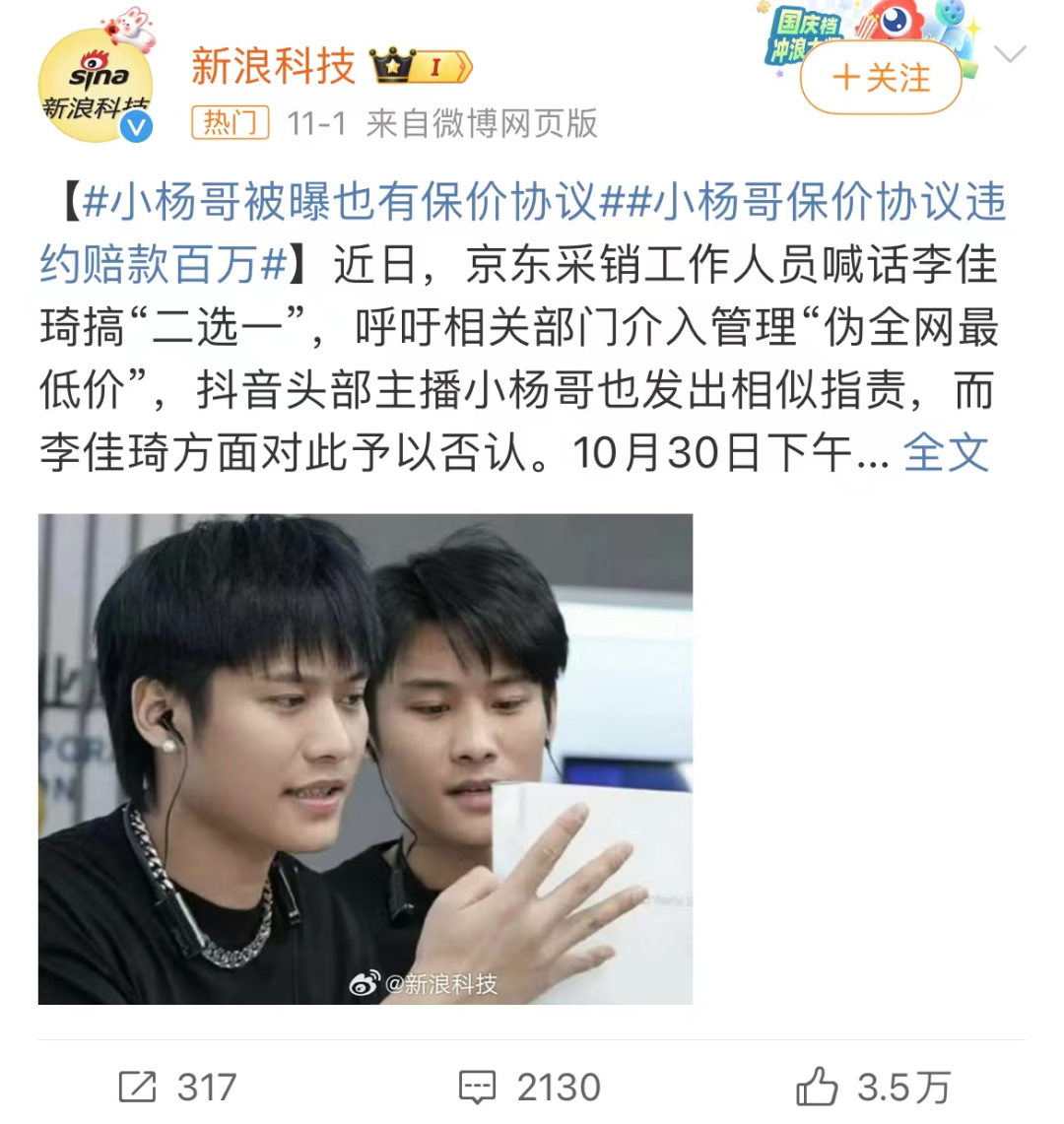 来源|鲸商 虽然双11已经结束了,但头部主播们仍不寒而栗。 因为在今年双11期间,几个头部主播都各种负面频出。直到大促结束,很多主播也没有主动大肆宣扬战果,和往年高调的基调截然不同。 这间接反映了,头部主播一枝独秀的时代结束了。消费者一旦发现某个主播的直播间产品不如另外一位的便宜,就会马上倒戈。加之平台时刻紧扣“低价”主题,大主播面对大促的心态正在发生转变,特别是他们面对“要求全网低价的争议”。 如今,大主播和平台虽纷纷为低价下血本,但双方也在无形中进行博弈,负面累累背后是主播、商家、平台、消费者的利益纠葛。 01年终大促期间,大主播们集体沦陷 李佳琦作为惹眼的行业大主播,在这次大促中首当其冲。 鲸商已在《直播正在“杀死”双11?》中,简述过李佳琦、海氏集团、京东采销之间的恩怨。然而,在双11过程中,淘宝头部主播李佳琦和抖音头部主播小杨哥,这两位顶流之间的矛盾冲突似乎更受关注。 10月24日晚,小杨哥在直播间怒呛李佳琦搞垄断价格,并表示要向反垄断局举报。这一事件马上引起了网友的广泛关注和讨论,“疯狂小杨哥怒怼李佳琦价格垄断”“大杨哥怒批李佳琦挟持商家”等话题接连登上微博热搜。 甚至小杨哥曾在直播间称:“三只羊从无保价协议,你们如果能破我们的价格,受益的还是消费者。” 转折虽迟但到。有一位上过小杨哥直播间的商家爆料:“小杨哥直播间有保价合同,也有违约合同后的赔偿金额100万。” 因此,“小杨哥被曝也有保价协议”的话题迅速冲上热搜。大部分看客都认为头部主播有“保价协议”。 ![]() 而当价格控制的质疑对准了“疯狂小杨哥”后,网友直呼大小杨哥被打脸了。随着事情逐渐发酵,网友还发现,在直播招商层面,小杨哥的公司“三只羊网络”的官网明确表明了“控价”的要求,官网显示,全网同款产品价格管控,确保直播间真正的性价比好物。 此事一经曝光,小杨哥面对无数讨伐声音。目前为止,小杨哥方面暂无回应。但可以肯定的是,此事对“疯狂小杨哥”直播间的形象会产生一些负面影响。 事实上,除了“保价协议”,小杨哥还被消费者指责,直播存在“低俗带货”的问题。10月27日,“疯狂小杨哥徒弟带货被指低俗”一事登上热搜,引发大众关注。小杨哥的徒弟“红绿灯的黄”在直播间带货圣罗兰的气垫时,披头散发、表情狰狞,也让不少消费者观感不适。 除了李佳琦和小杨哥混战,东方甄选也没能逃过大促中的负面新闻。2022年火出圈的东方甄选,最大王牌是主播董宇辉。2023年,东方甄选“出逃”抖音,成立独立App,搭建会员体系。总想年年更上一层楼的东方甄选,自然不想错过今年双11这波流量。 今年是东方甄选第二次参与“双11”活动,但仍有不成熟之处?。10月30日有用户在黑猫投诉平台发起集体投诉,起因是东方甄选返现红包虚假宣传。据用户反映,在东方甄选淘宝直播间下单后,用户会得到红包,该红包可以用来付尾款、买现货等。不过部分用户发现,付尾款时红包已过期。 待事件发酵到有近200人参与集体投诉时,东方甄选客服这样回应:“‘买就返红包’一直都是5天有效期,主播曾提示过使用时间;该红包可以用于购买直播间其他商品,过期后不支持延期,非常抱歉给您带来不便。” 此外,还有大量用户认为东方甄选自营产品发货速度较慢。这都暴露出东方甄选在双11的服务和售后层面存在漏洞。 不过,比负面事件更让各大主播头疼的,或许是如何综合发展,提升交易额。 02“鸡蛋不放在同一个篮子里” 主阵地为抖音的小杨哥,双11收官直播当天,其直播间火速成为抖音双11热销榜第一名,同时在线人数超过10万,收到的点赞数高达1100多万。但在后半程,直播热度被另一位主播反超,成为热销榜第二。 我们再看逐渐多条腿走的东方甄选和交个朋友。 有相关平台估算,东方甄选2023年双11专场期间(10/24~11/11):总GMV约为14.70亿元(根据对淘宝业绩估算的上下限取均值得来),同比增长约84.2%(去年双11仅抖音平台)。其中代销GMV约12.16亿,同比增长96.1%;自营品GMV2.54亿,同比增长42.7%。 可以看出,这是份相对不错的成绩单。 结合东方甄选最新财务数据来看,2023财年(2022年6月1日-2023年5月31日)东方甄选自营产品及直播电商业务的总营收39亿元,其中自营产品总营收超过26亿元,毛利15亿元。 ![]() 东方甄选的自营产品在持续稳步增长,其公司的切片带货视频也在带来持续收入。但东方甄选是一家不想绑定独家平台的企业,其CEO孙东旭曾表示过要“坚持多平台发展”。因此,东方甄选今年入住了淘宝等其他平台,并开创了独立APP,加速摆脱对抖音单平台的依赖。 与东方甄选一样,不想绑定抖音的罗永浩也是如此。罗永浩背后的“交个朋友”去年从抖音出走后,在淘宝天猫、京东上多平台布局发展。今年5月入驻京东的交个朋友,选择把双11最后一场直播放在京东进行。 根据报道,当晚,“交个朋友”京东直播间场观为439万。直播间里除了3C数码、酒水食品、家居家电产品,很多商品链接为京东自营品牌惠寻产品。 再看“交个朋友”的淘宝直播间。去年10月,交个朋友正式入驻淘宝。罗永浩打头阵开启直播首秀,首播销售额超过1个亿元。双11期间,交个朋友在淘宝累计进行二十多场直播,销售了超5000种商品,粉丝突破1000万,成为淘宝直播有史以来增长最快的公司。 在今年双11期间,交个朋