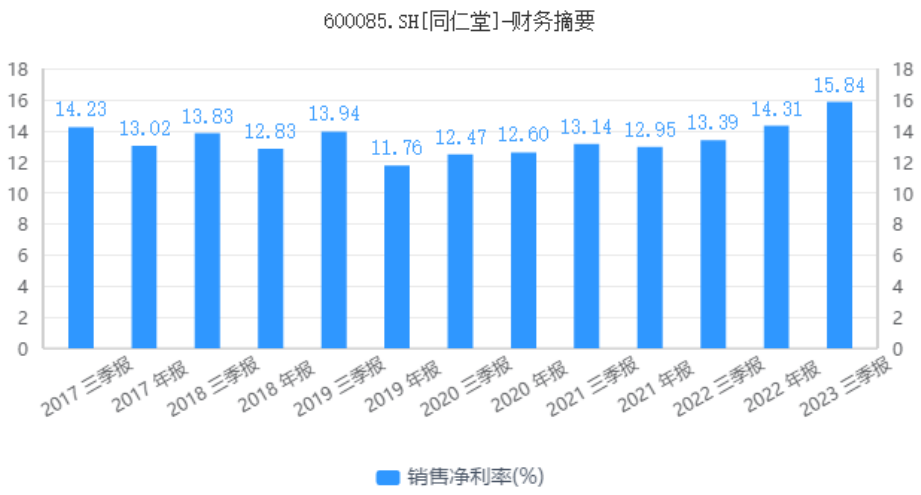 来源|砺石商业评论无论是中药资源、品牌张力还是零售布局,同仁堂都是无可争议的中药第一品牌,这是其业绩重回巅峰的希望。 1销售净利润率创新高 前不久,同仁堂发布了2023 年第三季度财报。今年前三季度,同仁堂实现营收137.21亿元,同比大幅增长25.88%;实现归母净利润13.91亿元,同比增长38.67%。其中,第三季度,同仁堂实现营业收入39.61亿元,同比增长16.72%;实现归母净利润4.04亿元,同比大增55.81%。 按照业务模式划分,同仁堂主营业务共分为医药工业(生产制造)分部和药品零售分部两部分。其中,医药工业覆盖心脑血管、补益、清热、妇科等核心治疗领域的各类中药,包括安宫牛黄丸、同仁牛黄清心丸、同仁大活络丸等;医药零售板块则是同仁堂的近千家直营门店业务,主要收入来源于中西成药、饮片以及保健品。 2023年上半年,同仁堂医药工业分部实现营收61.46亿元,同比增长28.33%;医药商业板块实现营收55.36亿元,同比增长20.87%,两大板块均保持了20%以上的增速。 毛利率方面,受上游药材涨价影响,公司医药工业分部毛利率出现了一定程度的下滑,公司整体毛利率也受到了一定影响。今年前三季度,同仁堂销售毛利率为46.28%,较去年同期下滑2.11个百分点。此前的半年报显示,2023年上半年,同仁堂医药工业分部毛利率为44.92%,同比下滑5.14个百分点;医药商业板块毛利率为30.41%,同比增长0.4个百分点。 费用率方面,前三季度,同仁堂销售费用率、管理费用率、财务费用率分别降低了1.91个百分点、1.3个百分点、0.68个百分点,仅有研发费用率同比提升了0.07个百分点。 得益于良好的费用控制能力,同仁堂销售净利润率在毛利率同比下滑的情况下仍然实现了逆势增长。今年前三季度,同仁堂销售净利润率为15.84%,创出近十年以来最佳水平。 ![]() 除了盈利能力的提升之外,同仁堂的收现能力也有所提高。截止最新财季,公司应收账款余额为16.34亿元,较去年同期减少0.04亿元。在公司营收保持了26%同比增速的背景下,同仁堂应收账款实现了同比负增长,说明公司收现能力有了进一步提高,自我造血能力增强。 整体来看,同仁堂前三季度的费用控制能力、收现能力以及销售净利润率等指标表现均较出色,整体经营质量稳步提升。 “炮制虽繁必不敢省人工,品味虽贵必不敢减物力”。在一众多中药品牌中,同仁堂无疑是最正宗、最负盛名的老字号。 但在二级市场中,同仁堂受投资者的追捧程度却远不及片仔癀、云南白药这两家企业。尤其是在2021年的白马股行情中,同仁堂最高市值不过600亿元,而片仔癀市值一度接近3000亿元,云南白药市值也一度超过2000亿元。 随着白马股高估值泡沫的破裂,片仔癀、云南白药股价均已遭遇腰斩,而同仁堂的股价却继续创出新高。尤其是在白马股普遍遭遇杀跌的2023年,同仁堂股价仍然取得了16%的正增长(截止12月15日),片仔癀、云南白药跌幅分别为18%、7%。 截止最新一个交易日收盘,同仁堂市值为724亿元,片仔癀、云南白药市值分别为1429亿元、873亿元。尽管同仁堂市值仍处于第三位,但却大幅缩小了与前两者的差距。这家曾经的百年御药老字号,能否重新夺回属于自己的辉煌? 2不做大哥好多年 始创于1669年(清康熙八年)的同仁堂,距今已经有350多年的历史。据史料记载,自1723年(清雍正元年)起,同仁堂就开始为清宫供御药,前后历经八代皇帝,长达188年,为其奠定了强大的文化根基与品牌价值。 事实上,在2006年以前,同仁堂一直是中药板块的领头羊。2005年,云南白药营业收入为26.06亿元,净利润为3.01亿元。对比来看,云南白药、片仔癀营业收入为24.48亿元、4.19亿元,净利润分别为2.3亿元、0.86亿元,同仁堂的净利润几乎等于后两者的总和。 2006年,云南白药完成了对同仁堂的反超。这一年,受监管整顿与坏账核销等因素影响,同仁堂营收规模同比下滑8.03%,净利润同比大跌48.46%。对比来看,云南白药则凭借牙膏产品全国热销,实现了营收、净利润双双增长,“中药一哥”的排名由此易位。 ![]() 事后来看,2006年经营业绩的下滑只是同仁堂发展历史的一个小插曲。进入到2007年以后,同仁堂的营收以及净利润规模仍然保持着稳定的增长。数据显示,2007年-2018年,同仁堂的营收规模从27.04亿元增至142.09亿元,复合增长率为16%;净利润从2.35亿元增至11.34亿元,复合增长率约为15%。 尽管同仁堂营收净利润均保持了两位数的增长,但相比成功跨入日化领域的云南白药仍显得平庸。2018年,云南白药营收达到270.17亿元(接近同仁堂的一倍),净利润达到34.94亿元(超出同仁堂的两倍)。 因此,在2006年-2018年期间,同仁堂始终活在云南白药的阴影之下,屈居行业第二位。更为不幸的是,发生在2018年末的过期蜂蜜事件又一次将同仁堂推进舆论漩涡,不仅拉大了与云南白药的距离,公司市值也被片仔癀反超,成为行业老三。 2018年12月15日,据江苏电视台报道,同仁堂集团下属子公司同仁堂蜂业涉嫌回收过期蜂蜜,引起舆论哗然。最终,同仁堂蜂业因销售过期蜂蜜被罚没1420万,市场监管总局直接撤回同仁堂“中国质量奖”称号。 2019年,受过期蜂蜜事件影响,同仁堂营业收入、净利润分别同比下降6.56%、13.12%。2020年,同仁堂营业收入再次缩水,同比降幅为3.40%。截止2020年年末,同仁堂总市值仅为316亿元,云南白药、片仔癀市值分别为1360亿元、2623亿元。至此,同仁堂彻底被当年的两个小弟甩在了身后。 事后来看,过期