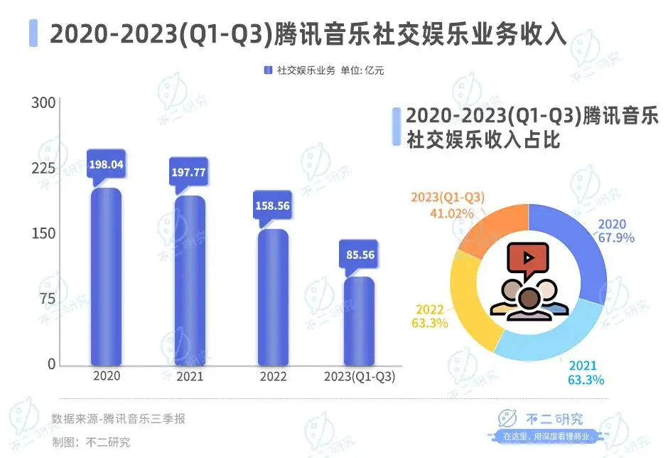 作者 | 艺馨 豆乳拿铁 排版 | Cathy 监制 | Yoda 出品 | 不二研究 继6月大规模涨价之后,腾讯音乐娱乐集团(下称“腾讯音乐”,01698.HK)旗下QQ音乐会员再次涨价。 「不二研究」据腾讯音乐三季报发现:在会员数这一关键指标上,腾讯音乐在三季度的月活跃用户从去年同期的6.20亿下滑至5.94亿。目前,腾讯音乐主要面临营收下滑、月活跃用户流失等问题,在「不二研究」看来,这主要是由于监管趋严之下,腾讯音乐的社交娱乐服务业务大幅收缩;与此同时,抖音、B站、快手等视频平台的听歌功能,使得数字音乐市场竞争变得愈发激烈。 腾讯音乐是一家在线音乐与音频娱乐平台,提供在线音乐、在线音频、在线K歌、以音乐为核心的直播及线上演出等服务。 2023年首个交易日,腾讯音乐在资本市场迎来“开门红”。截至1月5日收盘,腾讯音乐报收34.7港元/股,对应市值1193亿港元(约折合人民币1094.18亿元),对比2023年1月市值高点1252.74亿港元,其市值已经蒸发59.74亿港元。 ![]() 「不二研究」据腾讯音乐三季报发现:2023年前三季度,腾讯音乐营收为208.59亿元,同比减少0.26%;同期,净利润为12.6亿元,同比增加15.6%。 此前5月的一篇旧文中(《付费订阅故事难讲,腾讯音乐如何“过河”?》),我们聚焦于腾讯音乐营收上升,但月活跃用户持续下滑。 时至今日,腾讯音乐不仅面临营收下滑、月活跃用户下滑等问题,还要直面抖音、B站、快手等视频平台的竞争。 随着直播娱乐监管趋严,面对月活用户的流失,腾讯音乐能否依靠涨价突破突破用户增长“天花板”?由此,「不二研究」更新了5月旧文的部分数据和图表,以下Enjoy: 据多位QQ音乐用户表示,QQ音乐绿钻豪华版自动续费价格将由此前的11.4元/月上调至15元/月,该调整将自2024年1月9日0点起变更生效。 在连续多年的收入增长放缓下,腾讯音乐2023年三季度,其总营收为65.7亿元,同比减少10.8%;净利润为12.6亿元,同比增长15.6%。 尽管腾讯音乐的净利润呈上升趋势,但三季度月活跃用户持续下滑。其在线音乐服务的移动端月活跃用户数为5.94亿,同比下降4.2%;社交娱乐服务的移动端月活跃用户数为1.29亿,同比下降16.8%。 与此同时,社交娱乐服务业务曾是腾讯音乐的营收支柱,但2021年Q3逐渐减少,以2023年三季度为例,其社交娱乐服务业务收入为85.56亿元,同比下降48.8%。 随着版权红利消退,腾讯音乐不仅直面营收下滑、月活跃用户流失,同时还要抵御野蛮入侵的短视频APP。在内忧外患之下,腾讯音乐能否突破成长瓶颈? 消失的版权护城河 此前很长一段时间,国内在线音乐行业的战争,归根结底是版权之争。谁拿到版权,谁就有绝对优势,于是,各大互联网巨头纷纷入局厮杀。 2012年,律师出身的谢国民敏感捕捉到版权市场的商机,创立海洋音乐集团,彼时坐拥超过市场半数左右的独家版权。财大气粗的腾讯于2016年收购中国音乐集团(含海洋音乐集团),从此奠定其在线音乐江湖的版权优势地位。 一轮轮激战中,千千静听等平台被并购,虾米音乐被关停,阿里大文娱暂时退出战争……最终,在线音乐江湖进入腾讯音乐与网易云音乐的两强争霸赛阶段。 版权是音乐流媒体的“命根”。2018年,各大在线音乐平台相互授权99%以上的音乐版权,以此防范版权垄断;仅剩的1%版权因此越发炙手可热。依靠1%的核心资源,腾讯音乐在过去五年内筑起一道独家版权的“护城河”。 然而,2021年7月,国家市场监督管理总局曾对腾讯下发《腾讯控股有限公司收购中国音乐集团股权违法实施经营者集中案行政处罚决定书》,要求其放弃音乐版权独家授权。随后,国家版权局进一步要求数字音乐产业各方维护版权秩序,禁止签署独家版权协议。对于腾讯音乐来说无疑是一个巨大的冲击。 目前,腾讯音乐的曲库量在150万首➕,拥有全球三大唱片公司华纳音乐的独家版权;英皇娱乐、相信音乐、摩登天空、华谊兄弟等超过19家华语知名唱片公司的独家版权;并坐拥韩国三大娱乐公司SM、YG、JYP的独家版权。 尽管腾讯音乐净利润保持双位数增长,但其营收却呈下滑态势。「不二研究」发现:其2023年Q3的营收为65.7亿元,同比下降10.8%,成为2020年Q1以来营收最低的单季度。 ![]() 此外,从2018年起,腾讯音乐的版权成本逐季上升,峰值接近营业成本的50%;这意味着其已为“护城河”支付高额代价。难道腾讯音乐要沦为唱片公司和厂牌的“打工人”? 在知名词作吴向飞版权维权事件中,尽管腾讯音乐已向台湾环球支付了版权费用,且版税总额高于台湾环球的所有版税收入,但吴向飞应得的版税却被台湾环球悉数侵吞。管中窥豹:在版权交易中,唱片公司的强势地位可见一斑。 ![]() 图源:freepik 腾讯音乐的竞争对手不仅包括网易云等在线音乐平台,抖音、快手等短视频APP也来势汹汹。据财新引用数据:腾讯音乐播放峰值音乐中,高达45%是所谓的抖音神曲。 「不二研究」发现,从2018年起,抖音相继获得环球音乐、索尼音乐、华纳音乐的音乐版权,并与摩登天空、杰威尔等国内唱片公司合作,周董的版权也不再是腾讯音乐的独家版权。 尽管腾讯音乐在曲库版权方面具有显著优势,但在监管压力和市场竞争的双重夹击下,其营收仍面临较大的挑战。 在线音乐成主力 在短视频盛行的年代,所有泛娱乐平台都得面对流量增长滞缓和外溢加速,腾讯音乐也不例外。 Fastdata极数发布的《2022年中国在线音乐行业报告》显示,2022年12月,数字音乐平台