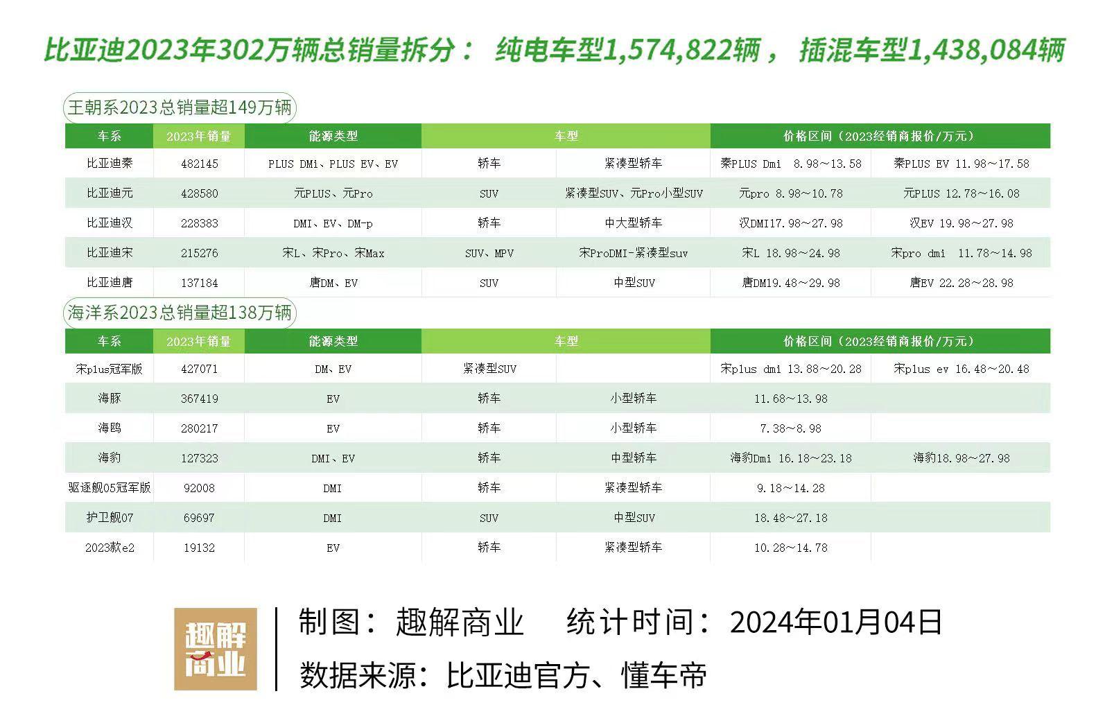 作者 | 赵普 编辑 | 趣解商业 比亚迪(002594.SZ)超302万辆新能源车的销量,不仅实现了王传福年初定下的目标,还在第四季度纯电车交付量上超越特斯拉,成为全球纯电汽车的季度销冠。 对于比亚迪季度性超越特斯拉,特斯拉首席执行官埃隆·马斯克回应到,“特斯拉是一家AI及机器人公司,但在很多人看来,它更像是一家汽车公司。” 不过,让比亚迪尴尬的是,虽然销量涨了一年,但股价却跌了一年。其2023年2月股价达到全年最高的304.99元/股,但随后开始下跌,至12月股价出现全年最低的182.85元/股。截至1月4日,比亚迪股价微跌0.08%,收盘价193.02元/股。 ![]() 图片来源:百度股市通 与之对应的是,特斯拉股价从2023年初118美元/股上涨到2023年末的248美元/股。 ![]() 图片来源:百度股市通 此前已经有很多分析,有观点认为,随着比亚迪销售规模的快速扩张,未来规模增速会逐渐放慢,投资者提前退场。此外,比亚迪在智能化、自动化方面,至少在目前并没有让投资者看到颠覆商业模式的可能,依然是以拼硬件、拼价格为主,之前的股价有溢价过高的可能。 海外社交平台X(前身Twitter)上有人分析称,比亚迪很少在AI或自动驾驶方面做出惊人的成绩,但这不能否认比亚迪也具有雄厚资本和实力,特斯拉在FSD和Optimus投入商业化之前,也十分依赖汽车销售带来的收入。 乘用车市场信息联席会秘书长崔东树表示,现在狂冲规模的比亚迪,未来还能否继续高速增长,主要看技术能否有创新。 01.20万元以下车主占七成,却不配有红包? 有资深业内人士分析认为,特斯拉和比亚迪的新能源车对标客群完全不一样,特斯拉主打高端客群,投入的智能化、自动化技术支撑了高端占位,单车利润更高;比亚迪主攻刚需市场,追求规模,是薄利多销的典型新能源车企。 2023年,比亚迪全年卖出的新能源车超过302万辆,其中纯电车型销量略高于插混车型销量,分别是1,574,822辆和1,438,084辆。 从产品系来看,比亚迪王朝系和海洋两大系列总销量分别约为149万辆和138万辆。其中比亚迪秦系列销售超过48万辆,宋PLUS冠军版销量超42万辆,分别是王朝系和海洋系的“主力军”。 ![]() 图片来源:趣解商业 梳理比亚迪售价不难看出,上述两款主力车型的价格区间都在20万元以内,覆盖轿车和SUV两款主要购买车型;其他如比亚迪元、宋系列和海豚、海鸥系列等贡献20万以上销量的车系,其主要车型售价也都在20万元以下。 不仅如此,比亚迪自2023年第4季度开始的“降价”优惠活动,还在持续,是否会“卷”到春节期间还未可知。其中,护卫舰07优惠幅度为2千抵2万的优惠,海豚、海豹冠军版2千抵9千,宋PLUS冠军版、驱逐舰05海豹DM-I则推出"2千抵7千"的优惠。 根据上述比亚迪车型销量粗算,比亚迪20万元以下的车型销量合计约221万辆,占2023年总销量的比例约为73%。从这个意义上说,王传福给经销商包20亿元红包,就不想想比亚迪的车主吗? 据乘联会数据,2023年1~11月,新能源汽车销量1267万台;1月4日最新数据,乘联会预估2023年12月新能源车零售93.6万辆。据此合计,2023年全年新能源车销量约在1317.6万辆;这意味着,比亚迪的销量在全国车企的总销量比例约在23%。 ![]() 图片来源:罐头图库 而20万元以下的新能源车市场,比亚迪无疑会有更高的占比,这对比亚迪来说是利好,对其他主攻20万元以下市场的车企来说,未来的空间越来越小了。 目前,在20万元以内市场的新能源车企包括广汽埃安3款车型、零跑汽车、深蓝汽车、哪吒汽车、小鹏P5和G3、五菱汽车、吉利几何等等。 其中广汽埃安、吉利新能源汽车年销量都超过48万辆(含极氪等车型),其他多家车企的年销量在20万辆以下,比如零跑只有14.42万辆、深蓝只有13.69万辆、哪吒仅12.75万辆…… 02.研发超600亿,比亚迪的模式能复制吗? 在比亚迪实现超300万辆销量之时,估计很多人都会有个疑问,为什么是比亚迪而不是其他? 人们常说“选择大于努力”,但对比亚迪说,选择也是坚持。 王传福曾坦言2019年是比亚迪最困难的一年,净利润已经连续3年亏损,很多友商车企都放弃插电混动技术了,比亚迪何去何从成了最大的问题,但比亚迪仍咬牙投入大量资金进行技术研发。 “趣解商业”统计了一下,从2019年到2023年上半年,比亚迪累计研发投入金额已经超过620亿元,研发人员从2019年的不到3.6万人,增加到2022年的接近7万人。 从这一点来说,一般车企确实难以复制比亚迪的模式。比如最近热度比较高的小米汽车,雷军提到“十倍策略”,第一辆车投入3400名工程师,研发投入超100亿元,投入已经很大了,但借鉴比亚迪的历史,再看雷总将小米汽车对标50万元以内的车型,后续仍要追加投资。 ![]() 图片来源:发布会现场 几百亿的研发投入,确实带动了比亚迪新能源车性能的提升,其中首先打开突破口的是刀片电池和DM-i混动技术。 2020年7月,刀片电池技术开始逐步应用于汉、E2、宋plus、秦plus、D1、海豚等多种纯电动车型。其中全新轿车比亚迪汉系列改款SUV唐系列贡献最大,比亚迪官方激动的在财报中表示,作为首款搭载刀片电池技术的车型,“汉”的热销打破了自主汽车品牌难以突破的格局。 随后的比亚迪就像“开挂”一般狂点科技树,销量也一路猛增。 2021年比亚迪DM-i超级混动搭载于比亚迪秦PlusDM-i、宋PlusDM-i、唐DM-i等多款车型;同年DM-p搭载于全新一代唐DM、汉DM、宋ProDM、宋MaxDM、秦ProDM等多款车型;e平台3.0首款车型海豚也2021年上市,解决纯