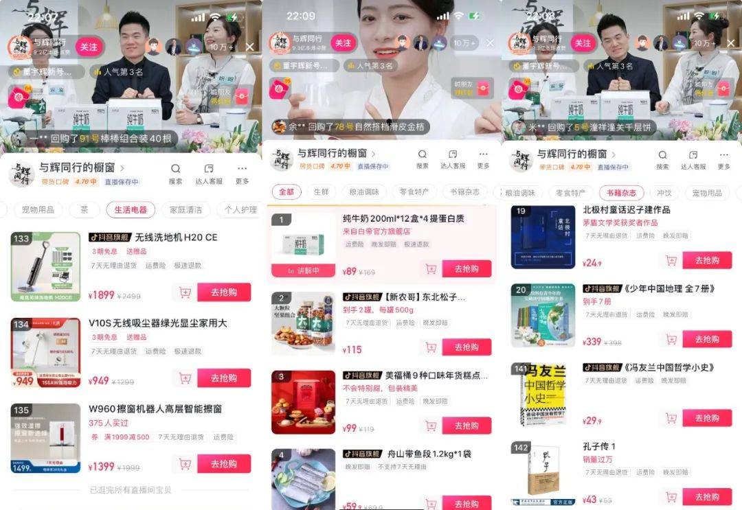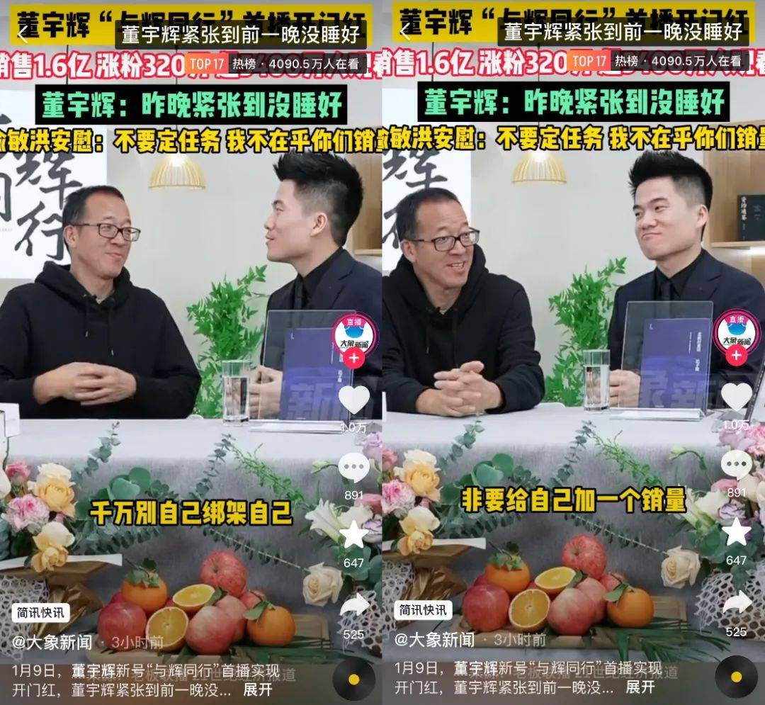 来源|卡思数据 单场直播涨粉300万,董宇辉新号收获“开门红”,成为2024年第一个全网瞩目的直播间。 1月9日晚上7点,董宇辉新号@与辉同行 在抖音正式开播。开场节目是7位新主播的才艺表演,比起yoyo、顿顿、明明等@东方甄选 主号的元老主播,新主播在开播前的粉丝量集中在10万-40万左右。 当晚8点,董宇辉和新东方创始人俞敏洪合体直播。俞敏洪在谈及与辉同行成立时感叹道,如果没有“小作文”事件这个波折,@与辉同行不可能这么快成立起来,“尽管直到现在也不希望那次事情发生。” 董宇辉还提到,前一晚紧张到没睡好,俞敏洪安慰道,“不要定任务,我不在乎你们销量。” ![]() 图源:大象新闻视频截图 这场“没有KPI”的直播带货,反而收获了泼天的富贵。一开播同时在线人数就突破10万人,高峰期甚至冲破170万人。整场直播共持续了4个多小时,现场显示的总GMV超过1.5亿,位居抖音带货日榜第一名,总点赞量达12.8亿。 距离“小作文”事件已1个月,东方甄选的舆论危机已经解除,开设的新直播间看起来又打了一场漂亮的首秀之战,那么董宇辉真的安全了吗?带货1.5亿,是首秀即巅峰,还是第二个东方甄选即将诞生? 首秀带货1.5亿,一次事先张扬的直播奇迹 距离2022年6月9日董宇辉爆火,到新号@与辉同行 首播,恰好19个月。 在爆红的起点,2022年6月9日,董宇辉只是东方甄选主播团的一员,当日直播间累计GMV仅在350万元左右。 彼时,董宇辉因“双语教学”被流量选中,变成气运之子,成为@东方甄选 主播团中粉丝最多的一位。截至发稿前,其账号粉丝量已达到2395.8万,而@东方甄选 主号粉丝量也才3148.8万。 在爆火之后,东方甄选的业绩节节攀升,股价也水涨船高。因被认为是力挽狂澜的功臣,董宇辉得到了丈母娘的偏爱和场外打工人的支持。在去年年底的“小作文”事件中,很多路人为董宇辉鸣不平,甚至连罗永浩都专门开直播为“小董”出主意,怒斥东方甄选抠门,让“小董”争取更多的合理利益。 舆论的力量推动俞敏洪快速做了决定。12月16日,东方甄选发布人事任免通知,俞敏洪兼任东方甄选CEO,免去孙东旭CEO职务。12月22日,东方甄选董事会宣布,孙东旭已辞任公司非执行董事一职,即时生效。与此同时,董宇辉被任命为新东方教育科技集团董事长文化助理,兼任新东方文旅集团副总裁。 在孙东旭离职一周左右,@与辉同行 开设抖音账号,随后又宣布1月9日开播,整个筹备时间十分紧张。@与辉同行 关联公司由东方甄选100%控股,新账号的商品交易总额计入东方甄选财报。 ![]() @与辉同行 带货首秀海报 显然,这场直播对董宇辉团队、丈母娘、抖音平台各有意义。值得一提是,1月7日,抖音app还在其官方微信公众号上专门发布了一篇@与辉同行 将于1月9日直播的消息,平台主动帮一个新账号造势,足够说明这会是开年第一个爆款直播间。 高粘性的粉丝是董宇辉的最大底气。尽管独立运营,但@与辉同行 团队依然在中关村E世界办公,1月9日开播当天,多地粉丝为董宇辉的新工作室送上大麦和鲜花。 丈母娘(董宇辉粉丝代称)们的购买力说明了一切。当晚,小黄车挂上商品链接,@与辉同行 直播间就进入了自助下单模式。董宇辉开口讲品之前,直播间销售额已经逼近千万。随后,又有多个链接的商品在讲解期间售罄。 ![]() @与辉同行 直播间部分商品 在直播风格上,董宇辉新团队仍然保持着和@东方甄选类似的节奏。除演唱了多首歌曲如《山歌好比春江水》《稻香》等外,在讲解产品时依然会延伸一些小知识点或者民间故事,在售卖之外增加了娱乐和知识属性。 在选品方面,@与辉同行 直播间当晚共上架191件商品,包含家电、食品饮料、书籍、日用产品等,部分商品与东方甄选直播间重合,但并无东方甄选自营产品。 据主播透露,@与辉同行 目前的选品由新团队主导,他们从评论区获得了大量消费者建议。值得一提的是,直播销售额最高的4款商品均为食品,且均在@东方甄选直播间出现过,不过因产品规格差异,售价并不相同。 ![]() @与辉同行 首秀销售额最高的商品 据直播间实时信息,截至1月9日晚上10点22分,@与辉同行 首秀累计销售额达到1.5亿。截止发稿,@与辉同行 共发布49条视频,粉丝量达到777.4万,相当于@东方甄选 主号的1/4。 与之相对,@东方甄选 直播间当天的人气和@与辉同行 差值较大,但销售成绩反而高于日常。三眼查显示,@东方甄选 当日售出36.18万件商品,预估销售额为3199.23万元,位列抖音日榜第三。 据@与辉同行 直播间消息,新团队目前有71人,其中包含主动请缨过来的主播、东方甄选母公司梳理团队后划拨过来的人员。等人手再充裕些,@与辉同行 将在年后展开一系列战略部署,比如做外景、走出去。 董宇辉安全了吗? 看起来,董宇辉首秀中,粉丝给力,成绩亮眼,他和老板相谈甚欢,言笑宴宴。但实际上,这场直播也是董宇辉独挑大梁的开始,真正的考验还在后头。 “小作文”事件爆发后,一切都朝着众人始料未及的方向发展开去。卡思认为,董宇辉未来至少还要面临三重挑战。 其一,直播电商行业高度内卷,用户总会被更新更好的内容形式所吸引。 直播电商并不是一个简单的售卖工作,且行业竞争愈发激烈,在抖音电商里“内卷”尤为明显。 从数据来看,东方甄选直播间2022年6月人气大涨,正是因为双语教学式带货模式。一方面,很多观众在为情怀买单。新东方作为老牌上市公司、知名教育龙