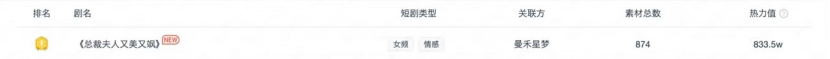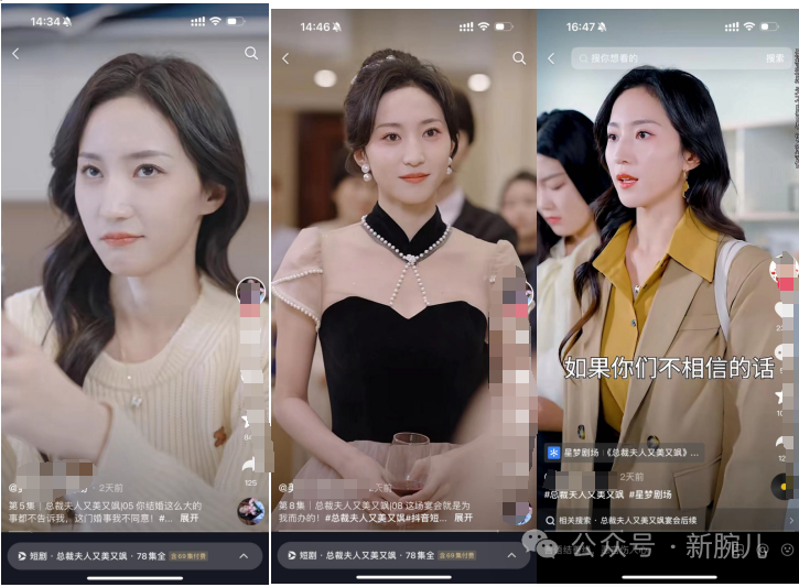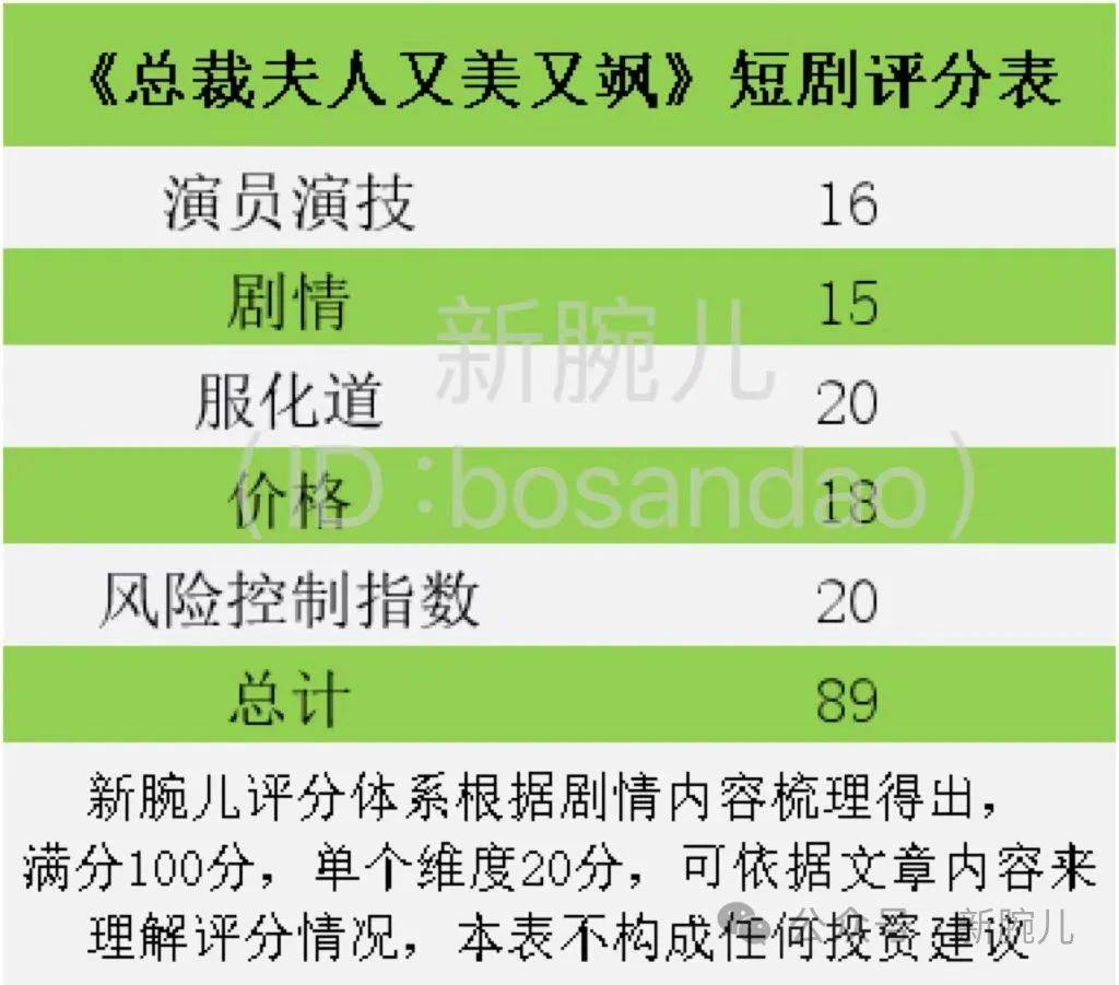 来源|新腕儿 新腕儿日常进行的拆剧环节,今天要拆解的短剧是《总裁夫人又美又飒》。 这部剧连续两天位列新腕儿短剧日榜榜首。 分别在1月6日,《总裁夫人又美又飒》在当日排名第一,热力值为833.5万; ![]() 1月7日,这部剧的热力值为859万。 ![]() 连续两日霸榜的《总裁夫人又美又飒》,会有哪些特别之处呢? 为什么拆:一周蝉联两日榜首 《总裁夫人又美又飒》是一部女频,一共78集。 没有虐心催泪,也没有爱恨纠缠,一个魅力独立女主开挂人生,又是一个关于「崛起」的故事。 女主季洲洲是总裁顾北渊的妻子。 故事开篇,顾北渊要去外地接自己的母亲,就哄着老婆季洲洲去公司上班。 季洲洲日常行事低调,骑着一辆电动车去公司,势力的员工们看到骑电动车来的季洲洲,压根儿没当回事。 碰巧一辆豪车到访,下车的人被大家当做总裁太太。 假总裁太太叫周婷,是季洲洲的高中同学,爱慕虚荣。被误认为总裁太太后,极大的满足了自己的虚荣心,为了保持这种身份,撒了一个又一个谎。 而季洲洲本可以通过很多种方式拆穿对方,证明自己才是真正的顾太太,却并没有直接表明身份,转而和这些人进行了一轮又一轮的周旋。 从被认为「假总裁夫人」到「真总裁夫人」、「首富之女」,《总裁夫人又美又飒》上演一场独立女性不用努力即可获得的开挂人生。 从第三方流量监测平台提供的数据来看,《总裁夫人又美又飒》的数据能连续两天时间保持榜一,证明这部剧的内容很合女性用户的胃口。 《总裁夫人又美又飒》倒的确是一部尬得有趣的剧。 内容简述:总裁太太+首富之女=「豪华」套餐 《总裁夫人又美又飒》是有不少亮点的。 一个亮点是演员的服化道。 剧组为演员们的服装安排比较上心。 像是女主季洲洲,在每个场景都有一套全新的服装,在公司里是都市丽人的造型,宴会场合则准备了对应的礼服。 ![]() 男主顾北渊性格沉稳,日常穿搭深色西装,简单大方,沉稳厚重。 ![]() 还有顾家二少,即便不是主角,但也连着换了好几套西服。他常年在国外,是严肃中带点奸诈潇洒的人设,因此西服都有些装饰,偏向英伦元素。 ![]() 演员们的颜值也都很高。 季洲洲演员的选择就不用说了,长得很漂亮,符合大女主人设。 ![]() 那个假冒的「总裁太太」周婷角色在神情的演绎上,还是有值得留意的地方。 注意这位演员的眼神。 ![]() 顾家二少顾北行的演技也很生动。 其角色阐释分多层次,在包容温暖的对外人设下,其性格并不善良,凝视着周婷时,有着自己的城府,「收起你那些小心思」,干脆利落的扔掉对方的手机,没有丝毫犹豫。 还利用周婷设计季洲洲和顾北行,自己出面当老好人。 兄弟俩性格截然不同,顾北渊是外冷内热,顾北行则是外热内冷,更为狠辣。 ![]() 我们再来看顾北渊一角。 讲真,相对于其他角色的阐释来讲,这个角色少了几分血肉感,这种感知并非顾北行冷酷的人设所致。 他在很多个场景中都是一个表情。 比如,母亲不喜欢妻子季洲洲时,跟母亲吵架后,这样走了。 ![]() 接老婆电话时是这样的。 像不像接到董事会的罢免通知? ![]() 发现老婆差点被凌辱,一脚踹开房门就老婆季洲洲时,是这样的。 恍惚中暗自思忖,施暴者会是谁? ![]() 他在每个场景的神态传递上不够饱满。包括其台词功底,吐词不清,缺乏情绪起伏。 但他有个最大的优点,就是外在形象完全符合偶像剧霸总人设。 这位男演员长得很帅,符合女频剧对应的年轻女性霸总审美,身材高挑,眉骨突出,深邃的眼神渗透出一丝忧郁的气质。 对外冷酷,对妻子季洲洲却是义无反顾的偏爱,很容易赢得女性观众喜欢。 内容点评:剧情老套 在剧情上,《总裁夫人又美又飒》呈现着鲜明的两极化。 整体来讲,这部剧的剧情题材上没有太多的新意。 在女频类题材,无论是不是短剧,「总裁」都是一个用烂的人设。 这部剧很守旧。 总裁夫人无缘无故被误会,又无缘无故出现了堂而皇之地「假总裁太太」,总裁太太又无意与失散多年的首富父亲相识,成为了首富之女。 这类题材真不要太老套,对观众来讲已经没有新鲜感。 其优点可能在于多分支叙事。 不只是平行事件的纠缠、冲突、误会,而是多层次展开。 从「假总裁太太」的出现,到顾二少顾北行出场,带来的整体剧情多层次推进。 顾二少有一条独立的剧情线,这条线分为几次与主角交织出火花,拉动剧情的精彩。 期间又发现了富豪父亲,引发白蕴意的嫉妒,为后来的冲突纠缠埋下伏笔。 还有周婷带来的剧情线,都很完整。 每个人物的剧情纠葛交错进行,让整部剧剧情不断产生新鲜感,更看出幕后制作公司的专业水准。 但也有些「疏漏」之处。 这部剧的高潮部分发生在「答谢宴」上。 有没有注意到,光「答谢宴」场景就拍了40多分钟。 这部剧一共120分钟左右,一个酒店场景的拍摄就占用了三分之一的时间,剧组的节约优化意识很强。 爆款分析:只为讨好「她」 《总裁夫人又美又飒》的成功之处,只为讨好年轻女性群体。 我们在上文也阐释过,这部剧从演员选择到角色设定上,都很符合女性观众的喜好审美,这是成功的第一步。 其次,剧情上还是不少新鲜感的。比如小叔子中意大嫂,暗中悄悄设计,还有周婷人设与多方势力产生牵连,避免剧情在一个纠纷上无止境的纠缠。 这点设置上,比其他剧要强一些。 不过,还是有很多「鬼扯」的剧情。 例如大家明明都知道季洲洲才是真