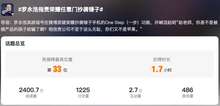 来源|极点商业 荣耀小米等众多主流科技大厂都多次被指抄袭模仿,其中包括科技巨头苹果——翻开其发家史,就写满了各种“抄袭模仿”。这背后,到底是因为什么? 如果不是周鸿祎程前两代人互怼引起的热度太大,被罗永浩公开“抄袭炮轰”,荣耀或许难以避免更大争议。 1月10日,荣耀在上海举办声势浩大的发布会,宣布推出MagicOS 8.0,把荣耀带入“魔法世界”。 其中,重点宣传的功能——也就是基于荣耀AI端侧大模型的“任意门”,用户可以拖动文字信息、图片至其他APP交互,将传统多步操作变成一步操作后,坐不住的罗永浩,用小号公开怒斥,称荣耀“任意门”抄袭锤子手机的One Step(一步)功能。 “这就是赤裸裸照抄锤子手机的One Step啊,赵老师是不是被做产品的孩子给骗了?相信贵公司不至于这样,你们又不是苹果。”罗永浩如此直接喊话荣耀CEO赵明,“嘲讽”味道浓浓。 ![]() 面对如此“指责甚至嘲讽”,荣耀很快发表声明,强调“任意门”是公司自主研发成果。而在Magic6系列发布会的媒体采访中,赵明更是回应:我没看到微博(罗),送他一部手机用一下。 这种回应相当强硬。截至目前,罗永浩并未就此进一步表态。但有不怕把事闹大的网友,希望两者继续开怼或硬杠——表示虽然荣耀公关能力很强,但罗永浩单兵作战能力也有目共睹,谁胜谁负尚未可知。 其实不止荣耀,小米等众多主流科技大厂都多次被指抄袭模仿,其中包括科技巨头苹果——翻开其发家史,就写满了各种“抄袭模仿”。这背后,到底是因为什么?又应如何去重新审视科技创新真正含义? 01荣耀“抄袭罗生门” 众所周知,技术创新一直是智能手机的重要推动力,也是行业市场竞争焦点。无论是苹果,还是华为、vivo、OPPO、小米、荣耀,所有主流厂商新品发布重头戏,都是产品功能、设计理念的创新宣传。 这意味着,一旦背上抄袭名声,手机厂商不仅会被广泛争议,还会直接影响消费者信任度,甚至失去市场核心竞争力。同样,也会对市场健康生态、行业技术创新造成严重伤害。 此前最近一次手机主流厂商被指责“抄袭”,是去年12月的2023年花粉年会上,余承东指责称,友商抄袭时称不太尊重华为知识产权,双旋水滴铰链直接变成龙骨铰链,龙骨是不存在的。尽管余承东并未直接点名,但谁都知道是小米,小米亦不得不紧急发表声明。 作为市场直接竞争对手,从营销策略角度指责友商抄袭可以理解。 但罗永浩与荣耀,以及罗永浩和赵明之间并无公开恩怨,且退出手机江湖已久——从罗永浩人气来看,也不存在“碰瓷赚流量”想法,更多可能是对手机创业失败后,创意被他人抄袭的“意难平”。 因此,外界也格外关注,荣耀“任意门”到底有没有抄袭锤子一步(One Step)? 根据公开资料,One Step是锤子科技软件团队开发的经典功能之一,只需简单拖拽操作,就可以完成跨应用之间的信息互通,首发机型是2016年10月发布的Smartisan M1系列。当年12月,锤子科技表示One Step功能在GitHub平台开源,手机厂商、应用开发者都能修改并使用此功能源代码。 ![]() 2017年4月,谷歌申请并获得了一项专利“Drag-and-drop(拖放操作)”中,其功能很像One Step的升级版。其拖放操作可应用于文本、图像、文件等任意格式及介质的数据中,并支持第三方APP接入。 诸多业内人士并不否认的是,荣耀“任意门”从设计理念、操作逻辑上来看,和锤子One Step的确有相似之处。有手机资深行业人士就表示:“看海报时就发现,‘任意门’侧边栏几乎和‘一步’一模一样。” 站在荣耀角度,以罗永浩的行业地位、影响力——在社交平台公开指责自己“抄袭”,显然无法接受,且后果难以估量。 荣耀研发管理部总裁邓斌很快站出来回应:“任意门”是荣耀独立研发的、基于意图识别的交互逻辑,核心是背后的平台级 AI 能力,在那个时代是完全没有的。 此后荣耀官方、荣耀CEO赵明都下场否认“抄袭”。赵明在接受媒体采访时表示,荣耀的任意门功能可以追溯至第一代Magic live上,那时就已经实现了一步直达的功能。 不过,荣耀也并未否认,“任意门”在功能上与“OneStep”有一定相似性,但同时强调,技术实现、细节处理和用户体验方面,两者存在显著差异。 ![]() 截至目前,荣耀“任意门”到底是否抄袭,仍是“罗生门”——认为抄袭者认为,两者过于相似,且宣传“新一代”“首发”有吹牛之嫌,即便开源也需注明出处或致敬;反对者认为,手机行业功能相似是常事,“任意门” 功能核心不是快捷方式,核心是背后的平台级AI能力。 在部分业界人士看来,荣耀至少在营销宣传方式上存在问题。魅族前高管、怒喵科技(AngryMiao)创始人李楠就疑问,荣耀营销是否完全不懂 AI 。 “如果他们(荣耀)真的匹配了一个大模型,学习用户拖拽操作提供目标应用的‘任意门’,和那种 GUI 时代的古董是完全两码事。”李楠称,不懂技术的普通消费者,可能被表面现象忽悠。AI时代的新功能,用所谓“意图识别”含混不清的表述反驳,“(荣耀)到底是真不懂,还是不自信。” 02大厂"COPY”潜规则 其实,从硬件到软件,从命名到营销的抄袭、模仿、借鉴,在手机行业长期存在。 无论是国产智能手机“模仿借鉴”苹果iPhone,国产智能手机相互“借鉴”,还是苹果iPhone“抄袭”国产智能手机,都已屡见不鲜,口水战从未停歇。 ![]() 比如,iPhone 4的外观设计、iPhone 5S指纹解锁、iPhone 7的双摄、iPhone X的齐刘海,从外观