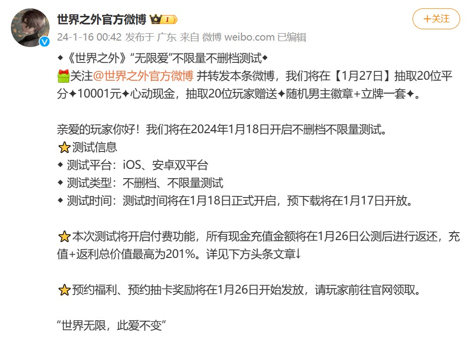 来源|游戏新知 叠纸的重磅新游《恋与深空》在今天(1月18日)上线了。另一边,网易也有一个女性向新游《世界之外》定档1月26日公测。两款游戏的宣发大战从几天前就开始打响,游戏新知各个社交平台的首页几乎全被他们的买量广告刷屏了。 没想到前天凌晨,《世界之外》突然宣布在1月18日开启「不删档不限量」测试,期间开展最高价值201%的充值返利活动。这实质上是变相提前上线了,似乎是要主动宣战,有意与《恋与深空》一较高下,火药味一下就浓了起来。今天,《世界之外》早于《恋与深空》两个小时正式开服。 ![]() 《世界之外》这款游戏本身就挺神秘的。游戏最早在2022年4月首曝,然而之后很快就没了声音,一度有消息称项目很可能被砍。2023年4月,游戏又唐突「复活」,发布「重逢」等关键词后逐步恢复了消息更新。那之后至今,游戏已陆续进行了两次线下测试和一次线上测试,目前在TapTap平台积累了50万次预约。 这款深藏不露的储备产品今天终于揭开了面纱,还真是一款很有特点的游戏——即便是在今天这场规模难得一见的「女性向游戏乱战」中。无论是游戏本身,还是这场乱战,都颇有看点。 一个更注重故事本身的游戏 《世界之外》从始至终都在着重宣传,这是一款「无限流言情手游」。所谓的「无限流」是一种近些年很火的网文设定,主角一般与一个类似神明的「系统」绑定,在其指引下穿越在无数个世界里,完成各种各样的任务,获取一定的奖励来强化自己,就像在游戏中挑战不同的副本。快节奏、迥异的世界设定、永远从零开始的挑战,是这类网文的最大看点。 《世界之外》也是基于类似的故事框架展开,只不过女主在这无数个世界里都会与男主们相遇,男主们的身份则随着世界设定不同而不断变换。游戏着力渲染的特色就在于,在变换的世界和变换的身份中,男女主角间不变的爱意。乍一听起来还挺浪漫的。 然而游戏实际玩起来,反而不像是一款游戏,更像是一篇可以互动的网文。这不仅指的是故事设定与玩法的融合,也是指核心的情感逻辑。 我好像真的穿越了 玩法架构是给我留下印象最深的地方。游戏的界面UI、操作逻辑都高度融入了故事设定,与当下的常见设计有所区别。 这得先从故事设定讲起。某天女主打开了一款新游戏,注册后却穿越到了一个惊险的任务里。系统告诉她,她必须完成任务目标才能返回现实世界,否则会被永远困在这个世界里。任务成功后,她可以在现实世界中短暂地继续生活,不久后又会有新的任务来临。女主于是被迫一次又一次地被系统塞进任务世界,再为回归现实而努力完成任务。 在设定上,女主无论在任务世界还是现实世界,都可以让意识随意进入系统的「主神空间」,来管理自己的能力、系统资产和任务清单,就像是普通游戏的主界面一样。因此,游戏干脆将主界面设计成了两个部分:一部分是现实或任务世界,取决于当下的情节进度;另一部分是主神空间,商店、抽卡、卡牌养成、副本等功能都在这里。这两个部分可以随时切换,就像女主可以在任意时候进入主神空间。 ![]() 对故事的展现占了游戏玩法的绝大部分。在主线故事中,除了传统AVG形式的图文故事之外,还需要一定的线索收集、探索和选项抉择。不过这些部分的难度并不大,基本上只要哪里高亮点哪里就可以了。比如下面两张图片中,该点什么相当显而易见。这在最大程度上保证了故事情节的连贯性。 ![]() ![]() 值得一提的是,游戏中似乎运用了语音AI技术,玩家自定义的名字可以被男主念出来,而且听不出什么异样,无疑能大大加强代入感。这事还热热闹闹上了一波微博热搜。 ![]() 情节中有时会触发战斗,不过也同样突出一个速战速决,尽量不影响情节节奏。战斗过程表面上是通过点击与男主的卡牌「互动」来提高数值,实际上CG图并不会动,只会播放一句语音。因此战斗过程毫无操作空间,只是单纯的数值比大小,操作难度无限降低了。 ![]() 为了加强沉浸感,连各种资源副本也被设计成了系统发布的支线任务的形式。角色副本则被设计成了主线任务的分支,是对主线任务故事的补充,玩家可以从中增进对单个角色的了解。这些副本也带有大量的故事情节,文本可以说是量大管饱了。唯一的缺点是重复刷资源副本时没法直接扫荡,只能跟着故事再点一遍,有点麻烦。 这种玩法与设定深入融合的效果,也是「无限流」设定的一种与生俱来的优势,毕竟它本来就很像是主角在玩游戏。而能够将设定确实地表现在游戏的整个流程中,这是《世界之外》做得比较出彩的地方。 但是我不是来谈恋爱的吗? 然而玩法与设定紧密融合,似乎也不全是好事。游戏过程中能感觉到,由于跌宕起伏的故事本身格外引人注意,女性向游戏最重要的情感体验反而有点被淡化了。 这同样要从故事设定说起。主角初次穿越人生地不熟,面对的第一个任务就险象环生,不仅要面对近似于杀人兵器的怪物,还要与各怀鬼胎的NPC和其他「玩家」周旋,几乎疲于保命。相比之下,谈恋爱似乎就没那么重要了。尽管几位男主先后对女主又是贴身保护、又是壁咚,做了不少亲密举动,但玩家难免只会想着「如何利用这个人活下来」。 ![]() 另一方面,设定上女主是先进入主线故事、完成这个惊险的任务,再进入角色副本,去到同一个世界的更早的时间节点,与每个男主好好地相遇相识。因此
