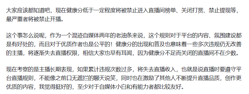 来源|锌刻度 2024年1月3日,抖音宣布直播新版“健康分”处罚正式生效。这一“最严新规”既标志着抖音对直播内容的管理进入了新阶段,也似乎暗示了直播行业将迎来的新变革。 如今该新规已实行两周有余,不少主播不得不变,表示“都不会说话了”,也有主播晒出经专业主播申请得到的“120分最高分”。而从用户端来看,与新规相关的讨论区,大多对此持认可态度,其中不乏“早就该整顿了”“低俗的太多了,确实该管管”的评论。不过,也有不少用户认为规则总会有漏洞,“实际意义不大”。 无论规则实行效果如何,随着行业监管收紧,多个直播平台开始更新完善平台规则,并针对虚假宣传、恶俗炒作等违规行为进行内部治理。在这一背景下,直播行业泡沫逐渐消退,赛道即将迎来新的转折点,而跟不上变化速度的主播和MCN公司,将迎来淘汰。 谁在为喜欢的主播担忧? 据了解,抖音“健康分”正式生效当天,有303名主播被关闭礼物功能,近5000名主播当日被减少直播推荐、限制功能甚至永久回收直播权限,同时也有27500名主播通过了专业或优质申请。 事实上,在抖音新规生效后,无论是小红书、微博还是抖音,都出现了非常多相关讨论和视频内容。而相关视频的评论区出现了许多类似于“这让我们阿梅怎么办啊?”“完了陈泽汗流浃背了”“秦世纪这回真得写个贴纸提醒自己”此类的评论,而其中被提到的,均为游戏主播。 “游戏主播直播时常常都会掺杂一些脏话,甚至很多粉丝就是因为这种直播风格被吸引而来。”桃子常常看游戏直播,她发现,最近不少游戏主播在直播时都会更注意用语,甚至有一些主播在脏话欲出时“急刹车”,“很多粉丝都说快把主播憋坏了,毕竟健康分还挺重要的,很多主播玩游戏时一激动就忘了谨言慎行,现在只能强行纠正。” 事实上,除了游戏类主播屡被“提名”,也有不少擦边、售假博主被网友反复@,并表示“建议一次性扣掉这种低俗主播的分”“赶紧给卖假货的直播间封了”等。 ![]() 据抖音平台官方介绍,抖音“健康分”制度将通过监控主播的日常直播行为来增减账号的分数,并据此对账号进行分级管理。分值低的主播将面临严重的后果,如关闭礼物功能,甚至失去直播权限。主播的初始分值为100分,表现优异者可获得高达120分的初始分值。违规行为将导致扣分,扣分的幅度取决于违规程度、主播等级和影响力。例如,粉丝数或直播间观看人数较高的主播,违规时将被额外多扣1-5分。这种分级制度意味着主播的日常行为将直接影响其账号的收益和生存空间。 具体来看,一旦主播的“健康分”低于某一阈值,将面临严格的限制。例如,分数低于70分的主播会被减少推荐,并限制PK次数;低于40分的将禁止使用PK功能;若分数低于20分,还将失去礼物收入功能。最严重的情况是,当分数降至0分时,主播将永久失去直播权限。 监管屡屡加码,但总有漏洞? 值得一提的是,“健康分”是动态的。在扣分和处罚后,主播还能通过完成线上学习或持续合规直播获得加分。根据规定,主播累计5天每日直播2小时以上且无违规,可以增加5分。而对于屡屡犯错的低分主播,如果想从10分开始,上升至20分,摆脱“没有礼物”的困境,则需要无违规直播10日以上,且每天不少于2小时。如果想回到正常分值,则需要累计合规直播50天。 而这一点也被不少用户认为“存在漏洞”。在知乎上,“如何看待主播因健康分不足只能「免费直播」的现象,这种制度对直播行业发展是好是坏?”的提问下,有网友评论道,“没有意义,分数能扣就能加回去。到了一定的利益程度扣不扣分就是摆设。斗鱼不就老说什么扣分公益,结果我们审核超管天天收担保加分邮件,而且有些主播直接内部通告,不许你扣分。”同时,也有不少人质疑平台初衷,认为这是因为“平台不想发钱,就扣点健康分”,毕竟,健康分与主播的收益紧密挂钩。 锌刻度留意到,在小红书等平台,已经出现了“健康分回分指南”“直播过程中被扣分了,不用担心”等笔记。 不过,从整体来看,大部分用户对此都表示支持,而许多中小主播也认为这是一个好迹象。“很多恶意炒作、刻意炫富、低俗表演的直播间因为门槛低,但流量大,之前反而能够比老老实实做直播的小主播更容易盈利。”Grey之前曾在多个平台尝试过直播,但最终都因流量差而关闭了直播间,“赛道太乱了,对小主播其实很不友好。但是如果能够规范赛道,有价值、守规则的直播间或许就能被更多人看到。” ![]() 事实上,这已经并非抖音首次加码直播监管。据公开信息,抖音“健康分”制度早从2023年9月开始试运行,扣分规则与正式实行的“健康分”制度差别不大。而更早些时候,2022年4月,抖音直播就曾推出健康分管理制度,但彼时的健康分制度主要面向公会机构,针对公健康分分值区间,平台的处罚措施如下:公会健康分≤ 80 分,平台将予以公会警告,并加以约谈整改;公会健康分≤ 70 分,平台将暂停公会结算权限一个月,并公示通报;公会健康分≤ 60 分,平台将扣除当月公会收益100%金额,并公示通报;公会健康分≤ 50 分,平台将对公会进行清退处理,并公示通报。 从“颜值”到“价值”,行业求变 “抖音要求这么严,主播会不会流失到其他平台?”在不少社交媒体平台,陆续有类似的声音出现。事实上,对直播的管理或许将成为更多平台的常态。 其实快手此前也多次规范直播管