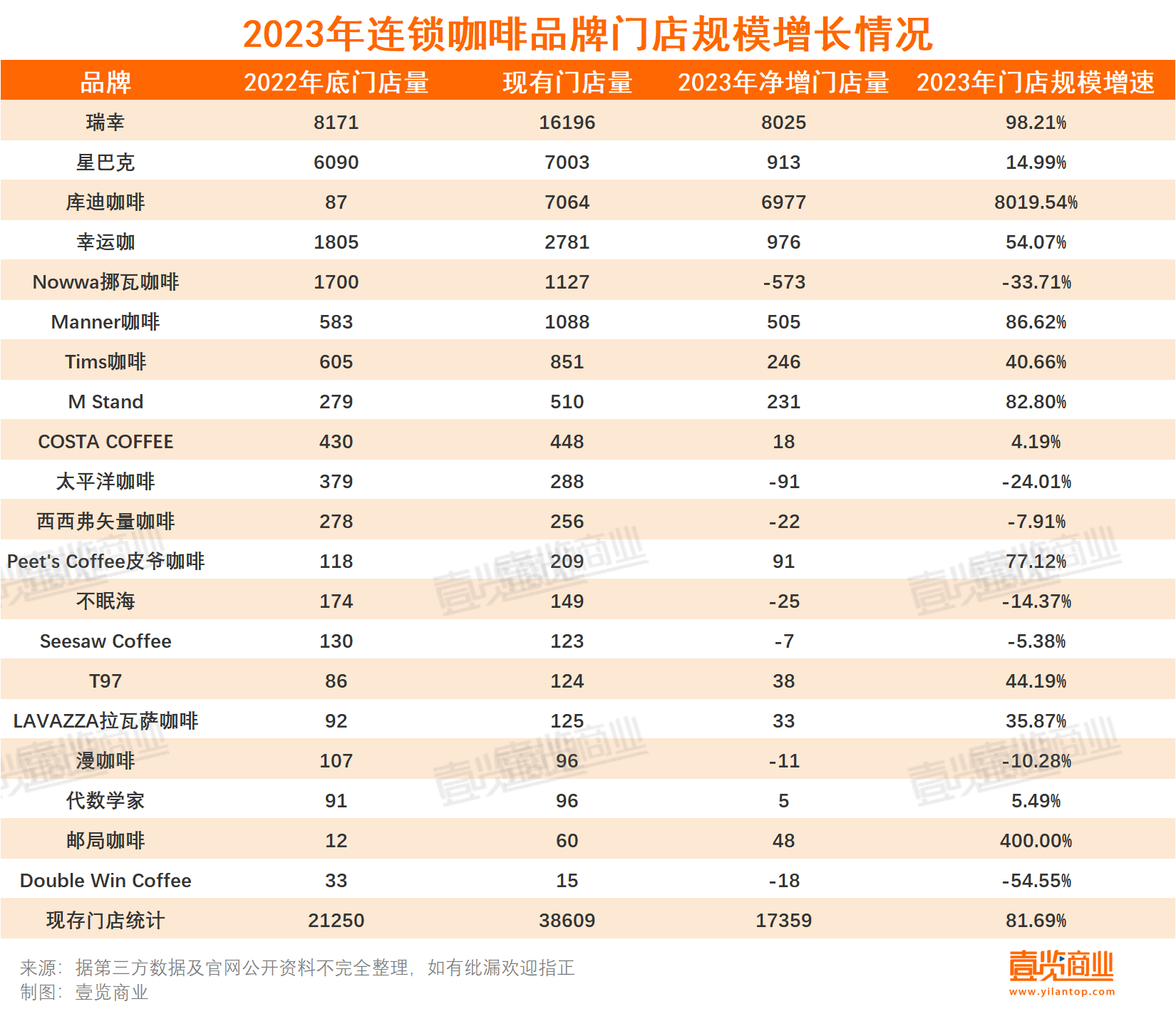 出品/壹览商业 作者/李彦 编辑/木鱼 2023年,连锁咖啡走进高速发展阶段。 从门店总量来看,壹览商业长期跟踪的20家连锁咖啡品牌以81.69%的增速从2022年底的21250家门店扩张至38609家门店。 从单品牌门店扩张来看,有13个连锁咖啡品牌完成了净增门店量为正。其中,除了库迪在一年内实现门店从87家到7064家的爆发性增长外,有10个品牌增速呈两位数增长,1个品牌增速呈三位数增长。 ![]() 据iiMedia Research发布的数据显示,2021年中国咖啡行业市场规模达3817亿元,预计2025年我国咖啡市场规模将达10000亿元,以27.2%的增长率不断上升。 38609家 在整体市场快速增长的背景下,各连锁咖啡品牌交出了自己的“年终答卷”。 ![]() 2023年,瑞幸咖啡第10000家门店落地,成为了第一家本土门店数量破万的咖啡品牌。库迪咖啡野蛮生长,一年开出门店7000余家。 伴随着连锁咖啡品牌狂飙,咖啡的价格在2023年,被彻底打下来了。 而就在2023年2月,库迪发起的“百城千店咖啡狂欢节”,剑指瑞幸,打响了咖啡“9.9元时代”的第一枪。随后,瑞幸上线“9.9万店同庆活动”、库迪咖啡在抖音推出了“8.8元任意购”活动,逼得星巴克也上线了19.9的限时优惠。蜜雪冰城旗下的幸运咖也迅速加入战局,推出9.9元两杯的活动。 低价背后,咖啡品牌连锁化率不断提高。从过去三年连锁咖啡品牌的拓张门店数可以看到,无论是”9.9“价格战的参与者瑞幸、库迪、幸运咖、挪瓦咖啡,还是聚焦精品咖啡赛道的Manner咖啡、Tims咖啡,都在2023年加紧了扩张步法。 各品牌的覆盖城市量也侧面反映其拓张策略的差异。例如,即便瑞幸整体门店规模数量是库迪的两倍,已覆盖城市量却仅有311城,不敌库迪的327城。精品咖啡这边,现有门店总数破千的Manner咖啡,仅覆盖55城,现门店总数851家的Tims咖啡却已覆盖65城。也就是说,瑞幸、Manner咖啡更偏向于高密度,库迪、Tims咖啡更偏向走得远。 按季度划分来看,这20家连锁茶饮品牌分别在2023年四个季度新开门店约2692家、3780家、5774家、8686家,扩张量逐季攀升。 ![]() 虽然整体规模呈上升态势,咖啡赛道的生意却并不好做。一方面,头部咖啡企业竞争激烈,出现了第一家万店咖啡品牌;另一方面,在扩张与“价格战”的主旋律背后,咖啡市场的“优胜略汰”表现得更为淋漓尽致。 17亿热钱的赛场 作为国内最火热的消费赛道,在2023年,咖啡赛道共发生24起融资,累计金额17.31亿元。 总体来看,咖啡赛道的融资正在不断朝向垂直化、细分赛道发展。例如,茶愿说定义为盲盒咖啡品牌、蓉小乔咖啡主打果咖、奢啡CEPHEI主打功能性咖啡。显然,现阶段,没有特点的咖啡品牌将很难吸引资本的加入。 ![]() 受到资本青睐的咖啡赛道,同样吸引了新茶饮品牌的注意力。 据壹览商业统计,至少有7家新茶饮品牌已拥有自家咖啡业务线。其中6家茶饮品牌推出了旗下咖啡子品牌。蜜雪冰城是最早推出咖啡子品牌的企业,早在2017年蜜雪冰城便推出了咖啡子品牌幸运咖,截止目前全国已拥有2781家门店。 今年以来,新茶饮迈向咖啡的现象更加普遍。年初,古茗推出闪萃咖啡系列,4月沪上阿姨推出子品牌沪咖鲜果咖啡,11月末茶饮品牌茶百道则是被爆出正在尝试旗下咖啡子品牌咖灰。 香颂资本董事沈萌曾指出:“茶饮新投资咖啡项目,是在当前已经白热化竞争的咖啡市场以己之短攻彼之长,需要投入更多资源与现有品牌抢夺份额,但如果是投资现有品牌,则是将自己在茶饮领域的资源与咖啡品牌做资源整合,争取‘1+1>2’的目标。” 除了茶饮的虎视眈眈,其他赛道也在入局连锁咖啡赛道。 时尚品牌和咖啡店强强联手成为潮流:8月,Vans与咖啡店品牌GREEN HOUSE在广州开设“GREEN VANS 限时咖啡店”;6月份,国际奢侈品牌LV(路易威登)和中国咖啡品牌Manner在上海开出联名限时书店。11月,眼镜品牌Ray-Ban雷朋中国首家品牌体验店在上海市中心淮海路开业,与此同时,全国首家雷朋咖啡也正式开业,据悉,其门店主要产品为意式咖啡。 除了时尚圈外,脑白金也想试水咖啡赛道。11月末巨人集团旗下脑白金咖啡首家快闪店,在上海市淮海中路武康大楼邮政所开业。据了解,该快闪店由脑白金与合作伙伴共同打造,为期一个月。脑白金品宣负责人向媒体表示表示,试水咖啡,正是脑白金品牌年轻化的一次新尝试。 资本青睐、大量品牌跨界背后,却有大量咖啡门店倒在了2023。 闭店、淘汰 相较新茶饮赛道,壹览商业长期追踪的20家连锁咖啡品牌的厮杀更为激烈。诸多品牌出现了大规模关店的情况。比如,挪瓦咖啡相较与2022年底门店数少了500余家;不眠海去年全年仅开出5家门店,总体门店量减少25家;太平洋咖啡近三年新开店面逐年递减,2023年更是规模缩水三分之一;另外,Seesaw coffee、Double Win Coffee整体数量也呈负增长。 咖啡品牌们,各有各的难。 以不眠海为例,壹览商业认为,不眠海咖啡一年仅开5家店,与其母公司便利蜂的营业状况脱不了干系。2021年5月,便利蜂以“店中店模式”推出饮品站“不眠海Sober Hi”,并在随后两月快速扩张至200余家。高峰期,不眠海的数量一度在500家以上。 然而,不眠海和便利蜂,到底是“一荣俱荣、一损俱损”。2022年起,便利蜂开始收缩阵线。截至去年4月,关店数量已经达到1000家。在便利蜂自身都难保的情况下,不眠海咖啡的发展自是更难乐观。据悉,部分便利蜂门店当中,不眠海咖啡的各类设备已经停运。 而背靠华润集团的太
