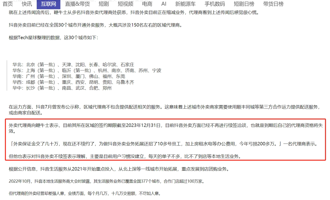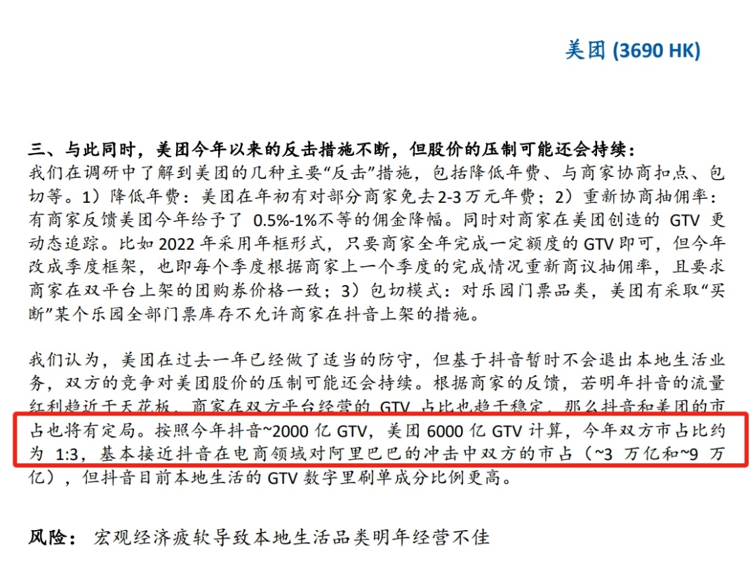 作者 | 刘亮 编辑 | 趣解商业 “抖音收购饿了么”传闻不断,一个月时间,被传了两次“结婚”绯闻,又连续两次被辟谣。 新年伊始,有媒体报道称,字节跳动收购饿了么尚存收购价格、饿了么团队去留两个分歧点。与2023年12月“抖音被传将以70亿美元收购饿了么”时相同的是,双方均坚决否认了传闻内容,表示没有此事。 抖音与饿了么在本地生活领域有相同的“对手”——美团,这似乎也是二者可以“走到一起”的理由,况且双方早在2022年就开始了合作。市场显然也会考虑这种可能性,2023年12月19日,“抖音收购饿了么”传闻初步发酵当天,美团股价盘中一度下跌超8%,甚至有网友认为该消息是为了做空美团(3690.HK)。 ![]() 图片来源:微博截图 抛开“这门婚事”不谈,近两年本地生活领域以抖音为代表的“后起之秀”和以美团为代表的“头部玩家”之间频繁过招;本地生活这个“老战场”,又有什么新变化? 01.抖音“来势汹汹” 抖音布局本地生活领域已不是新闻。 早在2018年,抖音就开始了在本地生活领域业务的试水;2021年底,抖音本地生活业务成为独立一级部门;此后其给自己设立的年度GMV目标,不断地往上跳。 起初,抖音用户只是能在视频中获取本地商家的优惠信息,购买团购券;现在,用户可以在抖音APP顶部菜单栏找到团购入口,其中不仅有丰富的垂类服务,还有热门榜单供用户参考;在商家页面中,还能看到用户发布的点评内容。 ![]() 图片来源:抖音截图 抖音也曾试水外卖业务。2022年,抖音一边与饿了么达成合作,另一边开始在北京、上海、成都试点高客单价的团餐外卖业务,通过与顺丰、达达等第三方平台的合作熟悉流程。 据“晚点LatePost”2023年6月报道,抖音外卖业务已放弃年内达成1000亿元GMV的目标,将重心转向跑通业务流程;而到了年底,据“鞭牛士”报道,抖音外卖正在缩减业务,抖音与部分地区的外卖代理商将不再进行续签洽谈。 ![]() 图片来源:鞭牛士官网截图 总体来看,根据“抖音生活”微信公众号发布的数据,2023年抖音生活服务平台总交易额同比增长256%,有超450万家门店在平台获得生意增长。 一年前,抖音生活给出的数据是“合作门店超100万,帮助超过28万个中小商家实现营收增长”。相比之下,美团在2010年成立,2015年与大众点评合并,到2016年在线商家数目才达到440万,2017年活跃商家(在平台完成过交易/买过在线营销服务/用美团支付系统处理过线下付款)数目达到440万。这组数字或许能体现抖音“攻城掠地”的速度。 海通国际研报预计,2023年抖音本地生活总交易额将接近美团的三分之一。 ![]() 图片来源:研报截图 具体而言,抖音先是推动海量达人去探店,给予流量扶持;同时与拥有丰富本地资源的服务商合作,用运营和推广服务置换签约。在达人、商家的带动下,本地生活视频成为了用户、粉丝最喜欢看的内容类型之一。 截至1月22日,抖音“探店”、“美食探店”话题视频播放量分别达783.6亿次、192.2亿次;用户刷个短视频的功夫,就被各类餐饮、酒旅门店种草,再结合团购券的使用,就形成了消费闭环。 ![]() 图片来源:抖音APP截图 不过,大部分消费者原本并没有在抖音买团购券的习惯。所以抖音拿出了另一个“武器”——低价,即通过降低对商家的抽成和提高对消费者的补贴,让商品价格更便宜,如此一来消费者经过比价,就可能会在抖音下单。 刘畅(化名)就是被抖音低价吸引的消费者之一,根据他的经验,抖音确实在很多店铺相同套餐的团购价格都比美团低。“现在去吃之前都要对比一下,哪个便宜用哪个。” 02.美团发起“反攻”? 抖音的“猛攻”,似乎让美团有了紧迫感;2023年,美团开始发起“反击”。 美团在App首页上线了短视频和直播的一级入口,还做出了“神抢手”和“爆团团”两大直播IP。据“36氪”报道,直播一级入口刚上线的7月,美团直播单月GMV约5-6亿;至10月,美团直播单月GMV已突破20亿元。 ![]() 图片来源:美团APP截图 此外,美团也大力推进补贴,上线“特价团购”板块,同时一定程度降低对商家的抽佣。据“亿邦动力”报道,美团将部分餐饮商家服务费率由8%降到4%。 财报正是美团为此付出的真实写照。2023年三季度,美团的销售及营销开支为169亿元,同比增长55.3%;本地商业板块经营利润101亿元,经营利润率17.5%,同比下降2.6%。美团称,经营利润率下降主要是由于较高的补贴率。 值得一提的是,2024年伊始,美团高级副总裁、到店事业群总裁张川在内部信中还对比了美团历来的“对手”。 在张川看来,互联网进入存量竞争后,上个阶段获胜的巨头会侵入新对手的领地,展开更激烈的斗争。而现在的对手,在打法、策略、组织和资源方面,和上个阶段的对手不可同日而语;张川认为美团过去打败的对手都有弱项,这次来的对手则很全能。 ![]() 图片来源:微博截图 虽然张川没有明说,但在团购领域,美团过去的对手是显而易见的。 阿里便是其中之一。从口碑网、聚划算、淘点点到饿了么,阿里一直对本地生活寄予厚望,也总是能先对手一步布局,但最后的结局也总是难尽如人意。 曾经的口碑,全年成交总额一度高达4200亿元,领先美团600亿元位列行业第一;曾经的饿了么,致力于拿下50%的外卖市场份额。但如今,阿里本地生活服务板块下的到店业务已经与高德合并。 据阿里巴巴(9988.HK)财报数据,2023-2024财年的上半年(2023年第二、第三季度),阿里本地生活集团经