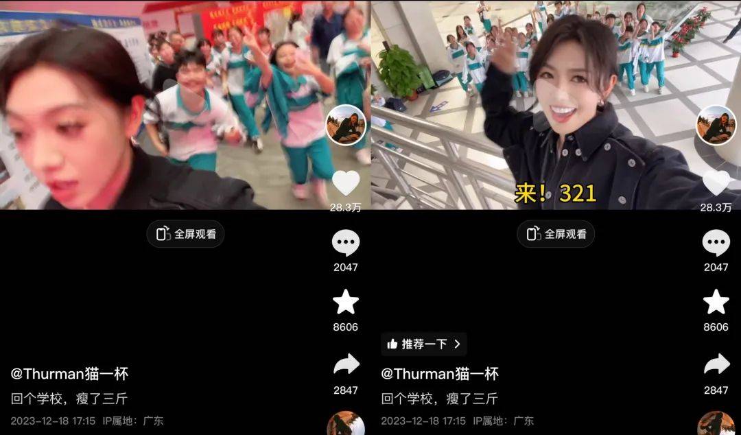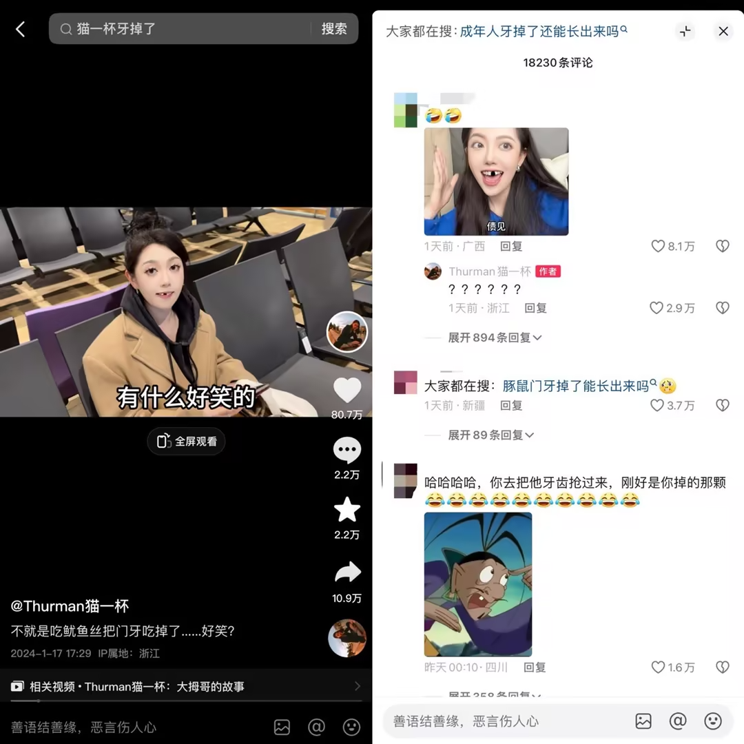 作者 | 小八 编辑 | 松露 靠唠嗑收获千万粉丝关注,是一种怎样的体验? “Thurman猫一杯”或许深有体会。从2020年4月发布第一条吐槽法国快递时效的视频开始,她几乎事无巨细地分享生活日常,吸引粉丝们与之互动,还诞生出多个花名。 不管是她啃菜叶子的酷似程度被唤作“豚鼠”;还是她弄丢自己竖大拇指照片做屏保的手机,获得“广州白云机场大拇哥”的称号……这些片段在她的讲述中好笑又离谱,像是在听身边好友唠嗑聊八卦。 ![]() 或许是天性乐观使然,每当“Thurman猫一杯”遇到这些看似离谱事件的时候,她总会用司空见惯的幽默语气分享调侃,有时还会一人分饰多角模仿其他人的反应。 最近,她在机场吃鱿鱼丝崩掉大门牙,第一反应是“遇到事情不要慌,先掏出手机自拍几张”,并将这次掉牙经历列入选题库。 1月17日,她分享了这段机场奇遇,并模仿空姐看到她忍不住憋笑的样子,该条视频在抖音获得了超1800万次的浏览和80万点赞,评论区纷纷调侃她那颗缺失的门牙。 ![]() 与其说“Thurman猫一杯”是天生喜剧人,不如说她能够主动捕捉到生活中的创作灵感,任何一件小事都有机会触发她的选题雷达。这不仅让她在近3年间创作出多个点赞量超百万的爆款,也积累了超4000万的全网粉丝。 拥有近10年旅法求学工作经验的她,也逐渐向外界展现出自己的专业能力:曾在巴黎担任国际奢侈品牌设计师、回国后创立自己的服饰品牌……搞笑女和设计师的身份反差,让网友惊叹于她并非是爱啃生菜的豚鼠(bushi)。 近期,我们对话了“Thurman猫一杯”,更加全面地了解到她的创作经历。以下,是她的自述。 01 “没有当时的亲身经历,我也做不了这么多期视频” 我是奔着服装设计去的法国,那时候压根没想过做短视频。 大学读完,我留在法国做了一段时间奢侈品牌设计师,想着以后开一个自己的设计品牌。 但2020年遇到疫情,工作停摆,一个人在家呆了一个多月没事干,看到有很多留学生拍抖音,我就觉得我是不是也能拍,因为我真的好久没说过话了。 “Thurman猫一杯”这个ID是无意之间组合而来的。 Thurman是我在法国的英文名,猫一杯是我高中给自己取得名字,小孩子喜欢没事喝点东西,我又比较谦虚,说只能喝一杯,再加上我眼睛比较大,别人喜欢叫我cat。 当时觉得横屏可以露出少一点,就顺手一个人在家举着手机拍的横屏。第一次对着镜头说话怎么都有点变扭,NG很多次,就一段一段地录,我喜欢按照BGM踩点剪视频,节奏感强一点。 一条40多秒的视频,从写脚本、拍摄到最后剪辑、成片,花了大概6个小时。 ![]() “Thurman猫一杯”早期作品 我很幸运,第一条视频发布后3个月抖音粉丝量就到了100万。 当时觉得非常不可思议,我在国外生活了太多年,遇到过太多乱七八糟的事儿,没想到大家会觉得有意思,是真的有点受宠若惊。 有网友说看我视频就跟听故事一样,放在国内简直不可思议,甚至挺危险。就像我在视频里说自己经常被偷,凌晨小偷还来我家敲门,那时候很害怕的,后来次数多了,习惯了,都能拿出来当乐子说了。 其实人的钝感很重要,你不要那么放大自己悲观的情绪,你做人就会很开心。没有当时的亲身经历,说实在的,我也做不了这么多期视频。 我也没想到法语会成为我的优势,有次我在视频里突然蹦出一句法语,好多网友说好好听,为什么不在视频里面多说一点,后来我在视频里就普通话、粤语、法语混着说,当然日常生活中不会这么说话的。 除了自己的经历,我也会在视频里分享家人朋友有意思的事情。 2021年,我奶奶在巴黎待了半个月,我就问爸妈记得奶奶在巴黎有什么趣事,我爸聊一点,我妈聊一点,我就把这些趣事整合在一起做出两期视频,总共加起来三分多钟。 我找选题的方式就是每天找不同的人聊天,可能聊着聊着就联想到一个选题,或者把日常生活中有趣的事情记录下来,有点像小学生写作文一样:“啊,今天是多么难忘的一天!” ![]() “Thurman猫一杯”讲述奶奶在巴黎旅游的作品 模仿是带动情绪和还原场景的一种方式,我从小就很喜欢模仿,所以经常在视频里模仿其他人物活动。 有网友说我长得像豚鼠,正好我做博主之前就养了一只,我就寻思学一个给网友看看,结果大家看完说更像了,就有了“豚鼠”这个绰号,挺好玩的,我也挺喜欢的。 很多东西和梗都是我事先没想到的,可能我承接得比较到位,所以就火了。 02 “多了老板这重身份,肩上的担子更重了” 2022年,法国疫情太严重了,我妈担心我安全,订好机票让我辞去巴黎的设计工作回国。 那时候我的抖音粉丝已经破了千万,跟破百万的心态完全不一样了,就觉得真的不容易,回国也能更稳妥地经营账号。 这期间有很多MCN问我要不要签约,我也跟一些MCN聊过,因为我最看重的是他们能不能给到内容上的支持,我的账号个人属性非常强,我很难依附其他人帮我去创作,综合衡量还是要靠我自己写稿创作。 趁着回国的契机,我组建了自己的团队工作室,一共5个人,包括剪辑、拍摄、商务。 写稿基本还是我自己来,有时候灵感可能啪地一下来了,自己写完拍完,当天直接就能发了,团队处理更多的是其他工作。 我做事喜欢要有一个结果,毕业留在法国就是想提升自己的设计能力。回国后,我不想只做一个全职博主,学了这么多年设计是可以沉淀出一些东西的,于是创建了原创设计品牌CANX和THURMAN,主要做服装和饰品。 ![]() “Thurman猫一杯”