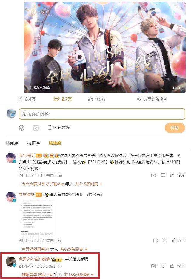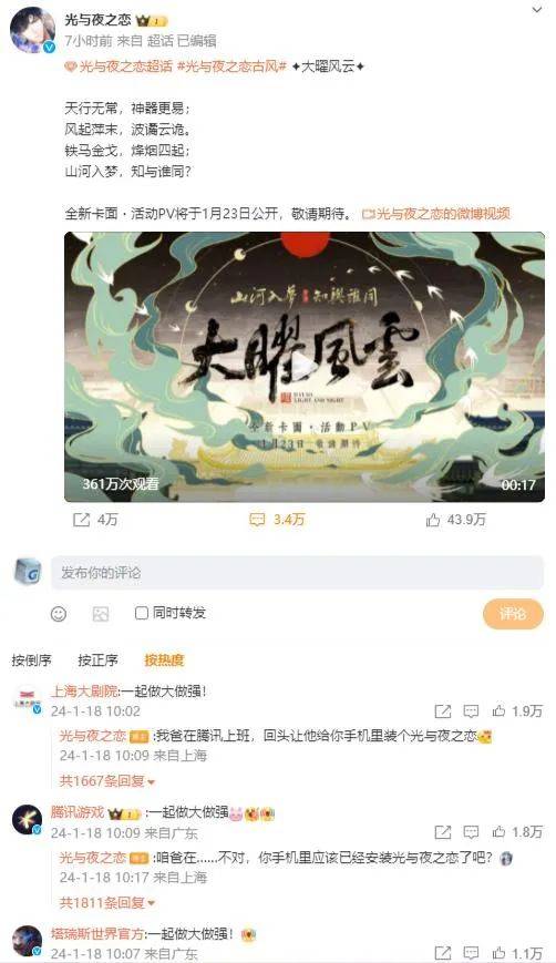 来源:游戏智库 1月18日,对于国内女玩家来说,幸福来得着实突然。 自从《恋与深空》和《世界之外》分别在去年3月和11月取得版号后,国内玩家对他们的期待和催促就变得愈发强烈,而这两款产品也很迅速地回应着玩家们的期待,但是以“1+1>2”的形式。 1月18日早8点,网易旗下的女性向无限流言情手游《世界之外》正式开启“无限爱”不删档不限量测试,就在一个小时后,叠纸游戏旗下的近未来幻想高沉浸3D恋爱游戏《恋与深空》也迎来了正式公测,这也让两款具备相当声量的女性向游戏间的“隔空对话”成为可能。 ![]() ![]() 《世界之外》与《恋与深空》能在同一天来到舞台中央,无论是游戏行业,还是国内玩家,都感到始料未及。《世界之外》也在《恋与深空》和《光与夜之恋》的官博下留言“一起做大做强”,鼓励彼此都能取得亮眼成绩,且在玩家推动下,该留言迅速成梗,带动无数玩家一起嗨。 ![]() ![]() ![]() 当然,玩家的态度自然是游戏多多益善。纵观各大社交媒体的评论区,除却期待和深度讨论,高呼“啊?????幸福居然来得这么突然!”“两款游戏同时上,要玩不过来啦”的声音不在少数。 不过更让人始料未及的是,1月18日竟变为了女性向游戏的“大联欢”。 你方唱罢我登场 1月18日的微博热搜,堪称女性向游戏的你方唱罢我登场,更被很多人称为是“国乙巅峰对决日”。 ![]() 《世界之外》和《恋与深空》的相继上线,迅速激起了玩家们的空前讨论,“世界之外开服”“世界之外 男主叫我名字”“世界之外 美丽的精神状态”“恋与深空正式上线”“恋与深空登顶”等一众词条相继登上微博热搜。尤其是《世界之外》男角色能呼唤玩家名字的乙女游戏首创,更是让一众女玩家疯狂讨论到底是要认真起个名字“聆听他的呼唤”,还是走搞笑整活路线“开心每一天”。 ![]() 不过在微博热搜上,除了两位新朋友,还出现了许多老朋友。 被称为四大国乙之一的《光与夜之恋》,在18日上午10点公布了全新卡面・活动PV✦大曜风云✦,以“铁马金戈”为古风新卡面设下悬念,同时还公布了截至目前有超54万设计师成为豚门弟子等一系列趣味数据,此举也推动“光与夜之恋古风”“光与夜之恋电话”等词条登上微博热搜。 ![]() 同样身居四大国乙行列的《时空中的绘旅人》也是放出了新版本「漆灯夜照」的前瞻预告,其灵异气息与闪烁斑驳,让许多玩家开玩笑地表示“我胆子小别吓我”。 《以闪亮之名》则是携“以闪亮之名新大地图”话题冲上微博热搜,该作在2023年女性向游戏赛道大放异彩,而在18日上午,其官博宣布了闪亮大地图计划即将起飞的消息,并预告将在1月27日放出更多详细内容。微博上很多玩家直呼难道《以闪亮之名》要进军开放世界?不过也有玩家表示虽是新大地图,但和开放世界探索肯定有差别,以此来给此事降温。 ![]() 《代号鸢》也是光速回国想要分一杯热度,“代号鸢甘宁 狂野小狗”词条的出现,也着实符合该作注重题材、包装等外在等方面发力的特质。 无数产品选择在1月18日,这个“良辰吉日”相继发力,颇有一种女性向产品“报团取暖一起疯”的既视感,确实有不少玩家感慨游戏行业终于疯成了我想看到的样子。诚然,疯是真的,快乐也是真的。 ![]() 毕竟,国内女性向游戏市场好久没有这么热闹了。 从女性角度去思考 近两年,国内女性向市场赛道开始变宽已是不争的事实,这是国内游戏产业进一步趋向精品化、IP化发展所引发的连锁反应。 上述趋势,让玩家的细分需求得到重视与放大,导致更多更为精细、多元的题材和玩法浮出水面。 同时,女性玩家的思维也在发生转变,对于“独立自主”“去污名化”等需求的强烈,驱动着后来者去摒弃旧有思路,用新眼光看待问题。更关键的是,出于反感同质化和套路化,女性玩家开始愈发青睐更创新、眼前一亮的玩法,甚至是以纯粹的女性角度思考、创作的可能,这也是为何主打女性向开放世界的《无限暖暖》在曝光初期,就有无数人对它投注巨大期待的原因。 ![]() 也是思维的转变,让许多产品开始主动拥抱变化,比如站在娱乐圈视角叙事的《绝对演绎》和《璀璨星途》;古风架空背景,走大女主路线的《凌云诺》;都市微恐悸动解谜手游《黑猫奇闻社》等,它们活跃于2022年与2023年,只可惜源于自身问题和市场下行,并未获得过于积极的反馈。 且2022年由于外部环境与版号问题,使得女性向游戏赛道开始降速,2023年虽然版号发放频率增加,但宏观经济尚显底气不足,女性向赛道也鲜有亮眼新品出现,老产品在存量竞争中有着天然优势,也一定程度上压制了后来者,所以整个2023年,只有《以闪亮之名》快步向前,整个赛道也显得有些冷清。 ![]() 2024年的一系列动作,似乎宣告了国内女性向游戏市场再度热火朝天,1月2日公测的《浮生忆玲珑》已率先开跑,而18日《世界之外》和《恋与深空》又带动了大家前来“团建”。 不过《世界之外》和《恋与深空》不止带来了热度,在大环境影响下,乙女游戏市场也在悄然改变,两款产品也用行动诉说着这些改变。 以《世界之外》为例,选择无限流言情这一方向就已注定了该作的不寻常,“无限流”最突出的优势就在于它的不设限,玩家可以在游戏中感受多样的世界观,书写更多新颖故事,创造无限的可能。 ![]() 这种设计思路,本身就比较超脱于当下女性向赛道的传统思维,像是在
