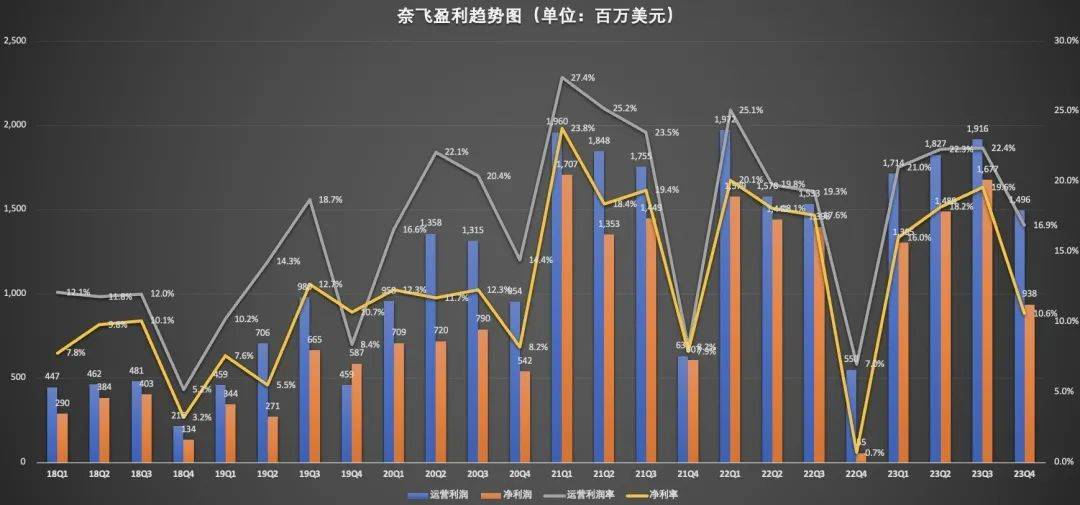 出 品 | 异观财经 作 者 | 夜叉白雪 回想起2023年初,奈飞宣布将财报的重点从关注用户数量转向关注盈利能力和可持续性,然而,在2023年的第三、四季度,奈飞在付费用户净增方面的表现却非常抢眼,连续两个季度创疫情红利消失后增速新高。 1月23日周二美股盘后,流媒体巨头奈飞公布了2023年第四季度财务业绩报告。在打击密码共享行为的举措下,奈飞全球净增用户1312万,再创新纪录,将付费会员总数推至2.6亿的新高。这是否意味着奈飞正在恢复往日的辉煌? 净增1312万新用户,破15个季度最高增长纪录 财报显示,2023年第四季度,奈飞全球净增1312万新用户,远超华尔街预期的890万。值得一提的是,奈飞在Q3创下了疫情红利消失后单季净增新用户最高纪录,Q4进一步刷新最高纪录,破15个季度以来最高净增纪录。 回想起2023年初,奈飞宣布将财报的重点从关注用户数量转向关注盈利能力和可持续性。这一战略调整在当时引起了市场的广泛关注。然而,不论是从盈利还是可持续性的角度来看,净增用户始终是衡量奈飞表现的一项核心指标。这一强劲的用户增长势头,无疑为奈飞的股价注入强大的动力,财报发布后,奈飞股价盘后上涨8.9%至535.91美元。 净增新用户方面,中欧、亚太和北美地区的表现亮眼前三甲。其中,欧洲、中东和非洲市场订阅用户新增最多,达505万;亚太地区新增291万,略高于北美地区的281万。 ![]() 奈飞全球净增新用户大涨背后,与该公司打击账号密码共享和推出广告支持套餐的新战略息息相关。该公司在致股东信中表示:“我们相信我们已经成功解决了帐户共享问题,确保人在享受奈飞服务时也会付费。” 同时,奈飞采取的提价策略,进一步推动了广告会员订阅用户的规模的增加。奈飞在本月早些时候表示,目前有超过2300万人使用广告支持订阅服务。 需要注意的是,奈飞释放出今年将进一步涨价的信号,这一策略不具有可持续性,一旦用户们无法从涨价中获得额外的价值,那么势必会对奈飞造成一定程度的“反噬”,降低用户额付费意愿,部分目前市面上流媒体平台给了用户更多选择,如果奈飞无法持续高质量作品,叠加涨价推动下,会导致平台用户忠诚度下降,最终逃离。 Disney+ 就是一个例子。2023 年第三财季财报显示,由于提价,Disney+的用户环比下降7%至1.461亿,三个月内流失1170 万订阅用户,流媒体总亏损更是超 110亿美元。 事实上,最近几年,用户对流媒体服务的热情呈现下降的趋势。据《华尔街日报》报道,在过去两年中,有大约25%的流媒体用户至少取消了三项服务,这一比例在 2022年仅为15%。 奈飞面临盈利下滑挑战 当前奈飞所有收入几乎仍主要来自付费观看电影和电视节目点播的用户,提高会员费帮助奈飞在短期内提高公司营收。 数据显示,2023财年Q4,奈飞营收同比增长12.5%至88.3亿美元,略高于分析师预期的87.1亿美元。奈飞想要实现收入增长,单纯依靠付费会员增长,已经无法让奈飞继续讲出好故事,奈飞似乎也意识到这个问题,尝试持续推动业务多元化,广告之外,奈飞开始投资直播节目和视频游戏。 该公司周二宣布了一项为期10年的协议,从2025年开始,每周将提供世界摔角娱乐公司(WWE)的现场直播。联合首席执行官特德·萨兰多斯(Ted Sarandos)将WWE的节目描述为体育娱乐,并表示该交易并不表明该公司对体育版权感兴趣——至少现在还没有。他表示,WWE拥有庞大的跨代粉丝群,这一群体在奈飞上将会不断增长,尤其是在海外。 打击密码共享带来的用户增长可能会在一段时间内支撑强劲的业绩,但这不是长期增长的逻辑。目前来看,这家流媒体巨头并非没有遭遇挑战,其盈利盈利面临下滑的挑战。 该公司2023年Q4营业利润率相比前三个季度出现了明显下滑的情况,三季度达到22.4%的历史新高后,内容成本的显著飙升加上全球ARM(每位会员平均收入)的放缓,可能标志着奈飞盈利能力从2023年四季度以及此后将出现拐点。 数据显示,奈飞2023年Q4净利润也大幅减少,相比Q3的16.77亿美元,Q4环比减少44%至9.38亿美元,净利率减少9个百分点,从Q3的19.6%下降至10.6%。这说明用户的增加,并未给奈飞带来真正意义上的利润增长。 本月早些时候,花旗集团将奈飞评级从买入下调至持有,强调了对奈飞利润率下降的担忧。花旗预计,到2025年奈飞的内容支出将增至204亿美元左右,这不禁让人对该公司未来两年的盈利能力产生怀疑。根据该公司的预测,其营业利润率可能会从最近一个季度的22%降至13%。 ![]() 此外,奈飞还承认,美元兑其他货币走强,将令公司四季度收入和ARM损失约2亿美元。 就股价而言,能否成功突破500美元的重要心理关口。未来的股价走势仍取决于公司的运营成本控制、还有内容质量带来的新订阅用户增长。 上季度因为罢工影响内容支出加速下滑,该公司表示,罢工对内容投资的影响大概是10亿美元的支出延缓,加上罢工后一些人员成本上升,预计今年内容投资将重回增长,恢复至170亿的支出预算。 尽管奈飞在打造爆款内容方面有着出色的表现,但是这些爆款效应往往只是一时的繁荣,难以转化为长期的持续增长。奈飞作为流媒体行业的领军者,其在多元化发展方面的探索也面临着一系列的挑战和不确定性。 在流媒体市场竞争日益激烈的今天,奈飞面临着来自竞争对手的巨大压力。其他流媒体平台也在积极寻求创新和突破,不断推出更加优质的内容和服务,吸引用户的关注和订