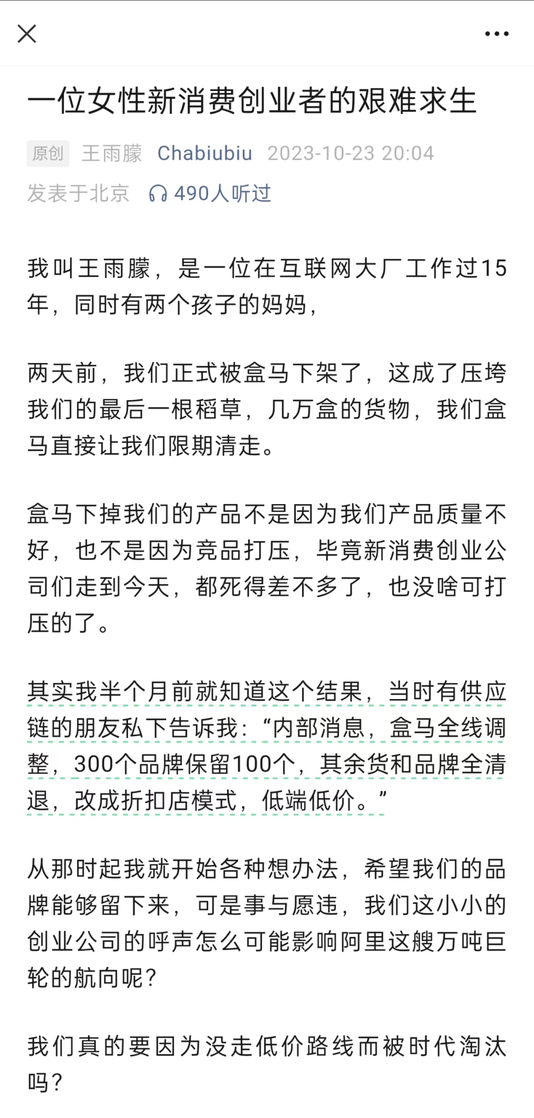 作者 | 李佳蔓 编辑 | 白杨 宣布启动折扣化经营模式变革后,盒马的“动刀”速度越来越快。 近期,有很多盒马的用户发现,盒马App无法再开通或续费会员了,引发了市场关注。 对此,有接近盒马的内部人士透露,盒马正在大力做折扣化转型,未来所有商品在完成降价之后,就不需要额外再买会员才能享受低价,让高质低价更加普惠。 在这之前,去年10月份,盒马鲜生将线下门店的5000多款商品价格下调,并在门店设置了“线下专享价”专区,同时SKU也进一步精简,从原来的5000多个缩减至2000多个。 ![]() 然而盒马此举触动了部分供应商的利益,目前已有一些商家选择与盒马分道扬镳。 比如原叶茶品牌Chabiubiu指责盒马无故下架其产品,消费品牌王小卤也在12月26日公告,称将与盒马终止合作,不过后续其删除了这一通知,相关负责人回复媒体时指出,与盒马暂停合作是此前公司基于价盘管理、维护市场秩序的一个阶段性动作,目前公司正在积极推进符合价盘管理制度下跟盒马新的合作方式。 不过盒马的转型态度异常坚决,去年11月的2023新零供大会上,盒马CEO侯毅将折扣化转型称作“盒马的生死问题”,认为长痛不如短痛。 “网上有很多争议,但那些不愿拥抱成为同路人的供应商,就只能离开。困难时期没有退路,我们只能先把自己的退路斩掉。封杀我没关系,我们走出盒马自己的一条路来。”侯毅如此说道。 不过另一边,盒马正面临着巨大的挑战。 前段时间,阿里在其三季度财报中披露,盒马的上市计划暂缓,公司正在评估确保成功推进项目实施和提升股东价值所必须的市场状况和其他因素。 而据36氪报道,在阿里集团CEO、淘天集团董事长吴泳铭兼任淘天集团CEO后,针对已经拆分出去的几个业务做出了一系列资本规划,其中就包括,考虑出售盒马。 尽管盒马后续否认了这一消息,但摆在它面前的一个命题是,它急需证明自己的价值。 01.盒马的折扣店之路,不是所有商家都跟得起 去年10月23日,原叶茶品牌Chabiubiu的创始人王雨朦在Chabiubiu官方微信公众号发文,控诉盒马。 王雨朦指出,盒马让他们清走几万盒的货物,这成了压垮公司的最后一根稻草,而且盒马下架他们的产品,并非产品质量不行或者精品打压。 她透露,早在半个月前,就有供应链的朋友私下透露:“内部消息,盒马全线调整,300个品牌保留100个,其余货和品牌全清退,改成折扣店模式,低端低价。” 她紧接着质问道:我们真的要因为没走低价路线而被时代淘汰吗? ![]() 原叶茶品牌Chabiubiu创始人王雨朦在公众号发文指责盒马,图/Chabiubiu微信公众号 对此,盒马在回应市界时指出,盒马的折扣化经营不是折扣店模式,不是卖便宜货,而是把好货、尖货卖平价。货品方面会减少种类,精益求精,为消费者提供高质平价商品。 而除了Chabiubiu之外,也有供应商选择了直接放弃盒马这一渠道。 12月26日,消费品牌王小卤官方宣布,称在与盒马方多次沟通无果的情况下,为了维护公司各区域合作伙伴各环节利益,公司停止与盒马系统的合作。 “所有我司现合作经销商/分销商一律不准向盒马系统供货,一经查处将严格按照流窜货制度处理”,王小卤在公告中如此写道。 不难发现的是,启动折扣化转型虽然不久,盒马的转型阵痛正在加速显露出来。 矛盾根源在于,盒马认为目前中国零售业的价格缺乏竞争力,在与电商低价竞争时,实体零售业没有任何还手之力,但在经过折扣化的经营采购模式改革后,零售行业可以比线上渠道做到更低价。 比如现在,同样一款商品,在盒马的线下门店价格已经低于线上渠道。 不过在很多供应商看来,盒马此举会破坏品牌的价格体系,压缩利润空间。 在盒马的折扣化经营模式变革中,供应商们其实陷入到了两难局面:他们要么跟着盒马一起变革、要么接受盒马的价格策略,放弃一部分利润空间。 但无论对小品牌而言还是大企业而言,这都不是一个容易做出的抉择。 比如王雨朦近期接受媒体采访时就提到,盒马的扣点本来就远高于永辉等其他商超,其前台+后台的扣点约为50%,而其他超市则在30%左右。而这一轮折扣化经营变革开始后,盒马和一些品牌要求,希望在供货价的基础上打5折。 再比如,新零售专家鲍跃忠也告诉财经十一人,“品牌商需要维护全国市场统一的价盘,如果乱了,经销商没法干,品牌商就更麻烦。” 02.折扣化经营模式,到底难在哪里? 盒马的折扣化经营模式,本质上是想通过供应链调整来实现低价。比如放弃过去的KA模式(从供应商手中进货),建立以“贴牌代工/资产”为核心的采购体系。 其此前也公布了“753商品价格体系”,即未来盒马的KA商品以市场价7折出售、自有品牌商品市场价5折、临期商品的出售价格则要在3折以下。 换言之,在这轮模式变革中,盒马想要搭建起独属于自己的垂直供应链。 但这显然并非一朝一夕之事。 11月16日,上海商学院教授顾国建在自己的公众号发文称,高品低价要走的路与中国传统零售业完全不同,中国零售业连锁化跨区域发展,区域集中领先的发展,新零售O2O的发展基本上还是品牌商和供应商主导推动的模式。但折扣化经营实质上是要彻底改变供应商模式,走自主的制造零售业之路。 因此他认为,盒马的方向是正确的,但是在推出的时间、内容和操作方法上存在瑕疵。 “当供应链整合性提升还没有准备好时,所有的竞争行为都会变形,欲速而不达,”顾国建如此写道。 此外,在启