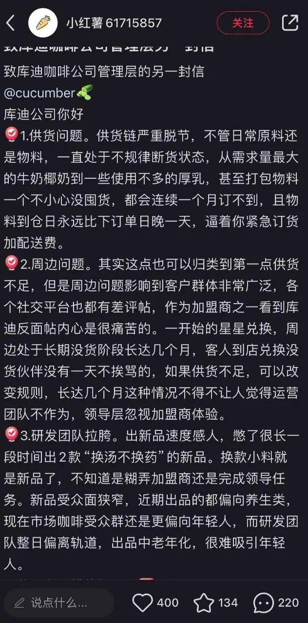 来源:蓝莓财经 2024第一出“打脸”大戏来自现制咖啡新势力库迪与其联营商。 早几天前,库迪在联营商工作会议上宣布了两项新规定:一个是往后门店订货由系统负责自动订/退,一个是总部要求门店必须售卖茅台旗下的两款保健酒。 ![]() 剥夺订货自主权和“强制”售卖明显卖不动的酒水品类,引发了联营商的群体性不满,不少联营商在小红书、抖音等社交平台发帖吐槽库迪。 有意思的是,没过两天,库迪就“改口”了,对自动订货与售卖酒水的规定迅速做了调整。 ![]() 不难发现,持续性销量下滑已经耗光了联营商们的耐心,对总部的所谓“新花样”不再愿意无怨言配合。 而眼下仍需联营商提供发展底气的库迪,再急于脱离生存危机,怕是也不敢再轻易激进了。 1.“千层套路”背后,现金流成最大桎梏 日杯量大幅下滑、联营活动频频哑火……历经一年多的“无效发展”后,过去选择无条件跟随陆老板的联营商们不仅不再配合,甚至开始主动撕开总部的套路。 不论是前段时间的人机协作和跨界做茶猫,还是近期的自动订货和售卖酒水,在联营商眼里,都是库迪打着“总部为你好”的旗号给他们设下的套路。 人机协作的消息一出,就有懂行的联营商在内部群里察觉出其中的不合理性,包括机器人本身成本高昂以及新模式适应上的不确定。有人更是直言“项目专为韭菜而生”。 ![]() 跨界卖茶饮更是很难让他们有底气。且不论当前新茶饮市场竞争早已白热化,仅有价格优势的茶猫想在头部品牌普遍开始“下沉”的情况下,突围难度不止一点。 也正是因为清楚了总部的“套路”,在自动订货与售卖酒水规定出来的时候,他们不仅不再跟随,还“集体揭竿”,在官方群、内部群、社交平台发出抗议。 自动订货机制的出现,会大大影响门店对盈利的把控,让本就回本无期的联营商们愈发被动。 售卖所谓茅台旗下的保健酒,更是隐患重重:影响门店原有的咖啡品牌定位、自己出售卖的“力气”给总部做“获得飞天茅台指标”的嫁衣等等。 事实上,只要回溯库迪的发展历程,就不难发现其套路的“一脉相承”。 早期,品牌凭借“前瑞幸财务创始团队”的标签吸引联营商加入,等联营商掏了钱开始运营时才发现,库迪不论是产品、营销还是供应链都没能达到瑞幸的水准。否则,也就不会出现如今的销量困境了。 而之所以圈钱套路不断,归根结底还是库迪迟迟未能找到现金流问题的解法。 去年年中就有业内人士爆料库迪在用承兑汇票给联营商做结算,销量持续性低迷导致淡季以来倒闭退场的门店又在增多,库迪账上的现金流状况大概率已不太乐观。如此,这才有了一系列渴望自救的新动作。 可显然,联营商们已不愿再“乖乖照做”了。 2.冷静的联营商,难冷静的库迪 联营商们之所以从早期的一腔热血走到如今相对冷静的状态,本质是库迪在发展过程中暴露的问题,让他们的热情一步步被消耗殆尽。 早期的价格战的确助推了库迪获得知名度并实现门店快速扩张,但即便有总部提供的补贴支撑,依然有不少门店长期挣扎在盈亏线边缘。为了尽快回本,他们不得不接受总部后来的“多店奖励”,从一家店开到了两家或者多家。 但他们未曾料想到的是,库迪的后续发展会如此疲软。 产品层面,早期的价格战期间忽视产品研发勉强算有情可原,可随着门店数量增多,品牌影响力提升,库迪仍不愿在产品上多花心思。要么是复刻瑞幸已有产品,要么是研发与现有产品并无太大差异的新品,导致其至今未能推出一款出圈的爆品。 要知道,现存的头部连锁咖啡茶饮品牌几乎都已有爆品“傍身”:喜茶的多肉葡萄、奈雪的茶的霸气芝士草莓、瑞幸的生椰拿铁…… 而且,在咖啡市场内卷程度不断加剧的行业背景下,库迪的低价“王牌”不仅正面临幸运咖等对手的冲击,在与早已盈利的瑞幸开展拉锯战时也很难占到上风。此时若是产品力不及时跟进,那些慕低价而来的消费者极可能在更低价的品牌出现之时迅速转投他人怀抱。 产品不给力还直接影响了后续的一系列联名活动。在与《甄嬛传》和《间谍过家家》等IP、范丞丞和王一博等明星的联名活动里,不少消费者都吐槽产品难喝,影响了联名的IP。 ![]() 还有“老生常谈”的供应链问题,导致门店部分产品和联名周边的常态性缺货,既影响联营商日常运营,也让品牌在消费者心中的印象分日渐走低。 早些时候有联营商曾给总部写信,称自己门店的小伙伴时不时就会因为产品或周边缺货被消费者吐槽甚至谩骂。某种程度上,他们不仅要承担供应链导致的销量不佳的经济后果,还得承受消费端不满带来的情绪后果,有怨言实乃情理之中。 ![]() 联营商越冷静,在产品、营销和供应链等层面存在多重问题的库迪,就越难以冷静。不然也不会在近期频频联名,甚至售卖与主业并不相关的酒水。而这些问题本就共同指向品牌难以在短期内获得销量提升,加上外部融资因陆老板新增被执行信息再度无望,品牌正前路堪忧。 不可否认的现实情况是,库迪不论是要守住现有门店规模,抑或是按计划开启茶饮市场的新一轮厮杀,都离不开联营商在背后的支撑。 尤其是,库迪引以为傲的疯狂开店早已成为现阶段茶饮品牌的共识。根据“壹览商业”的统计,蜜雪冰城门店数已逼近3万,古茗、茶百道、沪上阿姨等品牌紧随其后,正朝着万店规模迈进。茶猫要在短时间内实现规模上的
