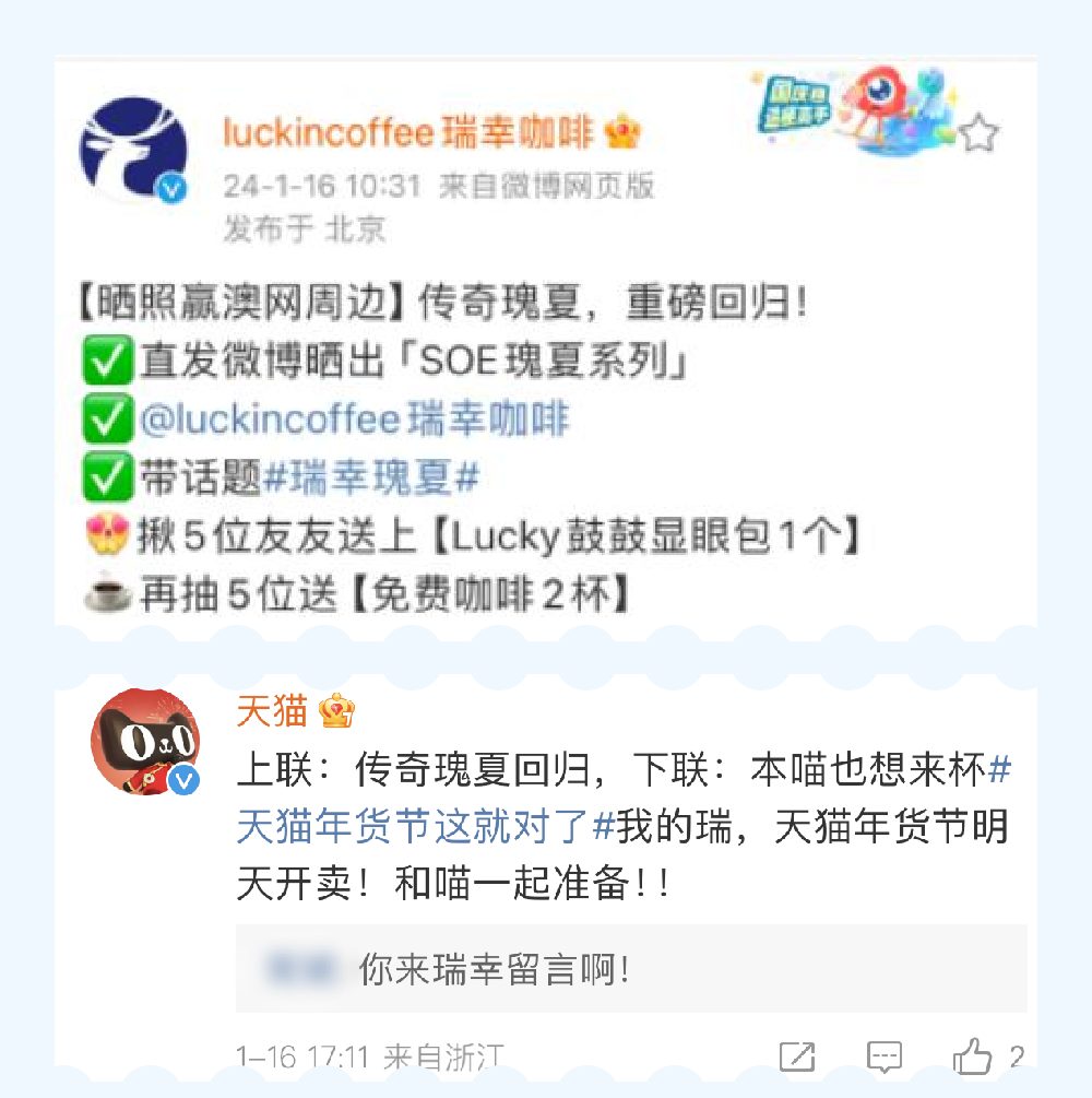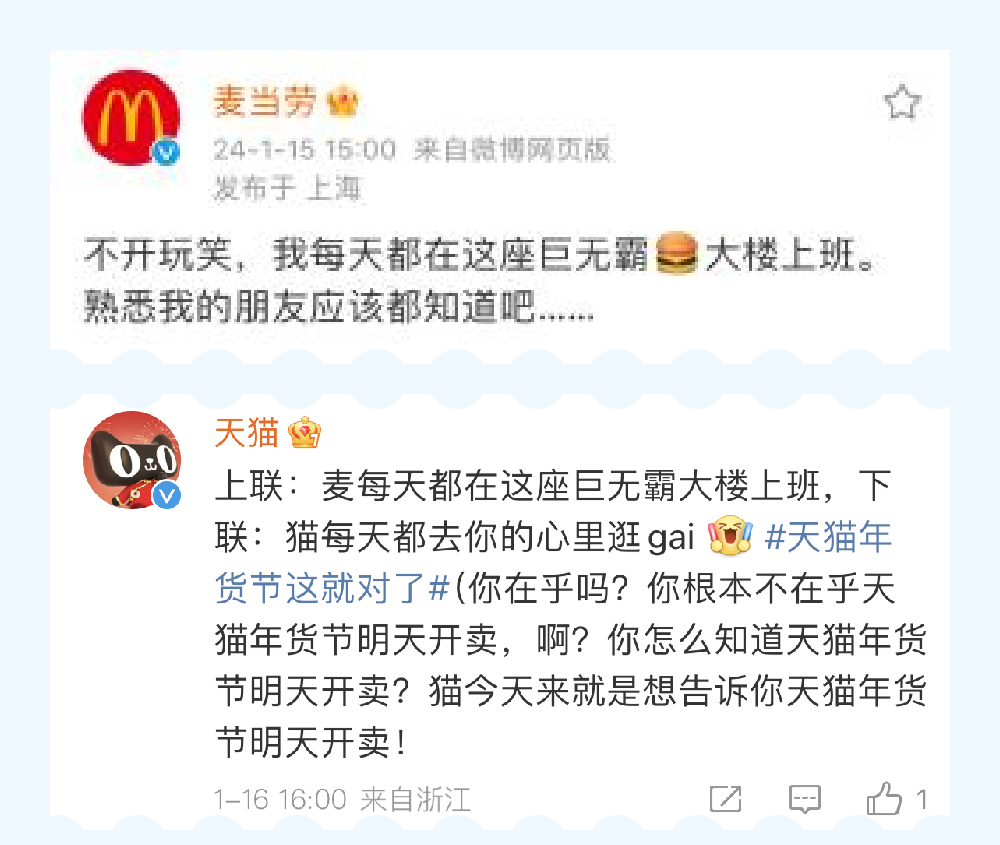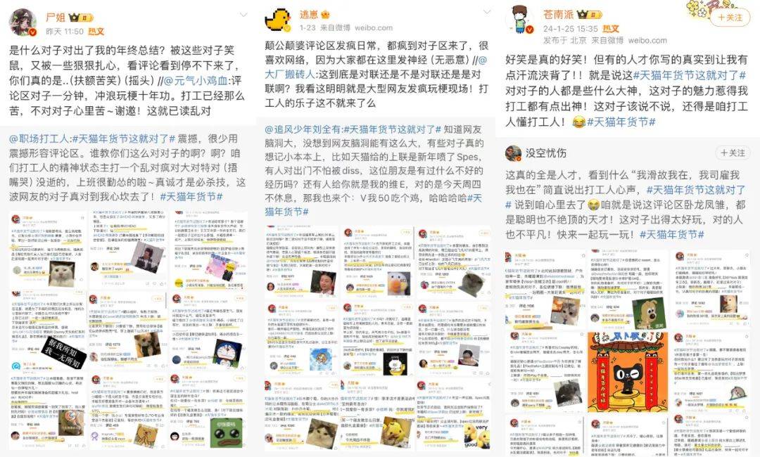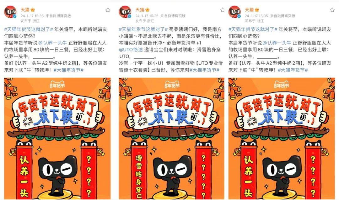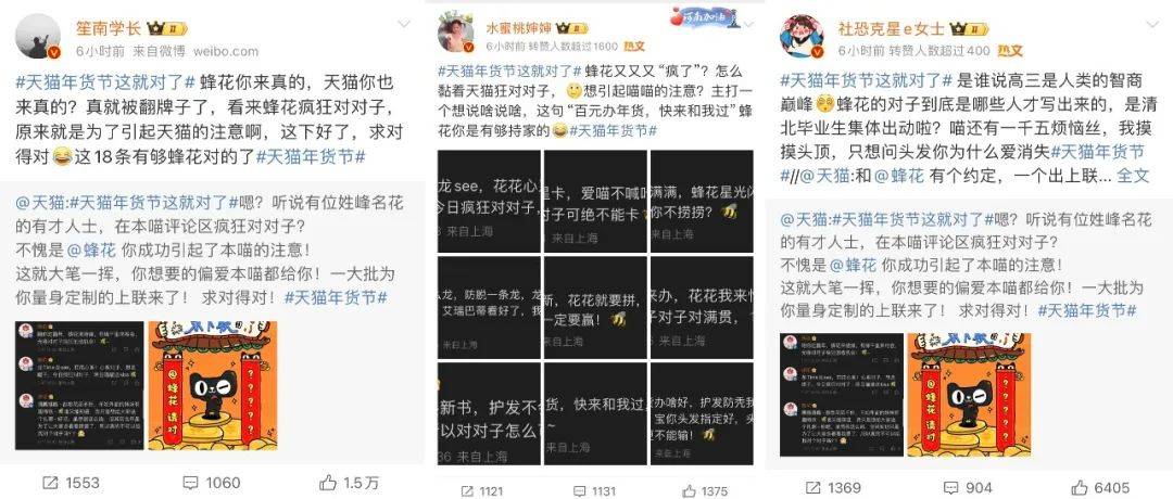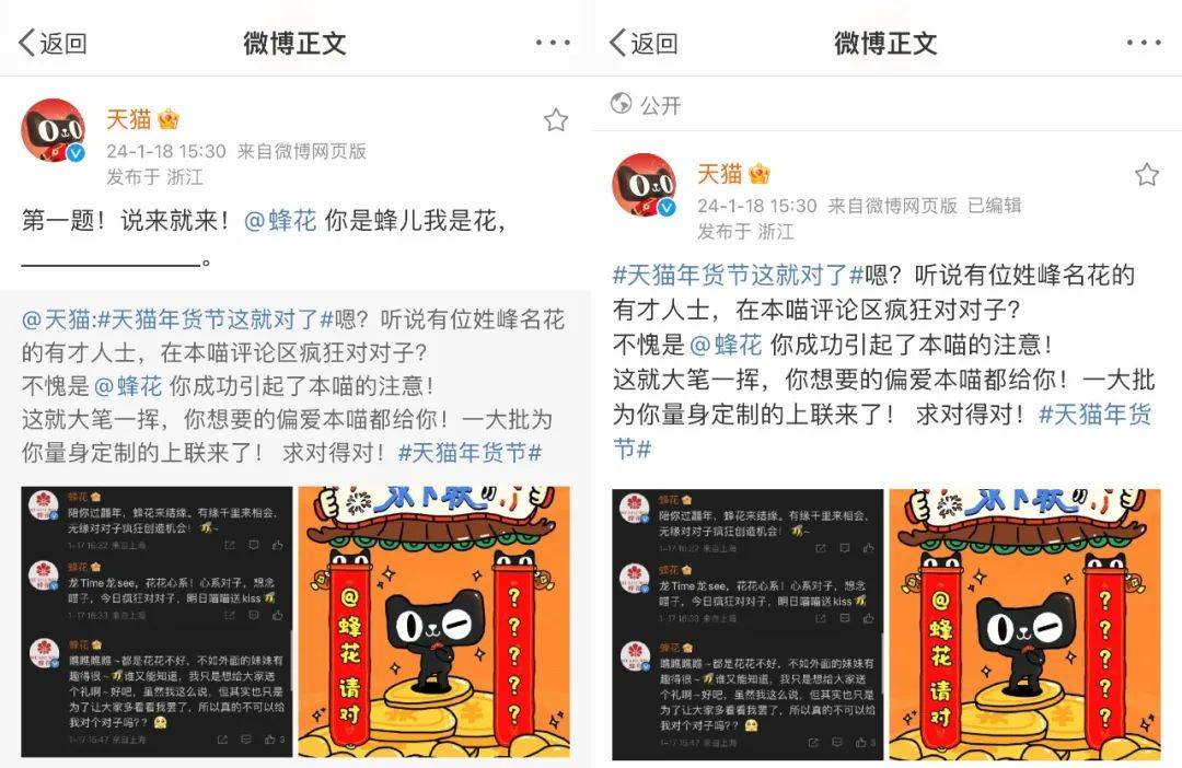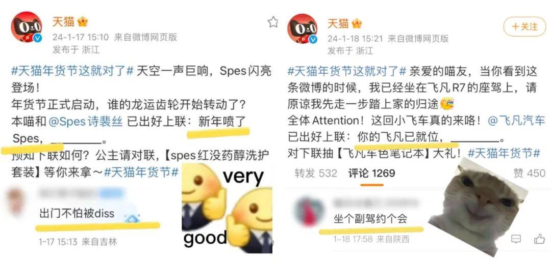 来源:公关界的007 如果玩梗有段位,天猫绝对在第一梯队。 年味越来越淡?没关系,反正天猫会出手。近日,天猫年货节火热开启,天猫联合众多品牌,用“发疯作对”的方式,玩起了春节重要习俗——「对对子」和「贴春联」,顺势掀起一股年味复兴的浪潮。 作为品牌届当之无愧的显眼包,“到处捡箱子发自家货”的蜂花当然不会放过这个好机会。在天猫微博评论区,蜂花“故技重施”,天猫发啥,蜂花就对啥,忘我式疯狂对下联、“蹭流量”,换得天猫单独发了18条上联微博的独宠,赚足了话题和眼球。 玩梗一时爽,一直玩梗一直爽。不少品牌方也抱着“打不过就加入”的心态主动接梗,一波波热梗,持续高能,一波波流量,不停收割。万物皆可对对子,天猫年货节,以对对子撬动年的仪式感,为大家奉上了一场“绝对”对味的年货狂欢。 1和100家品牌求「作对」,天猫“发疯了” 天猫:一个人搞事情真的挺无助,那独疯疯不如众疯疯!毕竟当00后接管官方账号后,千奇百怪花式整活,互联网热梗时时追踪,主打一个「有梗必应」。 事情要从天猫年货节开始前一天说起,为了给年货节造势,天猫开始在微博上疯狂搞事情,跑到100个品牌官微的评论区里软磨硬泡、发癫式跟评,给每个品牌都写了一条对子互动,并热情预告天猫年货节即将开卖。 在瑞幸咖啡微博下光明正大的“摸鱼”,说自己要喝瑰夏。 ![]() 用土味情话攻击麦当劳,调侃自己每天在麦麦心里逛gai。 ![]() 蹭“尔滨”的热度,要和黑芝麻糊糊一起,接住这泼天的富贵。 ![]() 有人出招,就有人接招。在旺仔微博留言“你旺我旺大家旺,左猫右猫一起喵”后,旺仔官方化身“在线冲浪第一人”,回复“旺旺旺旺旺旺旺,喵喵喵喵喵喵喵!”网友看完补了横批,直呼“人喵共旺”! ![]() 跟评、卖萌、求作对,只是天猫的第一步。在天猫年货节开卖当天,天猫直接在官微出了上联:天猫年货办啥好?求下联____,甚至还预告会颁发「离谱对子」大奖,邀请遍布五湖四海的喵家军大文豪们动笔。简直就是在挑战网友,我把出圈的技巧写在这里了,能不能接住就看你的了。 ![]() 思路打开后,天猫官微每天联动数个品牌方,出上联,求下联。这波“求对对子”的官方整活,也意料之中地炸出了鬼才网友在线玩梗: 上联:天猫年货办啥好,下联:打开淘宝肆意找。横批:越过越好 上联:新年喷了Spes,下联:好运和你说Yes。横批:神清气爽 上联:滑雪贴身穿UTO,下联:抗风防雪嘎嘎滴。 ...... 果然高手在民间,一个个评论,「真有点才华在身上」,参与度和洗脑值+N。 ![]() ![]() 2求对得对!流量又被蜂花蹭到了 捡完流量、捡粉丝,论会整活的国货品牌,蜂花不得妥妥排第一?毕竟有流量它是真能蹭啊。 1、蜂花忘我式对下联,天猫独宠“第一人” 这次天猫年货节,蜂花这个显眼包又来了。 自从天猫官微@蜂花 出了上联后,蜂花官方下场,化身“在线冲浪第一人”,开启“忘我式”对下联模式。 ![]() 坦明心迹,主动给自己创造机会,这个诚意到哪里说去啊。 ![]() 龙time龙see,谐音梗给满分。 ![]() 在评论里还玩起了茶言茶语,为了对对子、博关注,蜂花真的在边缘疯狂试探。 ![]() 蜂花的评论成功引起了天猫注意,天猫单独发了18条上联微博独宠蜂花,一次性让蜂花对个够。 在官方下场“整活”之后,天猫和蜂花还将舞台让给了网友,通过互动、点评,激发大家玩梗、分享,持续推动“天猫年货节”热度上升。 2、微博搞笑博主、网红忘我参与,这波热度太足了 自从蜂花这个显眼包带了头之后,隔壁品牌也都按捺不住了。斯凯奇、怡宝、瑞幸、尔木萄、卡西欧、豪士等等都申请加入战斗。同时,年轻人对传统节目——对对子的热情也燃起来了,玩起了一波文化共创。 ![]() 按照以往来说,春联这种传统文化,以往很少有品牌方能玩出彩,天猫这波操作,把传统文化玩成了全民参与的年味潮,只能说:赢麻了!真的赢麻了! 3玩出龙年营销最强「梗」,天猫太会了 高级的猎人总是以猎物的形式出现,高端的营销往往总能在最不经意间抓住消费者的心。 回顾天猫年货节对对子活动会发现,所有品牌方和网友,都是它过年play里的一环,其中,“年轻化”策略更是它最好的武器。从“发疯文学”文化出圈,到联动品牌、网友,形成一场全民共创的创意大事件,天猫年货节这一波营销操作有味、有趣、有料,不仅吸引了消费者的注意,还能使营造了新年的乐趣。 1、有味:将对对子玩出新花样,把年味的氛围感拉满 如前文所说,“年味缺乏”早已成为大众大情绪点。但其实,对于年轻一代来说,他们不感兴趣的或许从来不是过年这件事,而是过年中无趣且形式化的流程,只要提供一种文化语境,年轻人也能够就自己玩出一场狂欢。 天猫关注到了这一社会议题,瞄准了传统过年习俗里最具仪式感的“对对子”,通过出上联对下联的方式,邀请所有年轻人一起玩,将文化玩出了新花样,也营造了新年的仪式感。 2、有趣: 与年轻人玩一起,让新年变得更有心意 为了让玩法更有新意,天猫这次没有采用传统的单向输出,反而联合各个品牌,通过设置有趣的上联,奉上精美礼品的方式,激发了用户参与,顺势在他们心中悄悄种下消费的种子。这样的营销策略不仅拉近了品牌与消费者的距离,更形成了一种亲密的社交体验,还在消费者心中埋下了对品牌的好感。 尤其是,在过年时看多了品牌们深刻、煽情的表达,这种带点“小快乐”的互