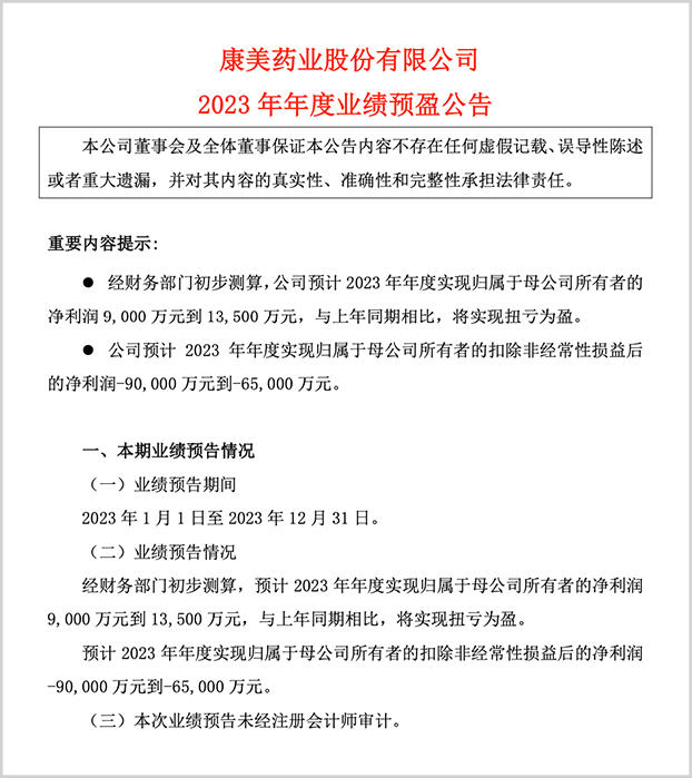 作者 | 云潭编辑 |小市妹事发5年后,A股最大造假案的主角——康美药业,似乎出现了反转的迹象。 01扭亏 近日,淡出投资者视线许久的康美药业发布了一份令市场振奋的业绩预告。 公司预计2023年扭亏为盈,预期实现利润9000万元到1.35亿元。利好来袭,康美药业在下一个交易日开盘直接涨停。 ![]() ▲来源:康美药业2023年业绩预告 这背后,一方面是主营业务有所回升,2023年公司预计营收增长16%左右,带动毛利增加约2亿元。 另一方面,则是非经营性收益,其中政府补助及债务重组收益约0.6亿元,资产处置获得近1亿元,因债务和解引发应收账款减值准备转回2亿元,此外还冲回了部分土增税4亿元左右。 也就是说,扒开外衣,扣非后康美药业仍然预计亏损9亿元到6.5亿元。 自财务造假东窗事发后,康美药业2019-2022年已经连续4年扣非后巨亏,虽然2021年因为重整收益获得一笔175亿元的巨额收益,导致当年大幅盈利。但实际上,康美仍然在刮骨疗毒的过程中。 早在2018年,康美模式就遭到媒体质疑。当年底,证监会在日常监管中发现,康美药业财务报告涉嫌虚假陈述等,当即立案调查。 次年4月,康美药业主动“揭丑”,承认公司在2017年虚增货币资金299亿元。8月,证监会查明后的真相更让整个资本市场咋舌,康美药业在2016年至2018年上半年,分别虚增营业收入89.99亿元、100.32亿元、84.84亿元,虚增金额高达约300亿,累计虚增货币资金886亿元之巨,创下A股市场有史以来最大的造假纪录。 ![]() ▲数据来源:康美药业公告,公开资料 要知道,康美药业曾是A股知名的千亿“白马股”,自2001年上市至2016年,公司业绩稳步增长,股价(后复权)至2018年的历史顶峰涨幅超过30倍。 谁曾想到,这些辉煌都是建立在谎言和欺诈之上的海市蜃楼。 康美案震惊A股,并成为新《证券法》确立中国特色证券特别代表人诉讼制度后的首单案件,也是迄今原告人数最多、赔偿金额最高的上市公司造假案。 最终,康美药业原实控人马兴田及多名责任人受到严厉惩处,马兴田数罪并罚被判处有期徒刑12年,并处罚金120万元;康美药业因单位行贿罪被罚500万元。 对于被坑惨了的5万多名投资者,法院要求康美药业赔偿24.59亿元,且马兴田夫妇及邱锡伟等4名原高管人以及审计机构正中珠江会计师事务所都要承担100%连带赔偿责任。 如此巨大的财务造假,无异于毁灭性的打击,由于影响太过深远,康美药业自此跌入了冰窖。 经过三年重整后,2023年以来,康美药业在新的话事人广药集团治下,营收有所回暖,但主营业务依然亏损。可见其自身造血能力并未完全恢复,重回健康成长的轨道还需要时间。 02涅槃 康美药业曾是A股第二大市值的医药股,2018年市值最高时达到1390亿元。如今,仅剩260多亿元市值,相当于1130亿元市值灰飞烟灭。 2020年9月,原控股股东康美实业及实际控制人已无力管理上市公司,因此将康美药业29.9%股份的表决权委托给易林投资行使,并放弃剩余8.38%的股份。易林投资接管康美药业生产经营以及资产债务处置。 易林投资成立于2020年8月18日,股东均为清一色的国资,揭阳城投持有40%股权,广东金服股权托管中心、广州神农氏中医药发展有限责任公司分别持有30%股权。 ![]() ▲来源:天眼查 不难发现,易林投资就是为了专门解决ST康美遗留问题而成立的,并且通过“托管”稳定了公司生产经营的基本盘,顺利挺过了动荡期。 次年4月,揭东农商行向揭阳中院申请康美药业破产重整,7个月后,揭阳中院裁定批准康美药业《重整计划》。 这时,易林投资股东之一的神农氏企业走到台前,作为广药集团的代表,其和康美药业具有天然的业务协同性,且属地都在广东。广药集团出面作为重整人,也是顺理成章。 按照重整计划,神农氏企业以54.19亿元现金和资产为对价,获得35.09亿股的转增股票,占重整后上市公司总股本的25.3134%,成为控股股东。 神农氏企业背后是广药集团,广药集团在重组过程中发挥的关键作用,是康美能够涅槃重生的关键。 相比易林投资其他两大股东,广药集团具备医药产业基因。自托管起,广药就组织近百人的团队支持康美发展,并发挥自身产业优势,以及在粤东市场的地位,主导康美药业与广药白云山进行协同融合。 而且,为偿还债务,康美药业在重整过程中处置了部分资产,重整后虽然资产规模大幅减少,但负债规模也同样大幅收窄,资本公积转增股本后股东权益增加。 就像凤凰涅槃一样,康美药业在财务造假后,势必要经历一段极为惨烈的阵痛期。但剜出毒瘤后,在广药集团的支持下,康美药业写好“后半篇文章”也有了底气。 03重生 冰冻三尺非一日之寒。 康美药业要想绝处逢生,除了基于自身的底子,还离不开广药集团的助力。 重整之后,公司仍然以中药饮片为核心产品,并继续实施中医药全产业链一体化的经营战略。 目前看,中药产业正处于黄金年代,“健康中国”上升为国家战略,中药产业受到顶层政策的大力支持。 与此同时,疫情提升了民众对中药的使用需求,而2022年贵州等地的大旱,导致多种药材大幅减产。再加上中草药种植成本连年上涨,供需错配愈演愈烈,引发中药材迎来史无前例的涨价潮,白术、黄连、当归等多个品种的售价刷新历史新高。 天地中药材综合200指数、康美中药材价格总指数均在2023年8月前后均创下历史最高纪录,即使之后有所回落,但整个中药材价格依然居于历史高位。 ![]() ▲康美中国中药材价