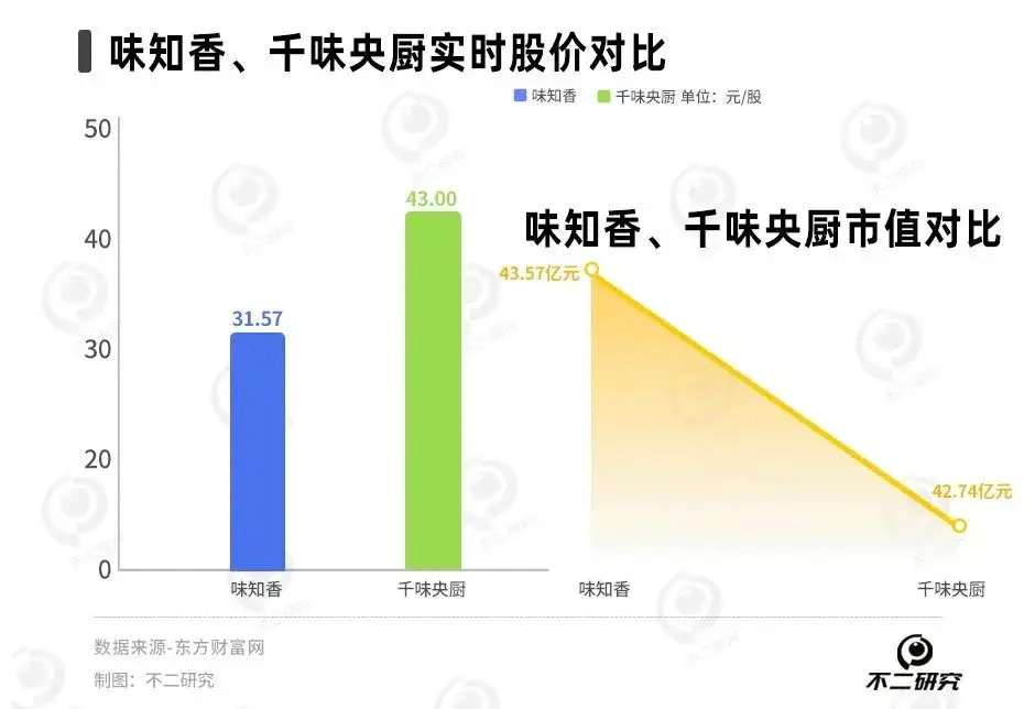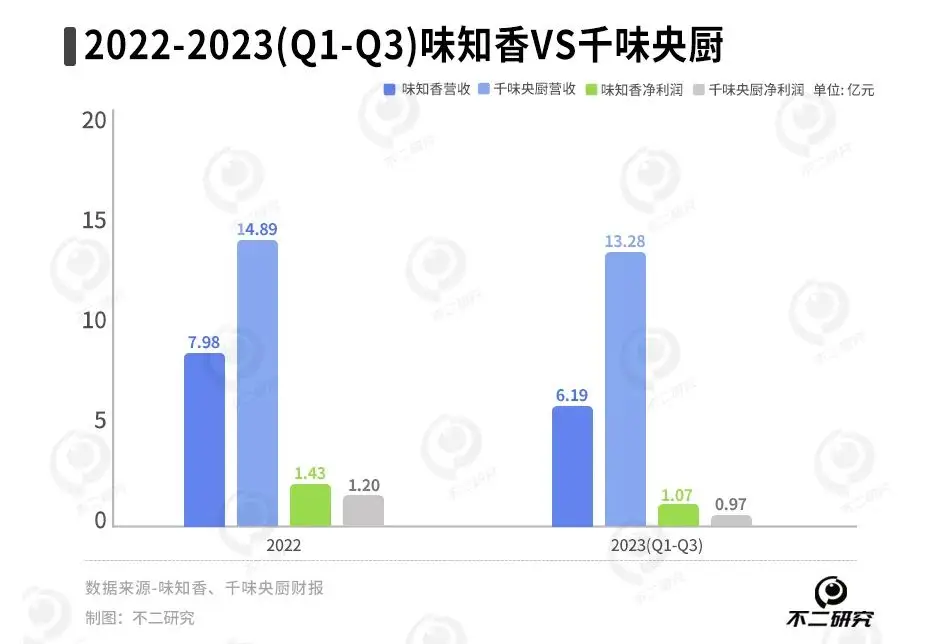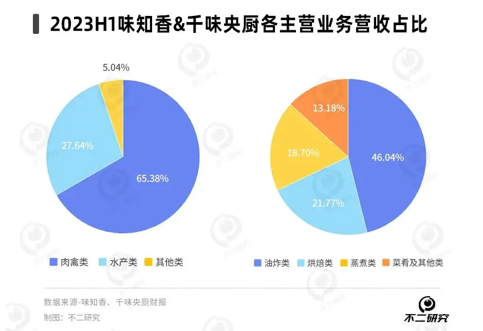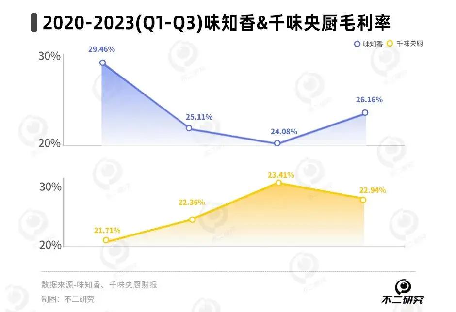 作者 | 若楠 熊生 排版 | Cathy 监制 | Yoda 出品 | 不二研究 2024年春节预制菜销量走俏,预制菜依然是消费者“年夜饭”上的重头戏。各大生鲜平台、电商、商超、餐饮门店都纷纷开卖春节预制菜。 预制菜赛道两大“玩家”:“预制菜第一股”味知香(605089.SH)、“餐饮供应链第一股”千味央厨(001215.SZ)均在此前公布了2023年三季报,其业绩有所分化。 「不二研究」据其三季报发现:2023年前三季度,味知香、千味央厨营收增速分别为1.92%、28.88%;其净利增速分别为-2.90%、35.29%。目前,千味央厨的营收与净利增速碾压增速,在 「不二研究」看来,味知香的净利出现负增长,其主要原因或在于原材料成本上涨及电商业务履约成本高导致的物流费用增加,从而影响味知香的净利润。 味知香是一家半成品菜肴供应商,主要从事半成品菜的生产、研发和销售;千味央厨则是一家专门的餐饮速冻面米制品供应商,为餐企提供定制化、标准化的预制半成品。 截至1月26日收盘,味知香报收31.57元/股,对应市值43.57亿元;千味央厨报收43.00元/股,对应市值42.74亿元。 ![]() 「不二研究」据两者的三季报发现:2023年三季度,味知香、千味央厨的营收分别为6.19亿元和13.28亿元;营收增速分别为1.92%、28.88%。 同期,味知香、千味央厨的净利分别为1.07亿元和9427.05万元;净利增速分别为-2.90%、35.29%。 从布局上看,味知香以C端为主,B端为辅;千味央厨专注B端。随着加盟店红利逐渐消退,味知香的净利出现负增长。2023年三季度,味知香新开加盟店数量为91家,关店数量为66家。 从2023年三季度业绩增速看,千味央厨实现营收与净利双增;而味知香营收同比增加、净利同比下滑。 去年7月的一篇旧文中(《味知香VS千味央厨一季报PK,预制菜下半场谁是新王?》),我们聚焦于作为预制菜赛道的两大玩家,其定位略有不同,业绩也出现分化。 时至今日,两家预制菜企业不仅面临业绩分化等问题,还要直面食品安全、餐饮业恢复不及预期的风险。 随着预制菜国标政策即将出台,预制菜赛道将经历新一轮洗牌。味知香、千味央厨,谁是预制菜“新宠”?由此,「不二研究」更新了7月旧文的部分数据和图表,以下Enjoy: 2023年,预制菜频频冲上热搜,不管是“预制菜占领商场”还是“预制菜进校园”的传闻,使其置于舆论的风口浪尖。 据艾媒咨询的《2023—2025年中国预制菜行业运行及投资决策分析报告》显示,2022年中国预制菜市场规模达到5434亿元,同比增长21.3%,预计到2026年将会突破10720亿元。 行业空间广、头部品牌缺乏的预制菜市场吸引了众多资本入场。2021年,珍味小梅园、三餐有料、寻味狮、望家欢等预制菜上下游各企业前后获得融资。 “预制菜第一股”味知香、“餐饮供应链第一股”千味央厨先后于2021年登陆A股市场。 当预制菜赛道竞争不断加剧,作为预制菜赛道的两大玩家,味知香、千味央厨在此前分别公布了2023年三季报报,其在资本市场表现各异。 「不二研究」发现,从业绩看,在2023年前三季度,味知香的营收增速出现放缓,而千味央厨的营收增速则加速,同时净利增速也出现分化;从布局看,味知香以C端为主、B端为辅,而千味央厨专注B端;从产品看,味知香主攻肉禽水产,千味央厨则专攻速冻米面制品。 两家在布局和产品都截然不同的公司,随着国家政策的再次出台,预制菜行业即将迎来新一轮发展与洗牌,在万亿潜力市场竞争者众的预制菜赛道下半场,谁能笑到最后? 业绩:营收加速vs净利分化 在2023年的后疫情时代,味知香、千味央厨的营收增长加速。 据两者的三季报显示,味知香2023年前三季度的营收为6.19亿元,同比增长1.92%;同期,千味央厨的营收为13.28亿元,同比增长28.88%。 而在疫情肆虐的2022年,味知香实现营收7.98亿元,同比增长4.40%,千味央厨则在同期实现营收14.89亿元,同比增长16.86%。 2023年前三季度,味知香营收同比增长速度较2022年全年下降了2.48个百分点,千味央厨则较2022年全年下降了12.02个百分点。 两者的营收增速在2023年都出现加速,但净利润增速却出现分化。 据财报显示,2022年,味知香取得净利润1.43亿元,同比增长7.95%,千味央厨则取得净利润1.20亿元,同比增长15.20%。 而2023年前三季度,味知香取得净利润1.07亿元,同比减少2.90%,较2022全年净利润增速出现负增长;千味央厨同期取得净利润9724.50万元,同比增长35.29%,较2022全年的净利润增速增长20.09个百分点。 ![]() 净利润分化与味知香、千味央厨的毛利率变化密不可分。据财报显示,2020-2023年前三季度,味知香的毛利率分别为29.46%、25.11%、24.08%、26.16%;同期,千味央厨的毛利率为21.71%、22.36%、23.41%、22.94%。 显然,从2020-2023年,味知香的毛利率在2021年出现下滑,主要原因在于2021-2022年味知香原材料成本上涨及电商业务履约成本高导致的物流费用增加,营业成本有所增加所致,2023年又恢复正常水准,因此毛利率与2023年出现回落,直接导致净利增速与营收增速的分化。 ![]() 与此同时,千味央厨的毛利率整体低于味知香,但呈现出逐年上升的态势。尽管在2023年前三季度略有回落,但整体来看,千味央厨与味知香在毛利率方面的差距正在逐渐缩小。 在「不二研究」看来,千味央厨、味知香在行业受益的情况下,2023年前三季度营收均加速上涨,净利润出现一定分化,但仍不该上行之势。两者谁将在预制菜市场脱颖而出?要看的还是双方的渠道布局和产品。 布局:C端为主vs专注B端 据中商产