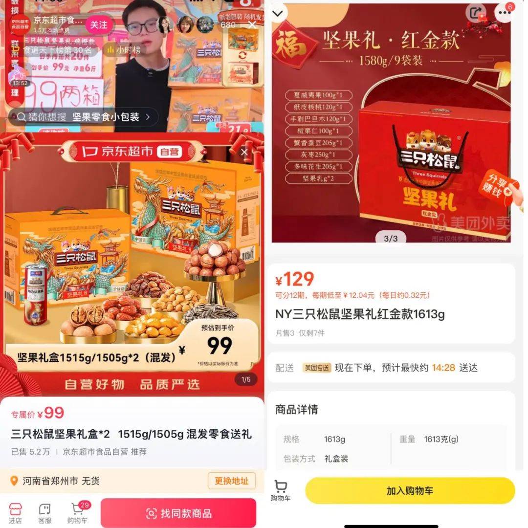 作者丨樱木 编辑丨月见 “15、16、17包,三只松鼠纯高端坚果,连瓜子花生都没有配,这个价格我们保价一年。” 贾乃亮的带货直播间镜头里,奔跑在超市里的贾乃亮已经气喘吁吁,但取货的脚步似乎没有停下来。这是1月11日,三只松鼠代言人贾乃亮的专场,17件如腰果、夏威夷果等高端坚果被贾乃亮打到了平均价格不足10元的水平。 随之而来的,是贾乃亮喘不匀的气息,以及屏幕前疯狂下单的消费者,小黄车里跳动的数字也验证了人们对于低价的热情,仅上半场,贾乃亮官方透露销售量已达12万件,然而纪录还在不断刷新。 几乎与贾乃亮同时,1月13日早10点,快手辛巴年货节直播开场,在线人数超300万。 第一款三只松鼠坚果礼盒,上架即被抢空,据统计显示销售额达1.6亿元。 激烈的年货中,三只松鼠似乎打了一个漂亮的翻身仗。而好消息还不止如此,1月10三只松鼠发布公告,表示在2024年货节期间,三只松鼠礼盒、礼包类产品在各个线下销售渠道都取得了意想不到的成绩,销量远超预期。目前,全系列标品礼盒/礼包产品已经全部售罄。受此消息影响,二级市场三只松鼠股价开始暴涨,单日上涨达20%。 线上、线下以及资本市场全面起飞,三只松鼠的好日子似乎终于来了,这个曾在1年半时间关闭超569家加盟店,几年间经历股票被不断减持,营收利润不断下滑的坚果品牌,似乎看到了反转的曙光。 但质疑的声音,并未因此消退,三只松鼠线上大幅度促销之下,线下经销商几乎必然成了牺牲品,无论是商超、KA大量产品失去价格竞争力成为必然。有行业研究人士表示,“现在不管那么多了,先把价格降下来,渠道商哭爹喊娘那也是以后的事情了。”而似乎是看到了这样的趋势的发生,有媒体报道称三只松鼠董事长章燎原在朋友圈发表了评论,称他们的分销业务被迫收官,全力转向线上的2C业务。 当然,除了经销商的问题之外,利润似乎也是悬在三只松鼠头上的达摩克斯之剑,从财务报表显示,在过去几年中,高端性价比策略虽然让三只松鼠曝光不断,销量增加,但利润却增速缓慢。同时,追赶者似乎也马不停蹄,在2023年,电梯广告中突然多了一组声音“高端坚果礼,就选美荻斯。”又一个三只松鼠的故事,似乎要再次开启循环。 “认知不到位,我认为是苦吃的还不够。”三只松鼠创始人章燎原曾在采访中说道。吃了多年苦的三只松鼠,真的完成了认知提升吗?华丽转身的背后,更多的问题,以及激烈的市场竞争,都在不远处等着它。 01从品牌到白牌 ![]() 如果从五年的维度来梳理三只松鼠,不得不说今天的变革可谓是一种破釜沉舟。 2019年,彼时还顶着线上网红品牌的三只松鼠决定发力线下,开启加盟。 据媒体报道,三只松鼠的规划是5年开出1万家线下门店,并为公司实现千亿规模营收。激进的扩张打法,让三只松鼠在初期快速收获了不少的加盟商,仅在2019年三只松鼠就完成了从19家到约278家的加盟门店数量。在随后的2020年,据界面新闻报道,三只松鼠加盟店拓店在700家左右。按当时的规划,2021年三只松鼠希望可以再新开1000家小店。 但快速地增长累积出了不少弊端,线上与线下的矛盾从未停止,在价格方面没有优势是这些线下门店的硬伤。根据报道显示,一位三只松鼠天津加盟店老板称,经常遇到一些消费者,通过比价后流失到线上,尤其是在双11这类大促节日,就连一些加盟者也会趁着线上大促时从线上“进货”。 加盟商看重的品牌,其底层逻辑在于稳定的品牌溢价,而放开加盟后,线上出身的三只松鼠,似乎第一次开始展露出,在这个方向上的失控。 在这样的矛盾之中,三只松鼠的线下加盟开始进入到了刹车阶段,在2021年,三只松鼠没有迎来新开的1000家门店,反而开始了闭店的序曲,根据财报数据显示,2021年三只松鼠共计关闭自营和加盟店铺330家;2022年,关闭店铺力度还在加大,其中自营的门店关闭了118家仅剩下23家,加盟店关闭了431家,剩余538家。 两年时间,从宏伟的设想,到现实的纠偏,三只松鼠的试错成本不可谓不大。 而与闭店同时产生的策略调整,则将线下的主要渠道倾斜至了传统经销商,在2021年10月三只松鼠召开的分销商大会上,公司宣布将聚焦线下分销渠道,前期聚焦坚果建立分销渠道,后期再将其他精选零食子品牌导入分销系统,计划五年实现100亿元的营收目标。 据三只松鼠相关事业部负责人鼠百亿介绍,整体线下占三只松鼠的营收的40%,而这部分比例中三只松鼠已经快速完成了与全国230多家年平均销售规模6500万以上的休食大商确定品牌授权代理合作,与中国百强连锁商超中的80%确定经销商代理进场销售(包括沃尔玛/大润发/永辉/等)。 从发力加盟到转战分销,三只松鼠品牌化、高溢价的野心始终没有消散。但现实的回应似乎更加残酷。 在随后的2022年,三只松鼠的表现可以说降至冰点,从财报来看,公司营收与利润开始加速下滑,分别降幅为25.35%以及68.61%。而公司的问题也从线下,开始逐渐蔓延至线上,2022年财报显示,其在天猫系、京东系平台的营收分别下滑33%、28%。 分销的发力,似乎也没有救得了三只松鼠,一直坚信“品牌型公司”打法的三只松鼠,遭遇到了来自多方面的压力。这样的势头在进入2023年后,并未缓解。 用创始人章燎原的话来说,“外部环境的变化、电商生态的变化以及线下量贩零食业态的崛起,这三个要素引发了公司的改变。” 总结来看,环境变了,对手变了,甚至消费者也变了。而此