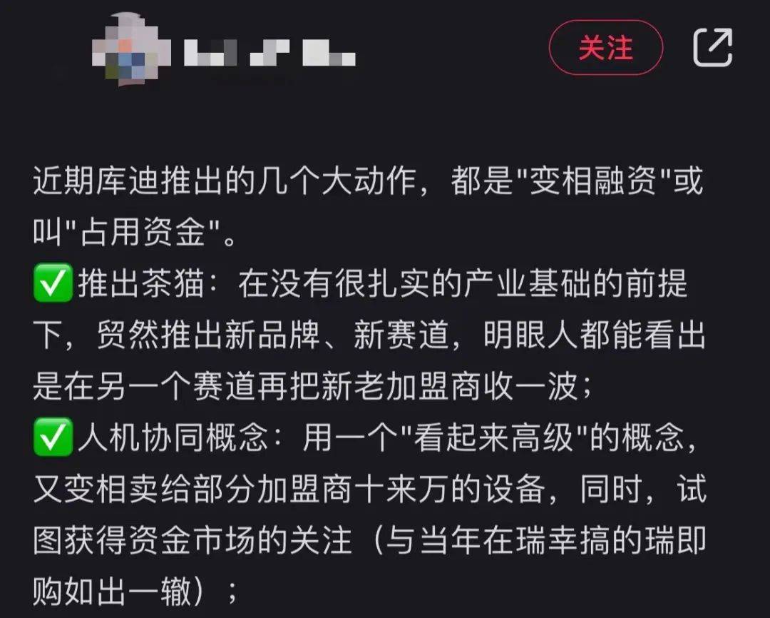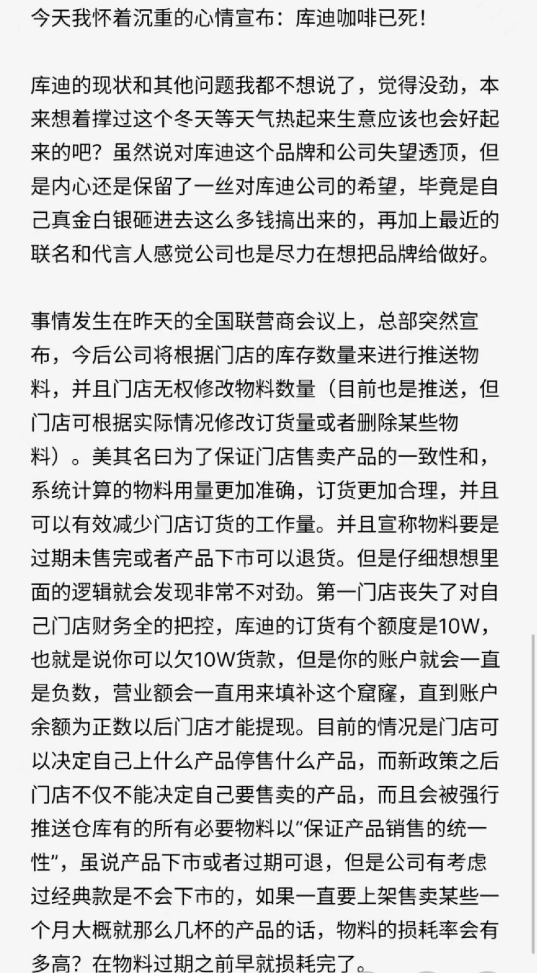 文丨前哨 出品丨牛刀财经(niudaocaijing) 过去的2023年,连锁咖啡行业已经开始进入高速发展阶段。 从单品牌门店的扩张来看,“壹览商业”数据显示,2023年,有13个连锁咖啡品牌完成了净增门店量为正,有10个品牌增速呈两位数增长,最为夸张的当属库迪咖啡,在一年内实现了门店从87家到7064家的爆发性增长。 不过,虽然库迪在过去的一年里以火箭速度扩张,但作为创始人的陆正耀依然还没有摆脱巨额债务。 ![]() (图源:天眼查) 近日,陆正耀又新增了一则被执行人信息,执行标的781.78万元,执行法院为北京市第三中级人民法院,并且此前,陆正耀多次成被执行人并被限制消费,根据【天眼查数据显示】,目前陆正耀共关联3则被执行人信息,被执行总金额超10.9亿元。 那么,巨债缠身的陆正耀,还能否靠库迪“咸鱼翻身”? 1、陆正耀的“翻身仗”不好打 短短一年能开出7000家店,库迪咖啡的“全联营”模式占了大部分原因。 在这种模式下,不收加盟费、品牌管理费等固定费用,只按照门店经营毛利收取服务费,自然能在前期吸引到了不少联营商入局。 那么一直标榜不收“加盟费”的库迪,真的是在让利联营商吗?其实不然。 根据公司合作协议,库迪总部会按照门店经营毛利收取服务费,毛利2-3万的部分收取10%服务费,毛利3-4万的部分收取15%服务费,毛利4-8万的部分收取25%服务费,毛利8万以上的部分收取30%服务费。 除了存量店抽佣外,库迪的收入来源还包括新店现金流、原材料供应链利润以及外部投资。 不过,一方面,不少库迪联营商仍深陷盈利“漩涡”,虽然有补贴,但是由于库迪原材料成本相对较高,单杯咖啡的毛利润大致为45%-50%,更何况一杯咖啡除了物料成本之外,还有铺租、人工、推广等支出,导致不少库迪联营商几乎是卖一杯,赔一杯。 另一方面,陆正耀曾为当年瑞幸财务造假事件的责任人,声誉受损很难再获融资,且在A股全面注册制之下加盟模式企业由于易向“类金融模式”演变,上市限制隐患增加,越发谨慎的投资机构现阶段显然并不会愿意冒着风险,给还没跑通盈利模型的库迪投钱。 盈利难且融资受阻,所以现阶段库迪的主要收入来源还是依赖于新店现金流和原材料供应链利润。 ![]() (图源:招商证券《咖啡行业深度报告:库迪VS瑞幸,9.9元价格战“鹿死谁手”》) 根据招商证券的测算,算上保证金、品牌授权费、设计费以及设备差价,库迪的新店现金流在10-15万之间;而库迪对原材料的加价一般在15%-20%的区间内,所以原材料供应链利润大约为0.7-0.8万/月/店。 有限的收入来源,很难负担已经将低价补贴常态化的库迪。招商证券调查数据显示,库迪对联营商的补贴大约是0.8-1万元/月/店,这项支出勉强能由原材料供应链利润覆盖。 但在联营商的补贴之外,还有1-1.5亿元每季度的营销费用,以及抖音分销费用、管理人员工资、供应链费用和研发费用等等。 如此计算下来,7000多家门店所带来的现金流,往大了算也只有10亿左右,刨除每个季度的营销费用,以及七七八八的其他支出,几乎所剩无几,陆老板不往里面贴钱就不错了,更遑论借库迪还清债务。 2、库迪咖啡走进“死胡同”? 2023本就颇为艰难,然而步入2024年,行业内卷再度加剧,库迪咖啡更是“疲态”尽显。 根据“餐饮老板内参”数据显示,库迪自去年九月开始,门店增长速度开始出现大幅放缓,上个月库迪的新增门店数甚至已经下滑至173家。 ![]() (图源:餐饮老板内参) 可想而知,100多家新增门店带来的增量资金,自然难以补贴存量的7000多家门店,更何况最近为了安抚联营商,库迪还宣布将加大补贴力度,对标瑞幸4块/杯的补贴,以3.5元/杯增加联营商信心,这也将进一步加重了库迪的现金流压力。 为了缓解现实困境,也为了实现“万店咖啡梦”,最近几个月,陆正耀也采取了一些新动作,但效果似乎都不太理想。 首先,在去年年底,陆正耀试图通过新面孔茶猫进军奶茶赛道。 可一边是比连锁咖啡更内卷的奶茶赛道,一边是“砸钱扩张-优惠补贴引流-占领市场-迅速上市- 涨价”毫无新意的老一套打法,再加上并未跑通的单店盈利模型,很难说服联营商跟注。 有业内人士在社交平台上公开吐槽,“在没有很扎实的产业基础的前提下,贸然推出新品牌,进入新赛道,明眼人都能看得出来是在另一个赛道再把新老加盟商收一波。” ![]() (图源:小红书) 其次,在年初,库迪又与顶流王一博合作,官宣了新代言,但积弊已深的供应链使得库迪也未能取得“1+1>2”的理想效果。 有的消费者反应的是王一博周边物料缺货严重,甚至出现了“中国龙杯子+甄嬛传杯套+王一博袋子”这样的混搭情况。 ![]() (图源:小红书) 事实上,早在王一博的联名活动尚未开启之前,就已经开始有联营商在内部群“忧心”订不到相关产品,可见联名周边缺货已是常态。 ![]() (图源:库迪联营商爆料) 另外,还有一部分消费者的吐槽则是集中在库迪对于联名周边的“敷衍”,毕竟不少冲着王一博去购买库迪的粉丝,内心都抱着对周边的期待,但“超薄的小卡”和“印刷差劲的包装袋”无疑给这部分消费者狠狠泼了一波冷水。 ![]() (图源:小红书) 热门产品频繁缺货,部分物料质量又不过关,库迪不成熟的供应链愈发难以遁形,这也使得即便是付出了高昂的代言费用,结果库迪并未能抓住新代言人带来的热度,反倒只进一步加重了现金流压力。 最后,眼看茶猫和新代言人的影响都只是“雷声大、