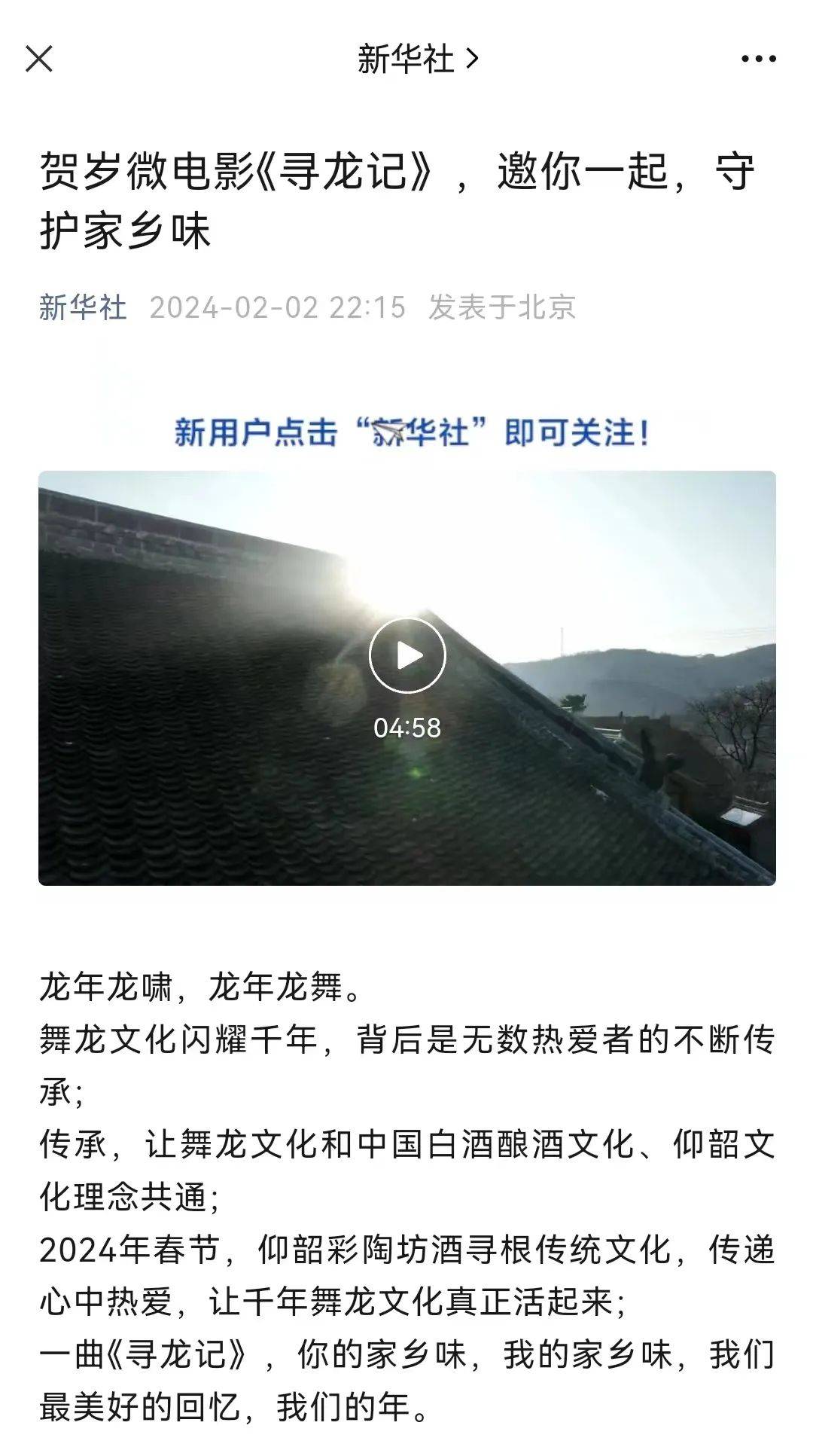 来源:公关界的007 似乎没有哪个生肖能如「龙」般,能引入如此多关注、承载如此重的希冀。刚迈入龙年年关,各类吸睛龙装置、联名龙IP、传承龙文化......齐齐上阵,各大品牌迎「龙」而上,卷入这场红红火火的传播较量中,场面堪称神仙打架。 在这场注意力的角逐战中,近日,由仰韶酒业集团发布的2024贺岁微电影《寻龙记》高燃出圈了,看完后感动到热泪盈眶。短片以“父与子”故事为主线,通过“古老与新生”的对话, 讲述了非物质文化遗产,在时代洪流中仍然坚韧传承与创新再生。 短短6分半时间内,感动,幽默、转折、亲情、年味俱全,情节虽不复杂,却成功将「火龙舞」「中国年」「家乡味」等关键词送到了大家眼前,顺势掀起了一场席卷社交平台的文化营销。 ![]() 正是凭借朴素又直抵人心的魅力,《寻龙记》在海内外都收获了不俗的口碑和关注。截至目前,获得新华社官方点赞,获得了国内外600+媒体转发,上线两日浏览量破10万+,实现了热度与口碑的双丰收。而它的成功出圈,印证了一个道理:讲故事,真诚永远是必杀技。 ![]() 一部《寻龙记》寻的是创意,见的是传承 炮仗响,锣鼓鸣,舞龙起,一场独有中华民俗的“东方狂欢”拉开序幕,但是狂欢的背后到底是谁在坚守?这也是微电影所传达的核心。 影片通过一个巧妙的「父与子」矛盾引入:老王,某村舞龙队,正苦于找不到愿意参与舞龙的人;小龙,公司创意策划,正苦于想不出关于“家乡味”的好创意。这对父与子,因为过年“回不回”“啥时候回”被连接在了一起。而这样做的好处,是用贴近年轻人生活的方式,拉进情感沟通的距离。 「忙」,是儿子小龙给出的答案;「忙」,也是不参加舞龙的村民的借口。村里人不是忙着下棋,就是忙着做生意,再就是忙着跳广场舞……老王彻底陷入自我怀疑:“舞龙”,是不是真的没有太大的意义?祖辈相传的技艺,难道就只能断绝在自己手上吗? 与此同时,为了挖掘家乡味,小龙提前返家。在寻找创意的过程中,小龙逐渐理解了父亲看似执着舞龙表演,其实正是在守护家乡味。在读懂老王的坚守后,小龙主动为老王组建舞龙队伍,发动身边的年轻人加入舞龙队伍。 ![]() ![]() 在影片后半段,在老王的带领下,这支舞龙新生代,为大家奉上了一场酣畅淋漓的舞龙表演;老王的执着精神也给了小龙创意灵感,他所撰写的方案也赢得了领导认可。 影片到这里,主题终于呼之欲出:家乡味,是浓浓的人情味,是生生不息的传承。这一核心理念,也是《寻龙记》的动人之处,它在告诉我们,家乡的传统文化值得被更多人看见和重视,也需要去往年轻人群的内心深处,甚至让他们主动参与到传承的过程里,能完成一场「传」与「承」的双向奔赴。 以“舞龙传承”为纽带 完成品牌与人心的对话 除了层层递进的叙述逻辑外,《寻龙记》中动人的镜头语言和严谨考究的文化细节,都展示着品牌方的真诚与用心。 「舞龙」是《寻龙记》的剧情线索,为了完美展现非遗版火龙舞,品牌方做了大量功课,从舞龙灯的基础身姿、步伐,到“龙头要神韵机灵、龙尾要摇摆自如动作”等动作要领......各种考究的细节,都被如实还原至成片里。 ![]() 为了更纯粹的展现这项非遗民俗之美,在影片最后,品牌方安排了非遗技艺“打铁花”与非遗技艺“火龙舞”一同亮相:高温之下的朵朵铁花绽放在夜空,金花四溅,与舞龙小队舞动的“火龙”遥相辉映,仿佛再现了古诗中“东风夜放花千树,更吹落,星如雨”。 在光影流转中,观众们看到的是传统非遗舞龙的磅礴气势和激昂热情,更感受那份流淌在民族血脉中的深深敬畏与自豪。这一高燃场面,不仅塑造了影片的质感,再现了非遗文化的魅力,更在潜移默化中完成为一场品牌与消费者的对话,引起消费者内心深层次的情感认同。 ![]() ![]() ![]() 此外,品牌方更将真诚和用心,贯彻到从选角到选址等每一处细节。在演员选择上,片中除了老王一家三口是专业演员外,乡民、舞龙队都是素人,完全做去处表演痕迹;在拍摄选址上,品牌方深入古村落,拍摄了大量青砖灰瓦等村落风貌,又加入了孩子放二踢脚、妈妈蒸麦芽馒头等场景,为影片注入了浓浓的乡村年味。正因加入了这些高度真实、高度生活化的细节,让《寻龙记》变得丰盈饱满。 ![]() 是年俗的新表达亦是龙年营销的再超越 从结果上看,仰韶酒业这次文化营销,可以说达到了四两拨千斤的效果。那么它究竟做对了什么? 首先,它洞悉了大众情绪,引发文化共鸣。在当下市场,随着文化软实力的提升,国民文化自信日益提升,尤其在临近农历龙年时,以龙为核心的传统文化、传统民俗重回大众视野,民族自豪感和文化认同感“爆棚”。 舞龙文化作为绵延千载的传统民俗,它的坚持传承与创新,与仰韶酒业的品牌文化不谋而合。因为真正读懂了“传承”,仰韶酒业肩负着帮助传统文化“活起来”“走出去”的角色,自然也能狠狠击中每个人的心。 其次,它采用场景化演绎,强化品牌精神。在这支品牌影片中,品牌甚至是产品着墨并不多,只有在剧情来到高潮后,众人仰韶酒举杯欢庆的场景,它没有特别突兀的植入段落,来打搅观众的观影情绪,反而保留住了传承这个故事的原生性和情感张力。正因如此,观众却因「舞龙」这则传承的故事,记住了品牌,更记住了品牌的文化初心。 ![]() ![]() 最后,它通过年轻化的传播,提升传播声量。凭借优质的、有质感的内