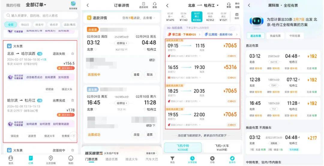 文丨谢媛媛 谭露露 胡 莹 杨柏玲 编丨 曹慧敏 归心似箭的打工人,为抢一张2024年的春运票,使出了洪荒之力。 “为了抢上300多元的车票,我买了150元的加速包”,27岁的顾周说,为了抢票她在12306、携程、同城、去哪儿等多个App上同时候补着。 “一千多的机票仅在几天时间就涨到了7000多元,我终于死心了。”东北人陈亮感慨,东北旅游火了,东北人却回不了家。他在深圳的东北老乡,甚至考虑过如何跨国回东北,譬如在曼谷、首尔转机。 “为了节省点费用,打工人们盯上了‘红眼航班’。但细算才发现,若加上时间成本、打车费用,自己甚至连‘红眼航班’也坐不起。”28岁的妙妙埋怨说。 随着春节临近,如何成功抢票,成了打工人的头等大事。抢票开始之前,他们天天翻日历,生怕错过开票时间;抢票期间,他们每天疯狂刷手机,同时使用多个软件保证成功率;抢票成功后,如果买到的不是最佳路线,还会继续骑驴找马。 据1月16日国新办发布会预测,2024年春运期间,全国跨区域人员流动量将达到90亿人次;铁路、公路、水路、民航等营业性客运量将超18亿人次。据民航局预测,春运期间民航运输旅客量将达到8000万人次,日均200万人次,有望创历史新高。 为此,本期小酒馆,镜观台约上了几位一线城市的打工人,聊了聊他们回家的抢票秘籍和心得体会。 其中,有人选择12小时的无座绿皮火车回家;有人转车多趟,只为赶在腊月二十九前回家团聚;有人割肉买了涨价机票;有人虽然幸运地买到了回家的票,却仍在为返程票发愁…… 2024年春节,将是中国人近四年里最热闹的团圆年。 回家过年的路虽然艰辛,但在外地打工人看来,只要能回家团聚,就是值得的。 为抢票,我买了150元的加速包 顾周(化名)丨27岁 财务 临近年关,我妈每次打电话的时候都会提醒我抢春运票。 但春运票并不是我想抢就能抢到的。网友们的抢票速度很快,前一秒12306 App还有票,后一秒我要付款的时候,票就卖没了。 为了能够抢到票,我在12306、携程、同城、去哪儿等多个App上同时候补。本着“不管黑猫白猫,能抓到老鼠的就是好猫”的心态,在做选项勾选的时候,我不仅勾选了硬座,还勾选了无座。 抢票还没开始,我就提前在各大App购买了抢票加速包。为了增加抢票成功的几率,我购买加速包的原则就是买最贵的。即便我已经是去哪儿App的钻石会员了,但为了保险,还是又拜托了一个携程年费会员帮忙抢票,然后又花了150元购买加速包。 ![]() 来源受访者/供图 最后,在加速包的作用下,我在去哪儿平台上抢到了北京到长春的绿皮火车无座车票,车程时长高达12个小时。而且,这个无座车票并非是乘客车厢,而是餐车里的无座。 还想拼一把的我,次日又登录了12306平台,凭借“王者手速”抢到了一张凌晨一点到凌晨四点的高铁票。预计,我能够在凌晨五点到家。 但我还是没有退掉150元的加速包,任由加速包在后台勤勤恳恳地帮我抢票。每隔10分钟,我就会去瞅瞅加速包是否消极怠工,是否抢到票了。 现在我还会时不时祈祷,希望加速包能帮我抢到车程时长更合适的票。 东北火了,东北人却回不去家了 陈亮(化名)丨35岁 文案 对于东北孩子而言,不管“漂”得多远,回家过年都是必然的坚持。哈尔滨的爆火,给我沉寂的东北老家带来了久违的热闹和人气儿,也让我第一次因为自己是个东北人而感到骄傲。 然而,从今年春运火车票开售的那天起,我就笑不出了。 为了这个春节能安安稳稳回家,我特意提前请了四、五天年假,想着错峰出行。然而从腊月二十六的票抢到腊月二十九的票,从硬座到动车再到高铁,我依然没有抢到一张回家的火车票,抢票界面经常是一秒售罄。 朋友问我为什么不飞回去,答案是飞不起。回家的高铁票要700元,遭点罪的话,卧铺最便宜只需要300多元,飞机票最少也要一千多元。看着仍在候补中的火车票,咬了咬牙打开了机票界面,但是打开的第一秒就关上了,看到一千多元的机票仅在几天内就涨到了7000多元,我终于死心了。 ![]() 图/陈亮抢票软件截图 来源/陈亮提供 在深圳打工的朋友也在做春运回家的攻略。前不久,他在抖音和小红书上看到有博主正在教大家以跨国的方式回家,比如“如何在曼谷、首尔转机回东北”。 他对我说,之前看到有网友晒截图,从杭州到长春的往返机票需要4354元,但通过首尔转机只要2510元。但不知道需不需要签证,如果还需要办签证,就太麻烦了。 机票买不起,火车票抢不到,我只好联系租车回家的朋友。但租车回家也没有我们想象中那么顺利,我们想到了春运堵车,却没想到租车价格也高得离谱。 就在我们纠结要不要租车回家的当晚,他抢到了一张从北京到哈尔滨的硬座,比沈阳多坐4站。他的票价支出也在原来300多元的基础上,又增加了200多元,但至少有票回家了。我也抢到了一张大年三十的卧铺,但是到达时已经是大年初一的下午了。 这期间我也没放弃,经过不断抢票终于侥幸成功,抢到了一张从北京站坐16个小时到哈尔滨站的票。下车后,要在1小时之内赶到哈尔滨西站,坐高铁一等座回牡丹江。尽管转车很麻烦,时间也很赶,但是好在能在腊月二十九回家了。 现在,我还在候补着直达的动车高铁票以及火车卧铺票,但心态已经平和了。过年嘛,折腾点没事,毕竟只要能回家,怎么都行。 春运期间,我连“红眼航班”都买不起 妙妙(化名)丨28岁 运营 每年春节回家,我最愁的就是抢票,每次抢票