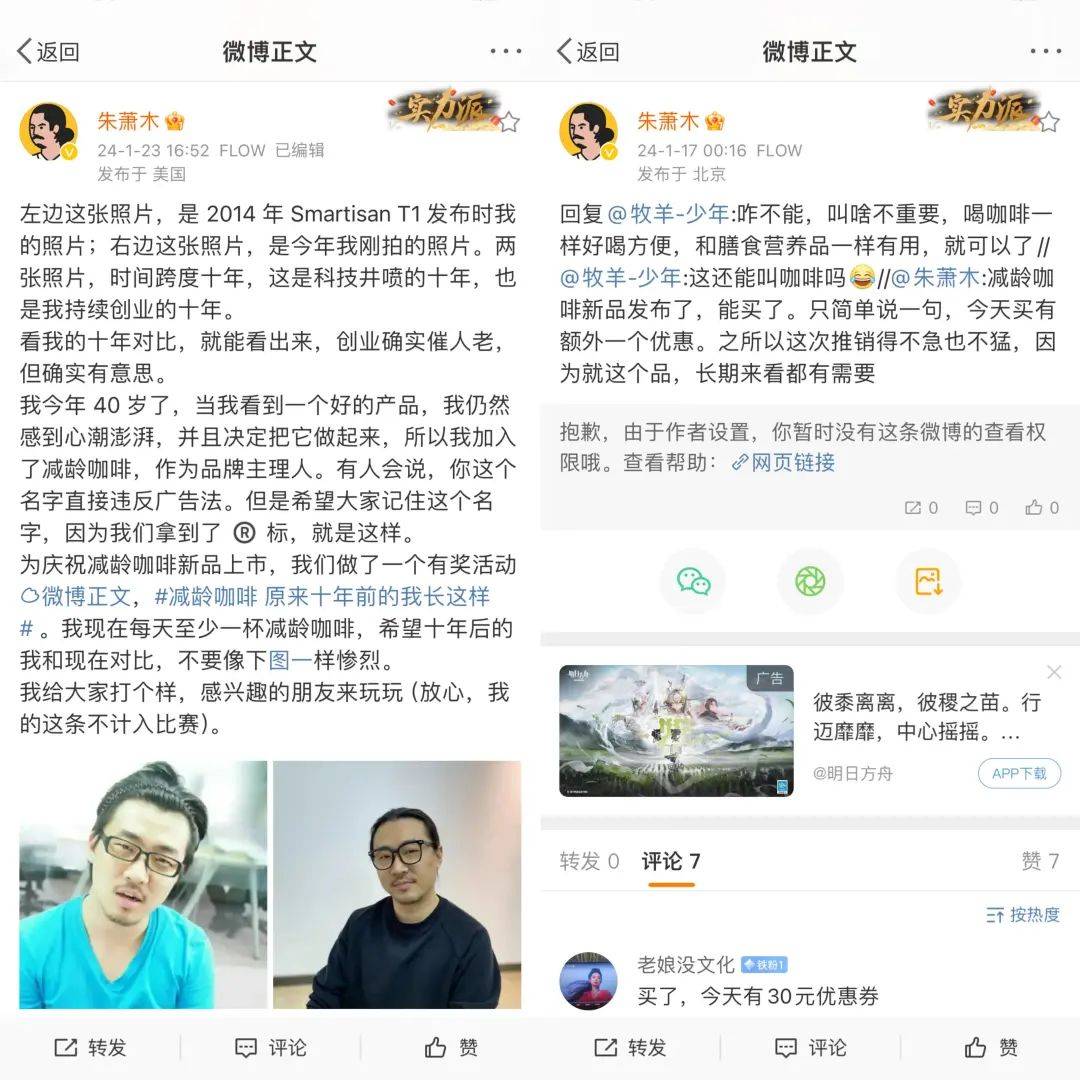 来源|电商在线 文|刘奕琦 编辑|斯问 对于做消费品这件事情,朱萧木似乎有些执念。2023年年末,他带着新产品“减龄咖啡”,以主理人的新身份进入了大众的视野。 朱萧木身上有很多标签,这些标签大多和罗永浩有些关系,例如罗永浩身边的男人、“交个朋友”首席主播、锤子科技0001号员工。大部分人对他最深刻的印象,停留在罗永浩首播时他作为助播的形象。 而他微博的个人主页上,只有一句简短的介绍:FLOW福禄创始人CEO。 ![]() 创立初期,FLOW曾乘着电子烟的风口高速增长,2019年获千万美元融资。受政策和行业趋势影响,最终走向了下坡。2022年,品牌宣布在中国市场正式停产水果及非烟草风味烟弹产品。 “想赢,很上瘾,所以我还想再搞一次”,在接受《中国企业家》专访时,朱萧木这样说道。他的野心,也被赤裸摊摆在了台面上,自今年1月以来,朱萧木共发布了16条减龄咖啡相关的微博,内容从新品上线倒计时、到个人产品体验分享、再到抽奖活动海报。 “我见过50万个SKU,从来没有见过这么一种产品,让我如此心动”,他曾这样感慨道。减龄咖啡是否真的有效?是不是智商税?不留余力宣传的背后,产品依然饱受看客们的质疑。而它是否能支撑起朱萧木“想赢”的野心,也还需要打一个巨大的问号。 靠佣金拉人头 2023年8月,朱萧木第一次在微博平台,和减龄咖啡“合体”。“强烈推荐这个咖啡品牌,我天天喝”“带货了这次,抗衰咖啡,英国的,好东西就别藏着掖着”...他连发了多条宣传内容。 彼时,减龄咖啡有个洋气的品牌名,叫做uda。 从减龄咖啡发布的品牌历程来看,uda公司成立于2021年,由杨吉祥联合多名科学家共同创立,总部在英国。uda第一代咖啡产品经诞于2022年,品牌在2023年6月进驻京东,并开设海外官方旗舰店。如今uda的店铺和社交账号已经注销。 虽然当时还没有以主理人的身份亮相,但彼时的朱萧木已经为这一轮创业埋下了伏笔。去年5月,朱萧木本人账号首次在视频号里发布内容。第一篇就是分享据传有抗衰功效的“高压氧仓”。后续又接连分享了轻断食、地中海饮食等多个较为小众的饮食方式,主打的主题标签一直是“抗衰”和“健康”。 ![]() 于此同时,他也在微博、小红书等多个渠道上分发视频内容。但总体反向平平,以内容传播效果最好的视频号为例,热度最高的一篇点赞数超过5000,大部分内容点赞数都徘徊在200左右。 减龄咖啡一盒31条,一条5克,新品上市期间优惠20元,在电商平台目前的销售价格是330元。从克数上对比,这个价格和三顿半相近。但三顿半一份的价格是2克,在消耗咖啡杯数同等的情况下,三吨半的用户购买频次可以远低于减龄咖啡。 价格是一方面,对于品牌而言,流量同样是吸引用户的关键。迄今为止,除了依靠朱萧木本人的流量和登过一次“交个朋友”的直播间,减龄咖啡还没有搭上其他KOL的顺风车。据观察,通过私域渠道,裂变发展新用户的微商模式,目前是减龄咖啡投入力度最大的玩法。 打开减龄咖啡的小程序,可以看到品牌推出的咖啡推荐官新年快闪活动。成为推荐官可获得20元优惠券;首次分享成功可获10元现金红包;分享好友购买产品也可以获得20%的佣金。 回顾市场上大部分微商品牌,基本上都有两个特点,一个是上线可以赚取下线的佣金,另外一个特点是有明确的等级之分。 ![]() (减龄咖啡小程序相关内容) 这两个特点在这场活动上均有展现。进入减龄推荐官中心后,可以看到邀好友的功能。活动介绍表示,邀请成为减龄推荐官的好友,如果成功推荐其他用户购买产品,你也能收到相应比例的佣金奖励。这是一个为期28天的定时活动,但品牌表示即便是活动结束,推荐官等级依然保留,且活动会不定期举办。 玩文字游戏的“减龄咖啡” 近两年,咖啡是一个备受关注的赛道。据艾媒咨询数据显示,2021年中国咖啡市场规模约为3817亿元,预计在2023年将达到6178亿元。 和朱萧木携手推出减龄咖啡的,是游戏公司Tap4Fun的创始人杨祥吉。两人相识已久,他同样投资了朱萧木参与的锤子科技和FLOW电子烟。《中国企业家杂志》报道称,近几年,他一直在研究抗衰领域,投资了很多欧美的生物科技公司。 “减龄咖啡”,从字面意义上看,理所当然会觉得是一款具有“减龄”效果的功效型咖啡产品。但事实并非如此,“减龄”更像是一场文字游戏。 起初,很多人都会奇怪“减龄咖啡”这一说法是否会违反广告法。朱萧木在微博回应称,希望大家记住这个名字,团队已经拿到了®️标(代表已注册商标)。据了解,一般带有®️的标志,表明该商品受到法律保护,任何企业未经持有人的授权,不能使用。但这和“减龄”一词是否违反广告法并没有太大的关系。 ![]() 今年1月举办的“2024异想大会”上,朱萧木给出了解释,“减龄”只是品牌名称。在官方的相关介绍里显示:减龄咖啡是食品,产品的包装盒上,我们也能清楚看到“固体饮料”几个大字。 减龄咖啡,是否真的有减龄效果,依然值得存疑。即便如此,朱萧木和杨祥吉在对外宣传上,无论是在功效、研发团队、还是产品成分,都无不夹杂着“可以让人变得年轻”的信息。 2023年年底的一场品牌线下活动中,朱萧木用一整页的PPT,向现场观众展示了自己的一根白头发。“接下来我说完这句话,你们可能会觉得我是个骗子”,据他表示,自己接触减龄咖啡大约半年时间,不久前刚拔了一根白头发,发现发根是黑