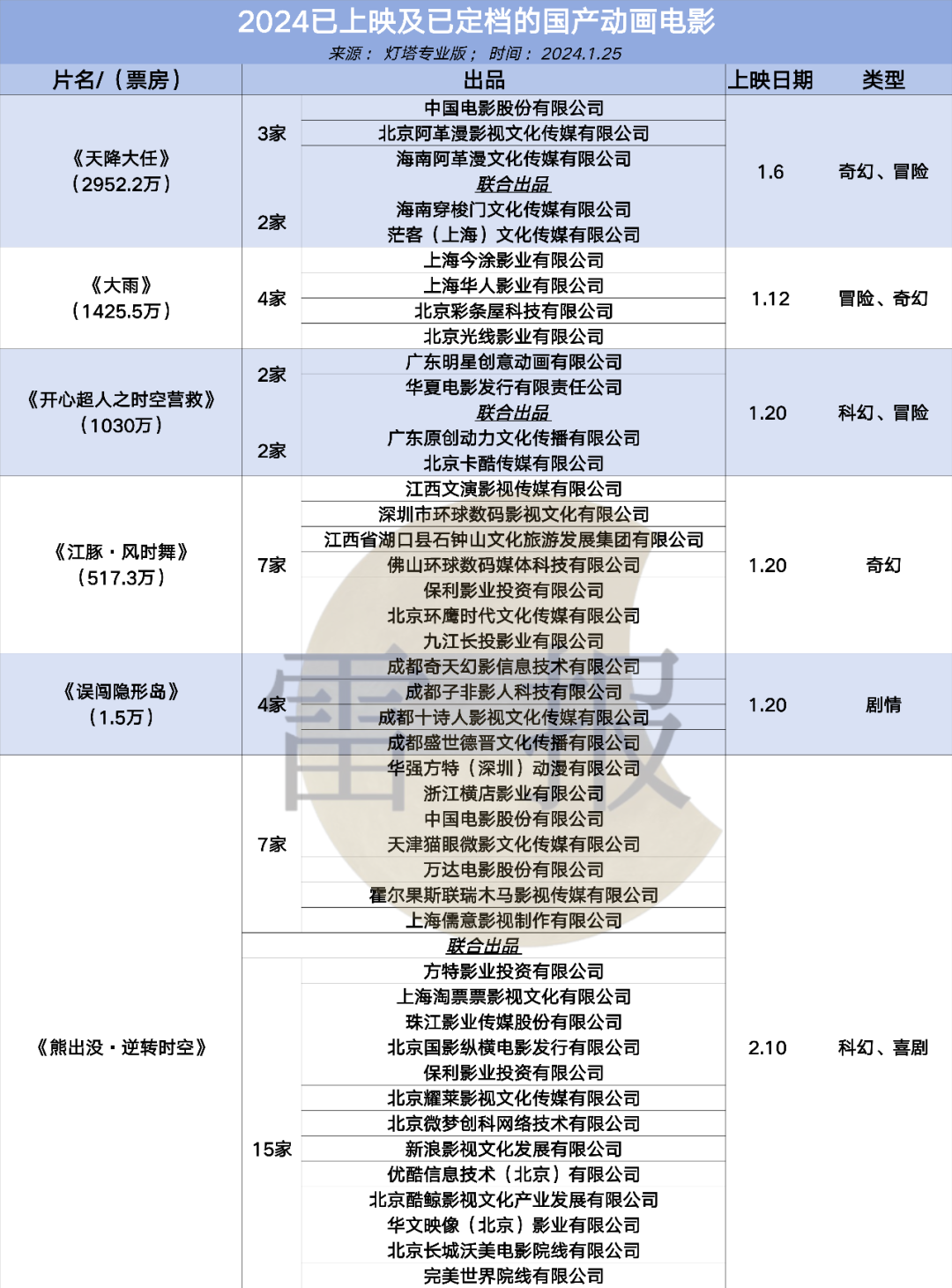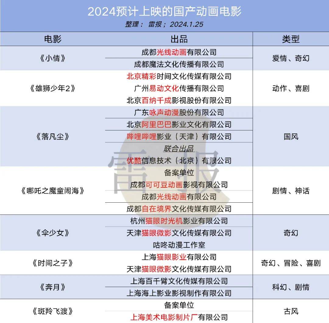 作者:晓艳 编辑:努尔哈哈赤 去年暑期,《长安三万里》收获超过18亿票房,冲进中国内地影片票房总榜第37。开年,儿童向的《熊出没》系列新电影也有近15亿,原创奇幻动画电影《深海》则最终以9亿多的票房成绩收尾春节档。 《长安三万里》的片方分账票房为6.59亿、《熊出没》则达到了5.43亿,作为内地上映动画电影总体票房排名的第二名,《长安三万里》的头上还有《哪吒之魔童降世》,后者现在还通过超50亿的票房稳坐内地上映电影票房榜的第四名,甚至超过了同年上映的科幻巨制《流浪地球第一部》。一定程度上,对于相关公司和从业者来说,到了现在,动画电影票房收入的阀值已经到了新的水平,一方面上限可以很高,另一方面也多了越来越多的确定性。 简单来说,动画电影是有机会赚钱的。 ![]() 到了2024,新一轮的动画电影已经在陆续上新,同时还有多部作品定档,或预计今年上映。具有“钱途”的动画电影行业,今年又会是哪些企业通过院线作品大放异彩呢?这部分的产业经济价值会由“哪些公司”撬动?它们又在如何布局? 01 2024已上映、定档国产动画电影:光线、华强方特、万达、儒意、咏声、追光等参与其中,近期行业“票房惨淡” 首先是2024已经上映的国产动画电影作品,《天降大任》“首当其冲”,中国电影股份有限公司等3家公司参与出品该影片,还有两家公司联合出品,目前票房接近3000万,为奇幻、冒险类型动画。 此外是《大雨》,由上海今涂影业有限公司、上海华人影业有限公司、北京彩条屋科技有限公司、北京光线影业有限公司4家公司共同出品。目前票房为1425万元,已上映14天。票房走势不太尽人意。 公司层面,其中北京彩条屋科技有限公司为光线影业子公司。光线在2015年成立彩条屋这一厂牌,此后《大护法》《大鱼海棠》《妙先生》《姜子牙》等动画电影都有彩条屋参与出品,《哪吒之魔童降世》《深海》等作也一样。另上海今涂影业有限公司为上海华人影业有限公司旗下公司,成立于2016年,后者目前仅参与出品了《大雨》这一部院线电影,华人影业曾参与《孤注一掷》《奇迹·笨小孩》《金刚川》等多部作品。 ![]() 《开心超人之时空营救》目前的票房也达到了1000多万,由广东明星创意动画有限公司、华夏电影发行有限责任公司出品,广东原创动力文化传播有限公司、北京卡酷传媒有限公司联合出品。 知名国内IP公司奥飞娱乐在广东明星创意动画有限公司持有近20%的股份,为该公司第二大股东,同时联合出品方广东原创动力传播有限公司也是奥飞的全资子公司。该作的另一联合出品方北京卡酷传媒有限公司由北京电视台投资控股,依托着北京电视台这一播出平台。可以说是来自平台的投资。 《江豚·风时舞》的票房目前为517.3万,为奇幻类型动画,电影《误闯隐形岛》于1月20日上映,目前票房为1.5万。 ![]() 而对于定档影片来说,首先非常值得期待的便是《熊出没》系列,该IP第十部大电影《熊出没·逆转时空》将于大年初一上映院线。从出品方的角度来看,出品公司共计7家,另外还有15家公司联合出品该影片。 出品方队伍中,除了IP方华强方特,还有横店影业、中国电影股份、猫眼微影、万达电影、联瑞木马、儒意影视等公司。可谓“群星云集”。 联合出品方中,淘票票、保利影业、耀莱影视、微梦创科(微博)、新浪影视、优酷、华文映像等公司也在其中。影视公司,社交、视频、票务等平台都希望能从《熊出没》电影中分一杯羹。 之所以能有这么多强势公司的入局,基于《熊出没》系列稳健的票房成绩,一年一部的节奏,自2014-2023,熊出没系列电影的票房分别为2.47亿、2.95亿、2.87亿、5.22亿、6.05亿、7.17亿、5.95亿、9.77亿、14.95亿(2020年未有新作上映),目前熊出没系列总票房已经超过57亿。在去年,“熊出没”电影也有5家公司参与产品,15家公司进行联合出品。有不少公司是熊出没坚定的出品方。 电影《八戒之天蓬下界》则有4家公司参与出品,多达22家公司联合出品。出品方有北京环宇星漫文化传播有限公司、中青新影文化传媒(北京)有限公司、海南联合企业管理集团有限公司、金马瑞业(北京)文化产业有限公司等公司。联合出品方中有上海秦时明月影视文化传播有限公司等。将于2月10日上映。 来自咏声的《猪猪侠大电影·星际行动》预计将于今年五一档上映。去年五一档上映的猪猪侠系列大电影收获票房超5000万。 7月底还有《二郎神之深海蛟龙》,出品方有前面提到的华文映像等公司。 ![]() 《白蛇:浮生》可以说非常值得期待,作为追光动画的作品,《白蛇:缘起》于2020年上映,取得4.68亿票房,2021年上映的《白蛇2:青蛇劫起》票房为5.80亿,《白蛇:浮生》是白蛇系列的第三部,将于今年七夕,8月10日上映。 出品方除了上海追光影业有限公司,还有上海儒意影视制作有限公司。《熊出没·逆转时空》,儒意影视也参与了出品。 去年12月12日,北京万达文化产业集团有限公司、北京珩润企业管理发展有限公司及王健林与上海儒意投资管理有限公司签署股权转让协议,拟分别将其持有的万达电影股份有限公司控股股东北京万达投资有限公司20%、29.8%和1.2%股权 (合计51%股权)转让予儒意投资。 而在此之前,去年7月,万达方面(万达文化)已经和儒意影视签订《股权转让协议》,表示拟将北京万达投资有限公司49%的股权转让予上海儒意。万达