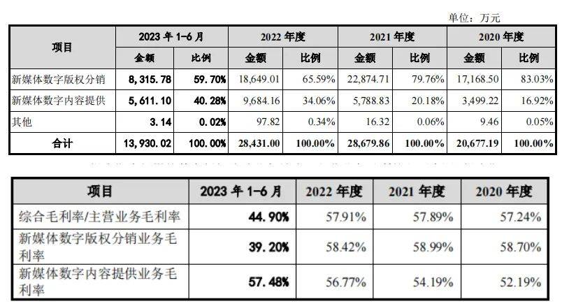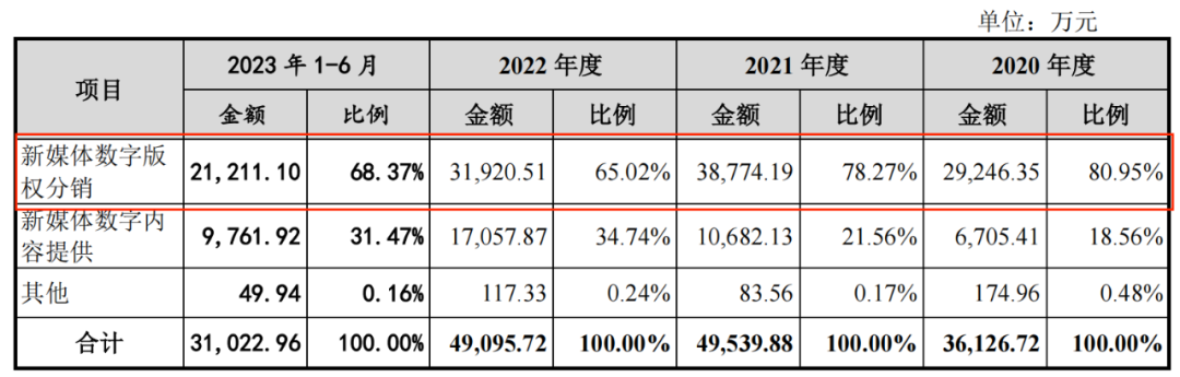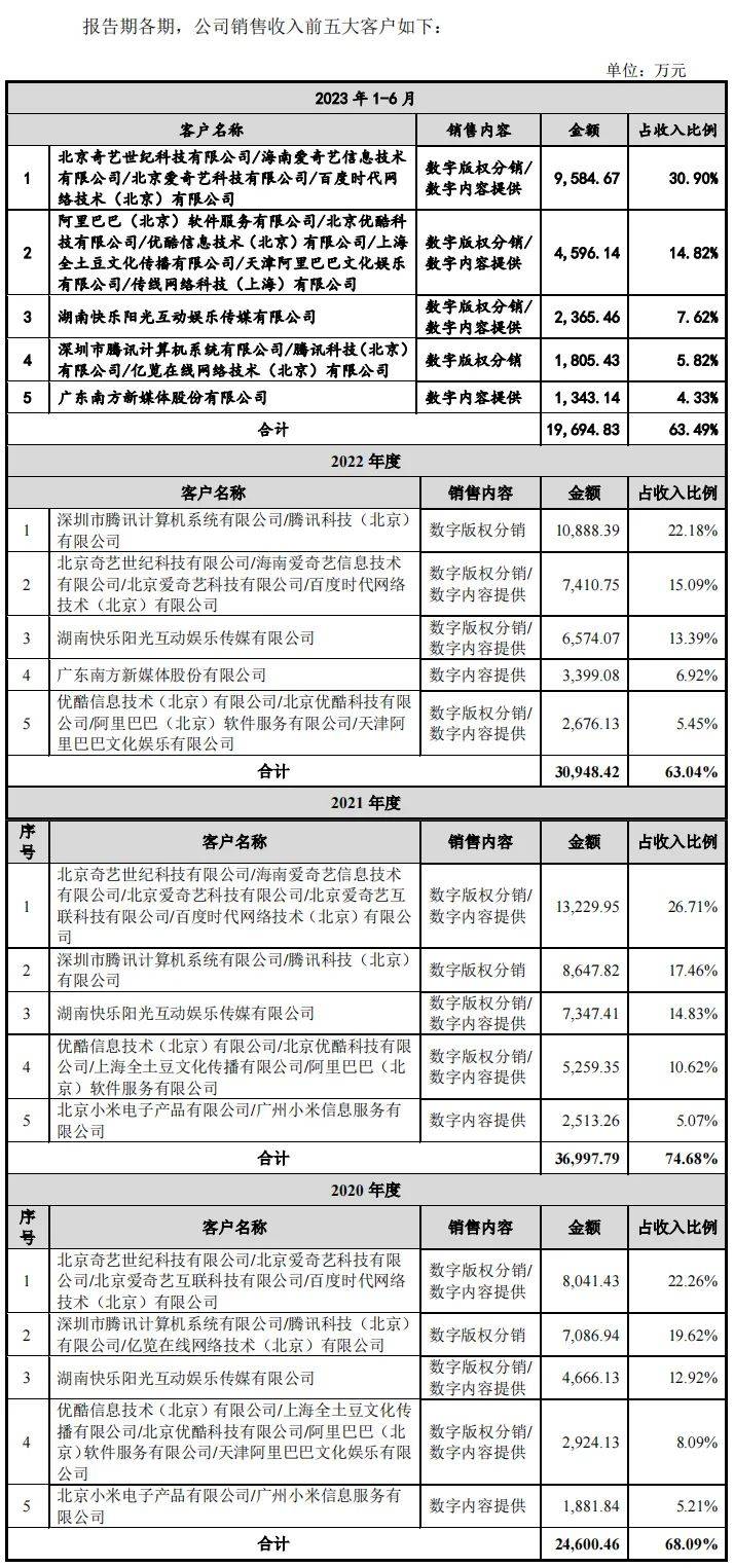 作者:段轻 编辑:努尔哈哈赤 2023年6月29日,拥有“汪汪队立大功”“小猪佩奇”“海绵宝宝”等知名IP版权的数字版权分销商上海森宇文化传媒股份有限公司(森宇股份)递交招股书,拟登陆深交所主板。该份招股书显示,森宇文化22年收入4.9亿,净赚1.55亿。 近期,雷报再次获悉,森宇文化于2023年12月31日更新招股书,并将相关财务数据更新至2023年6月30日。 根据最新招股书数据,2020年、2021年、2022年、2023年1-6月,森宇文化营收分别达到3.6亿元(36,126.72万元)、4.95亿元(49,539.88万元)、4.91亿元(49,095.72万元)和3.10亿元(31,022.96),扣非归母净利润分别为9887.85万元、1.58亿元(15,842.26万元)、1.55亿元(15,472.90万元)和0.71亿元(7,081.02万元)。 ![]() 本次深交所IPO,森宇文化拟向社会公开发行不超过2,000.00万股人民币普通股(A股),本次发行的募集资金总额将视市场情况及询价确定的发行价格确定。 雷报【微信:leinewspaper +关注】还注意到,森宇文化报告期内持股10%以上,同时也是森宇文化的创始人之一的重要股东崔惠玲,10个月内将所持股权清仓转让。而自2010年创立公司到2019年初,崔惠玲始终系森宇文化第一大股东、实控人之一,最高持有近45%的股权。 版权分销业务半年收入2.1亿,“优爱腾芒”是最大的客户 森宇文化主要从事动漫、电视剧、电影等视频节目的【新媒体数字版权分销】业务和【新媒体数字内容提供】业务。 截至2023年6月末,森宇文化已积累了 6.74 万小时的视频节目储备,内容涵盖动漫、电视剧、电影、综艺、纪录片等多维度视听资源,覆盖了全渠道下游新媒体终端。 最新招股书介绍,报告期各期,森宇文化主营业务收入分别为3.6亿元、4.95亿元、4.91亿元和3.10亿元。其中,【新媒体数字版权分销】业务收入是森宇文化的主要收入来源,分别为2.92亿元、3.88亿元、3.19亿元和2.12亿元,占主营业务收入的比重均在65%以上。其他组成部分包括基于数字版权的衍生品授权等收入,金额和占比均较小。 ![]() 【新媒体数字版权分销】业务中,森宇文化自版权持有者处购得数字版权后形成版权内容库,再以单片或集合的形式对外出售,从而获得数字版权分销收入。 该业务已覆盖包括腾讯、爱奇艺、芒果、优酷、哔哩哔哩、抖音、快手、搜狐等主流新媒体互联网视频平台以及移动端视频媒体。 据悉,森宇文化于2012年即与爱奇艺合作开展新媒体数字版权分销业务,合作已超过10年,报告期内,爱奇艺历年对其销售收入均在 7000 万元以上;森宇文化于2012年与腾讯建立合作,合作关系已达到 11 年,报告期内,腾讯历年对其销售收入均在 7000 万元以上;优酷也一直为森宇文化前五大客户,公司历年对其销售合计超过1亿元;森宇文化也和芒果建立了合作关系,2021年和2022年对芒果的销售收入均在6000万元以上。 招股书显示,2023年上半年,爱奇艺为森宇文化贡献了9584.67万元收入,占比高达30.90%;优酷贡献4596.14万元,占收入比例14.82%;芒果贡献2365.46万元,占收入比例7.62%;腾讯贡献1865.43万元,占收入比例5.82%。 ![]() 【新媒体数字内容提供】业务中,森宇文化根据客户及市场需求投放相关视频节目,并提供内容策划、宣传和推广等服务。客户根据森宇文化提供的视频节目数量、质量以及用户点击量等向其支付分成收入。 该业务主要客户为 IPTV 运营商、OTT TV运营商、数字电视运营商和三大电信运营商视频平台。 2020年、2021年、2022年及2023年1-6月,森宇文化【新媒体数字内容提供】业务收入分别为6705.41万元、1.07亿元、1.71亿元及9761.92万元,占主营业务收入的比例分别为18.56%、21.56%、34.74%及31.47%。 ![]() 截至最新招股书签署日,森宇文化IPTV 数字内容提供业务已覆盖21个省市自治区的IPTV 集成播控平台运营商,主要客户包括广东南方新媒体股份有限公司、海看网络科技(山东)股份有限公司、江苏广电荔枝网络发展有限公司、广西广电新媒体有限公司、浙江广电新媒体有限公司、吉林广电新媒体有限公司等;OTT TV数字内容提供业务已覆盖小米、海信、康佳、华为等境内主要智能终端厂商;公司数字电视内容提供业务已覆盖11个省市自治区,主要客户包括广东弘视数字传媒有限公司、福建广电网络集团股份有限公司、中国广电重庆网络股份有限公司、广西耀象文化传播有限责任公司等;移动端数字内容提供业务已全方位覆盖中国移动、中国电信、中国联通等三大电信运营商视频平台。 版权分销成本占比高达75%,毛利率下降;创始人清仓,现实控人低价受让 森宇文化主营业务成本方面,2020年、2021年、2022年、2023年1-6月分别为1.54亿元、2.09亿元、2.07亿元及1.71亿元。主要是新媒体数字版权分销成本,2023年上半年,这一成本占比达到了75.44%。 ![]() 报告期各期,森宇文化毛利率分别为 57.24%、57.89%、57.91%和 44.90%,整体处于较高水平。不过,因部分动漫版权成本增加,2023年1-6月期间森宇文化毛利率有所下降。 另外,2023年上半年,【新媒体数字内容提供】业务的毛利率占比超过了前三年一直领先的【新媒体数字版权分销】业务。报告表示,随着新媒体数字内容提供业务规模的扩大,规模效应进一步体现,毛利率有所提高。 ![]() 截至本招股说明书签署日,森宇文化董事长陈志永直接持有公司38.70%的股份,并通过员工持股平台宁波佳昌控制公司23.60%的股份,合计控制公司62.30%的股份,是公司的控股股东、实际控制人。IPO之后,陈志永直接持股比