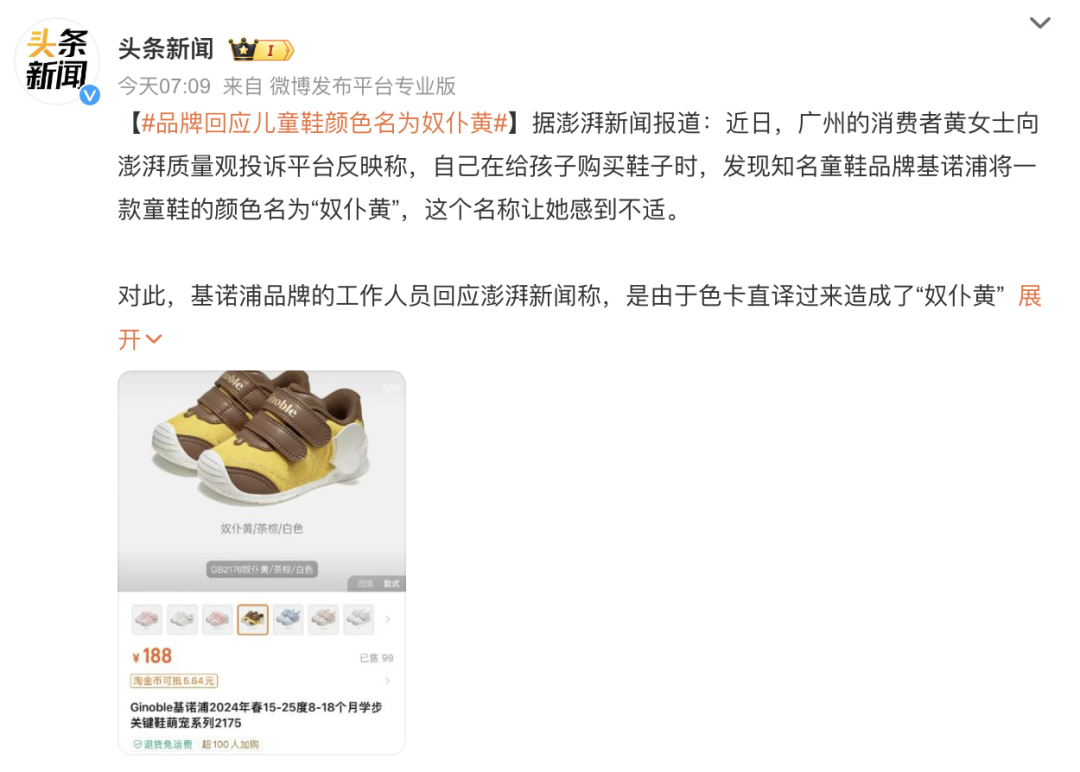作者 | 阿辉 来源 | 互联网品牌官 编排 | 阿辉 审核 | 日尧 01 临近年底,总有些品牌想要整些幺蛾子,在互联网边缘反复试探。 花活玩得好,或许还能博众人一乐,要是玩不好,那就真成了搬起石头砸自己的脚,就像今天要提到的这家知名童鞋品牌。 明明是在中国卖童鞋,颜色却叫“奴仆黄”,你敢信? “东亚病夫”的帽子都摘多少年了好吗? 我只能说,它是懂如何在这喜洋洋的日子里给大家添堵的。 事情是这样的,前几天广州黄女士准备给儿子买双童鞋,为此她专门在知名童鞋品牌基诺浦的天猫旗舰店看了下,这一看可不得了,一双黄色的婴幼儿宝宝学步鞋在颜色栏赫然标注着“奴仆黄”字样。 明黄、淡黄、柠檬黄;橘黄、鹅黄、亚麻黄,明明那么多种黄色,它却偏偏挑了个最能挑拨大众神经的名字,果然,搞事情还得是你啊基诺浦。 ![]() ▲ 图源:微博@头条新闻 感受到被冒犯的黄女士马上将此事反馈给了店铺客服人员,对方表示将上报反映,却并未给出一个合理解释。 一个值得注意的点是,除了黄色外,该款学步鞋其他颜色均正常标注为“茶棕”、“白色”字样,只有“奴仆黄”极为突出。 这实在让人难以理解,“奴仆”和“黄色”有什么关系?和“儿童”又有什么关系?为什么非要这样定义? 当然,到这里还不能确定就是店家有意为之,万一是工作人员手抖打错字了呢? 于是黄女士又去了基诺浦京东旗舰店,发现该款学步鞋在京东平台同样标注为“奴仆黄”,看来这并非手误,而是官方命名如此。 此事被曝光后,立马引起了轩然大波,社交平台上也有许多家长发文表示不满,希望品牌给出一个合理的解释。 显然,与黄女士有同样遭遇的消费者不止一人。 作为一家知名品牌,无论是有意为之还是无心之举,犯下这样的错误都让人难以理解,但不可否认的是,经此“奴化”幼童事件,基诺浦算是摊上大事了! 02 吃瓜群众义愤填膺的时候,品牌方也陷入了舆论漩涡。 有人说这是借“奴仆黄”奴化中国儿童,伤害民族感情不可原谅,也有人说不过就是个乌龙罢了,不要太上纲上线。 那么说到底,基诺浦在这件事中到底冤不冤? 答案似乎显而易见。 在媒体报道中,另一位消费者韩女士也曾向基诺浦店铺客服提出质疑,得到的答复是“颜色由国外设计师取名,可能对中文不太理解导致”;另有记者联系品牌,工作人员则回应称是由于色卡直译所造成的翻译错误。 在色卡上,该颜色名为minion yellow而单词minion在英文中有着“奴仆”的意思,因此在机器翻译时就有了误会。 ![]() ▲ 图源:网络 但显然,无论是哪种原因,品牌方未能尽到核查义务、伤害了消费者情感是既定事实。 毕竟无论机翻还是国外设计师取名,但在上架电商平台前详情页、商品sku都应存在审核流程,而整个流程中无一人提出问题,那么问题到底出在哪里? 事实上,在此前并非没有品牌使用minion yellow这一颜色。2015年,国际权威色彩机构PANTONE根据美国电影《神偷奶爸》推出了一款新颜色“minion yellow”,进行中文翻译时,便借助神偷奶爸电影角色将这一新颜色译为“小黄人黄”。 ![]() ▲ 图源:网络 因此,但凡基诺浦在使用该颜色时做些功课,也不会犯下如此低级之错误。 所以归根结底,这场“奴仆黄”事件,基诺浦挨骂确实不算冤。 截至目前,这款童鞋已经下架整改、相关词语也进行了更改和删除,无论天猫还是京东旗舰店都所搜不到该产品,但其造成的影响还没有结束。 这场“奴化”幼童事件,无论有意为之还是无心之举,对消费者以及品牌自身造成的伤害都难以弥补,这也不禁让人联想到近年来愈演愈烈的借儿童进行无底线营销之势。 03 儿童营销,本是针对或借助这一特殊群体进行的经营营销活动,极为常见。 诸如各行业针对儿童推出专用产品、快餐品牌推出儿童套餐来绑定家长用户、在六一儿童节推出活动进行怀旧营销等等。 但近年来,儿童营销却有着逐渐失控之势,“儿童”在品牌营销活动中往往处于“被冒犯”地位。 就比如去年年中火了一把的“奶辣风”。 所谓奶辣风,就是将放在成年人中也算性感的风格款式做成童装,一时间几岁的小女孩们边穿着露肩、露背、露脐装,一边呈现出奶声奶气的语气和姿态。 在商家大力推广与部分家长的盲目跟风下,孩子们穿着越来越“性感”,俨然成为了吸引流量、赚取利益的工具人。 这种以“奶辣风”标榜,以“成熟”甚至“性感”为卖点的童装,到底是在贩卖什么呢? ![]() ▲ 图源:微博@四川观察 又比如曾闹得沸沸扬扬的“阴间风”童装事件。 2021年,著名童装品牌江南布衣被曝出童装上印有“邪恶”图案,引发广泛争议。 网友发现,当时该品牌一些童装印有“Welcome to hell”、“ let me touch you”等字样,翻译成中文就是“欢迎来到地狱”、“让我摸摸你”,此外还配有撒旦、骷髅头等图案。 如果这些图案、词语出现在部分特殊成人服装上,或许还可以理解为是自我风格的展现,但印在童装上,就不免让人疑惑,品牌方是想要借此向儿童传达怎样的信息与价值观? 若论起性质,这两件事和此次“奴仆黄”事件可算是基本一致。 对于品牌而言,想要标新立异、剑走偏锋本无可厚非,但前提是要恪守底线,遵守公序良俗。 毕竟世上品牌千千万,当你给消费者留下了不好的印象,再想扭转用户认知可就难了。 文章来源:“互联网品牌官”,未经允许不得转载。 文章代表作者观点,版权归原作者