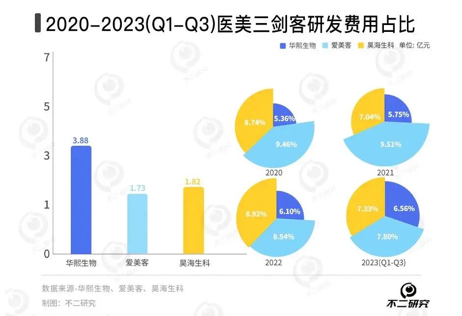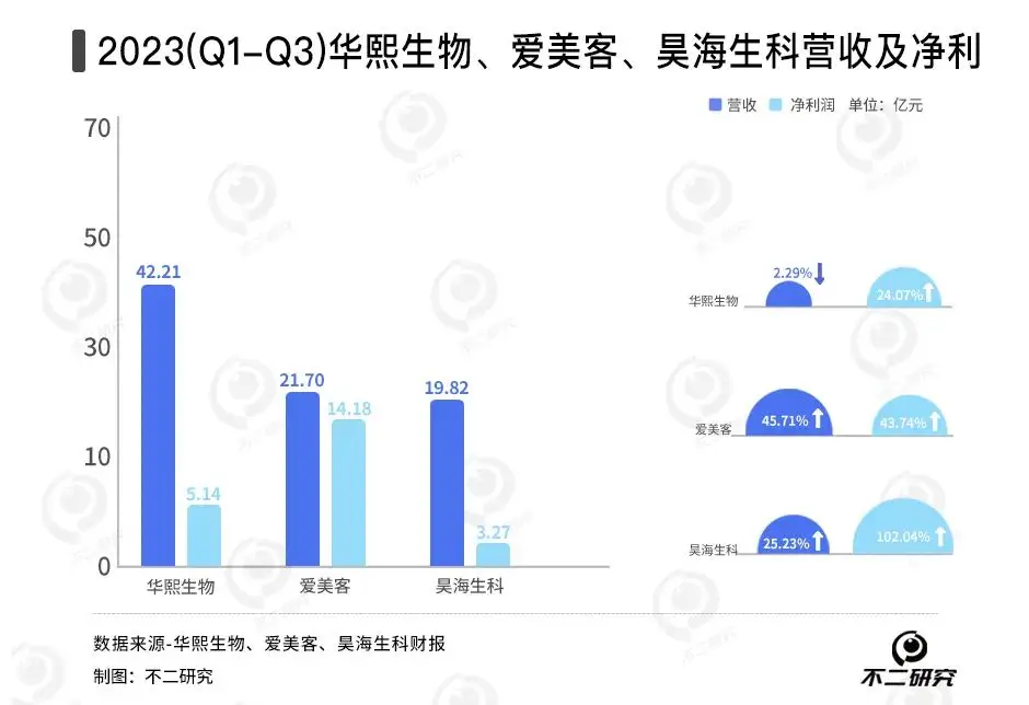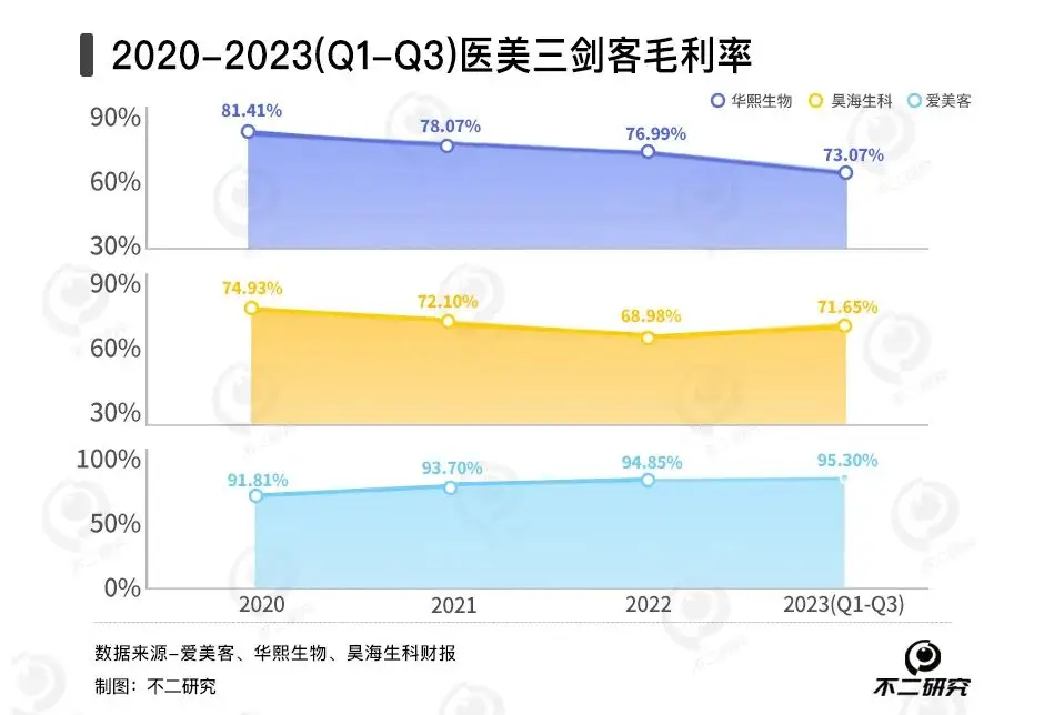作者 | 若楠 永阳 排版 | Cathy 监制 | Yoda 出品 | 不二研究 在颜值经济赛道上,医美项目逐渐成为消费主流。随着春节假期的到来,医美消费又将迎来高峰期。 “医美三剑客”中,爱美客(300896.SZ)、昊海生科(688366.SH)近日相继公布了2023年的业绩报告:2023年,爱美客预计实现净利润18.10亿元-19.00亿元,同比增长43%-50%;昊海生科预计实现净利润为4亿元-4.3亿元,同比增长121.64%-138.27%。 「不二研究」据其2023年三季报发现:2023年三季度,爱美客、昊海生科的净利润增长率分别为43.74%、102.04%。目前,昊海生科的净利增速碾压爱美客,在「不二研究」看来,这主要是由于爱美客过度依赖玻尿酸产品,以嗨体为主的溶液注射类产品营收增速下滑;与此同时,随着玻尿酸赛道竞争者增加,也已成为其不可忽视的风险。 爱美客是一家从事生物医用材料及生物医药产品研发与转化的国家高新技术企业。其已实现基于透明质酸钠的系列皮肤填充剂、基于聚乳酸的皮肤填充剂、面部埋植线的产业化。 截至2月6日A股收盘,爱美客报收320.5元/股,对应市值693.4亿元;昊海生科报收97.2元/股,对应市值166.7亿元。 ![]() 「不二研究」据两者的三季报发现:2023年三季度,爱美客、昊海生科的营收分别为21.70亿元、19.82亿元;营收增长率分别为45.71%、25.23%。 同期,爱美客、昊海生科的净利分别为14.18亿元、3.27亿元;净利润增长率分别为43.74%、102.04%。 2023年11月的一篇旧文中(《医美三季报内卷,华熙生物、爱美客、昊海生科混战双11》),我们聚焦于作为医美三剑客的爱美客、华熙生物、昊海生科三季报内卷,随着玻尿酸红利逐渐消失,其业绩也出现分化。 时至今日,爱美客、昊海生科不仅面临业绩分化等问题,还要直面医美产品同质化严重的挑战。 随着玻尿酸红利消失,医美行业竞争加剧,爱美客、昊海生科谁更赚钱?由此,「不二研究」更新了去年11月旧文的部分数据和图表,以下Enjoy: 2023年双十一落幕,据天猫大美妆数据统计,被称为“医美三剑客”的华熙生物(688363.SH)、爱美客、昊海生科的医美产品均未进入天猫双11美容护肤类目TOP10榜单。 「不二研究」据其2023年三季报发现,从业绩增速来看,昊海生科营收净利表现稳定;爱美客营利增速略逊一筹;而华熙生物营收净利双降。 从产品布局来看,华熙生物布局医疗终端产品、功能性护肤品、功能性食品等多线业务全产业链;昊海生科拓展眼科和医疗美容与创面护理产品;而爱美客则专注垂直细分赛道,同时布局肉毒素。 随着玻尿酸红利消失,行业内卷不断加剧;在竞争激烈的医美赛道中,医美三剑客谁能讲出新故事? 业绩:营利双降VS增长提速 2023年前三季度,医美三剑客的三季报均不理想。 具体来看,2023年前三季度华熙生物实现营收42.21亿元,同比减少2.29%;昊海生科实现营收19.82亿元,同比增长25.23%;爱美客实现营收21.70亿元,同比增长45.71%,三家中营收增速最快。 从净利润角度看,三季报数据显示:华熙生物净利润5.14亿元,同比减少24.07%,昊海生科净利润3.27亿元,同比增长102.04%,爱美客净利润14.18亿元,同比增长43.74%。 从净利润看,爱美客净利润水平最高,昊海生科增幅最为强劲,华熙生物直接掉队。 ![]() 「不二研究」发现,2021年被认为是玻尿酸元年,根据财报显示,2021年,华熙生物年营收增速87.93%;昊海生科营收增速为32.61%;爱美客营收增速则高达104.13%。 然而,2023年三季度,爱美客的营收和净利增速大幅放缓。其中,爱美客的营收增速放缓主要是由于以“嗨体”为主的溶液类注射产品收入增速下滑。 华熙生物营收和净利润大幅下滑,主要是由于功能性护肤品营收下滑和毛利率下降所致;与此同时,其近两年不断扩充护肤品C端市场,销售费用大幅提高也是导致其业绩下滑的原因之一。 据华熙生物财报显示,其2020-2023年前三季度销售费用分别为10.99亿元、24.36亿元、30.49亿元、19.43亿元;分别同比增长110.84%、121.66%、25.16%、-36.27%;营收占比分别为41.75%、57.96%、49.23%、47.95%。 而昊海生科则营收和净利润均实现大幅增长,得益于2023年上半年医疗美容与创面护理产品中玻尿酸产品收入高速增长,带动整体营收的增长。 ![]() 据昊海生科半年报显示,2023年上半年,其实现营收13.13亿元,同比增长35.66%,实现净利润2.05亿元,同比增长188.94%。其中,玻尿酸的营收是2.56亿元,同比增长114.35%。 在「不二研究」看来,未来,医美三剑客能否继续搭乘“颜值经济”快车高速前进,取决于其具体的产品布局及对未来格局的把控能力。 布局:多轮驱动VS垂直细分 尽管华熙生物、昊海生科以及爱美客共同被誉为玻尿酸A股三巨头,但其在玻尿酸领域的发展和布局却差异巨大。 在玻尿酸原料生产上,华熙生物的市场份额曾“一枝独秀”,据前瞻产业研究院报告显示,2021年中国玻尿酸原料总销量占全球销量82.00%,华熙生物玻尿酸原料销量则占全球44.00%。 这得益于其在技术上的优势,如微生物发酵技术、酶切和分子量精准控制技术、透明质酸“梯度3D交联”技术以及终端湿热灭菌技术,使其在成本和产效方面具有显著优势。 ![]() 爱美客则是在终端医美产品上异军突起。根据爱美客2022年报,其援引弗若斯特沙利文研究报告统计称,按2021年销售额计算,爱美客透明质酸钠的皮肤填充剂在国产制造商中排名第一,国内市场份额为21.3%。 昊海生科在玻尿酸原料生产、终端医美产品都有涉及,但在两个领域都没有绝对优势。 此外,据