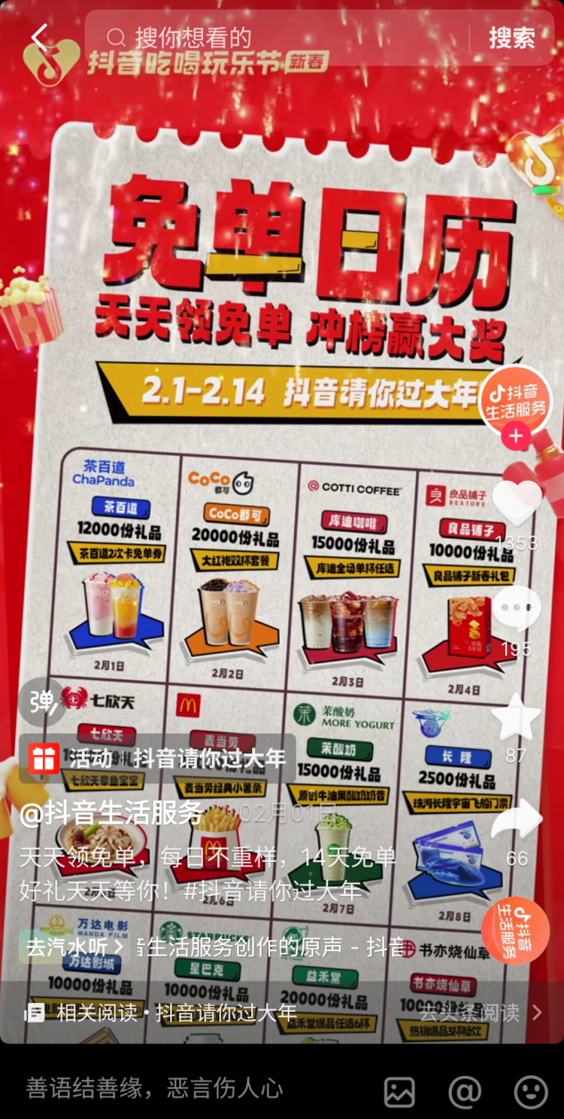 作者 | 李东阳 来源 | 首席营销官 凡节点出现,对各大商家而言是创造销量高峰的生意机遇。而对消费者来讲,则可能是一次实现“消费升级”的福利机会。例如,世界杯的节点,激动人心的看球氛围会带动消费者完成情绪消费;中秋、春节等传统节日,团圆的节日氛围会刺激消费者下单买月饼,买年货。 因此,“利益共赢”构成节点营销底层的价值驱动力。那么,如何利用节点营销来拓展固定的消费人群,激活自身市场活力,通过打造品牌的“新鲜感”,实现长效经营的目标? 今年就有不少品牌借助抖音生活服务平台的丰富资源,在春节期间打造专门的消费场域与消费者深度沟通,全新激活生意链条。 新年新节点,击中用户消费强需求 “吃喝玩乐X新年”引爆品牌增长点 这是一个从增量到存量的时代,每个行业都在寻找新的增长点,本地生活服务品牌也不例外,那怎么才能找到新的增长点呢? 《哈佛最受欢迎的营销课》一书说:核心在于创新。但创新并不一定要创造前所未见的产品,而是可以创新一种服务:消费场景、新卖点、新购买方式、新体验、新玩法等等。如,江小白通过创新白酒“社交”消费场景开创了白酒新品类。再比如,去年刷屏的酱香拿铁,就是茅台跨界瑞幸咖啡,走进了“茶饮”年轻人的消费市场。 从春节档营销来看,抖音生活服务在“创新”。从主题「抖音请你过大年」,我们就可以看到两大创新。 ![]() ![]() 二是“创新体验力”:设置社交新玩法,除了“免单”、“冲榜”这种消费者喜闻乐见的方式,线下打造门店拉横幅宣告中奖名单、礼物车炸街、压缩龙装置多场创意事件,在内容、交互和体验中助力众多品牌寻求新增长,而不是传统简单粗暴的“叫卖”。 除了战略定位的创新,策略创意又如何创新呢?是否能借助或制造爆点呢? 随着经济的强劲复苏,史上最长的春节假期为亿万家庭带来了前所未有的休闲时光,人们因此获得“合理纵情”的理由,趁机进行超日常满足,同时今年春节恰逢遇上情人节,更是年轻人关注与参与的焦点。因此在2024年春节这个特别的消费风口,抖音生活服务大力布局本次春节大促。 作为坐拥6亿用户的短视频生活方式分享平台,春节期间的美食探索" 和 "休闲体验"场景与抖音生活服务天然契合,由此创造了“吃喝玩乐X新年”的全新节日消费场景,带给消费者“边看边玩边买”的全新消费体验。 新年新玩法,福利新矩阵+裂变新玩法 促进商家高效转化 每一个营销成功的背后,最容易被人忽视的就是“转化”。那抖音生活服务又是如何在春节期间长达半个月的周期内,保持并不断提升消费者、“潜在消费者”变成“真正购买者”的转化率的呢? 针对这届消费者“爱围观不下单”、“省下就是赚到”、“我比别人买的划算”、“看重附加福利”等下单特征,抖音生活服务创新了众多玩法。 一方面,联合多家品牌打造超级奖金池,设置吃、喝、玩、游四个大奖榜单,利用各榜单排名第一的用户可获得超级大奖,刺激大众的参与感。与此同时,推出「天天领免单」、「冲榜赢大奖」丰富多样的福利矩阵,让一部分潜在需求用户先“玩”起来、行动起来。由此,率先带动了活动在整个平台的热度上升。 ![]() ![]() ![]() ![]() 新年新流量,站内外一体化互动 实现全域种草聚合 以增长为目标的节日营销,重在玩法、传播的多位合一。玩法创新之外,抖音生活服务在传播渠道上又有着怎样的新布局? 第一,借势明星影响力,粉丝自传播增强曝光度 明星效应,是能同时实现大范围传播与高效转化的途径。 看准这一点的抖音生活服务,邀请明星雷佳音深度参与拍摄4支「抖音请你过大年」活动视频。借力明星影响力,一方面,促发粉丝自传播提高活动曝光,另一方发挥偶像的粉丝种草力,直接撬动参与活动品牌生意增量。 ![]() ![]() ![]() ![]() 信息碎片化和人群圈层化的环境中,单个平台的发声显然无法促成其势能更广泛出圈。一方面,抖音生活服务与商户营销阵地进行联合宣发,形成内容合围,发酵活动话题;另一方面,整合超过50个品牌通过官微、微信公众号参与到此次的品牌主张发声中,充分联动已有资源势能,以“1+1>2”的化学效应盘活潜在客群,最大限度带动影响力扩散。 ![]() 联动效应之下,抖音生活服务与商户、品牌形成共生体,从消费人群到粉丝群体两大维度,打破圈层壁垒,将更广范围的用户引入平台活动的流量池,助力活动热度持续攀升。 第三,私域社群“助力文学”营销,触达年轻人兴趣点与参与点 不做广撒网式的低效投放,找准客群的核心阵地,建立精准有效的对话,是平台或品牌实现圈粉这届年轻人的第一步。 文学作为最直白的感官刺激,在情绪营销打得火热的时刻,突然出现的“文学”情绪,可谓是正好给品牌加了一个营销buff。为此,抖音生活服务找到了聚拢年轻人们的巨量阵地——社群,围绕热点话题,利用助力文学宣传抖音分享赢大奖活动,吸引大量社群成员的关注和互动参与,打造社交谈资,进一步增加活动曝光量。 ![]() 第四,线下建立连接点,打造场景创意事件、在话题、共创内容中撬动圈层传播 线上引爆只是抖音生活服务此次营销动作的一部分,更重要的是让用户切实感受“抖音过大年”的体验。 在接触点的选择上,春节到来之前,抖音生活服务创新性地将大众的返乡归家、出行游玩、吃喝欢聚等春节动线串联,通过小区、公交站