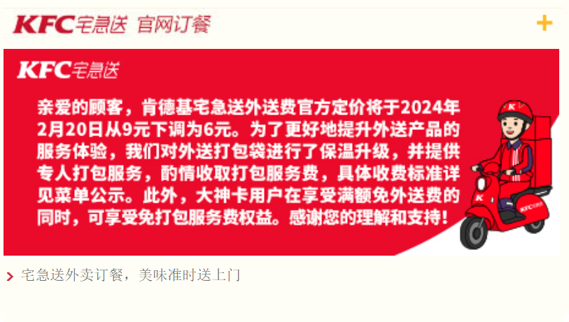 来源:趣解商业 此前仅在九江市试点收取打包费的肯德基,现在真的开始收取打包费了。不过,随着“肯德基全面开收打包费”冲上热搜,有网友吐槽肯德基“吃相难看”。肯德基为何要收取打包费,打包费为什么越来越贵呢? 1.肯德基宣布全面收取打包费 近日,肯德基在官网宣布,从2024年2月20日开始,肯德基宅急送的外送费将从9元下调到6元,不过却要开始收取打包服务费了,不同餐品的打包服务费不同。实付金额小于200元的订单,每单打包服务费封顶价为2元;实付金额200元及以上,每单封顶价为6元;实付金额达到300元及以上,每单封顶价为9元。值得一提的是,这个打包服务费不包含外送费,也就是说,点了肯德基宅急送的消费者,除了要付6元的外送费,还要付最高9元的打包服务费。 ![]() 图片来源:肯德基官网 那么肯德基宅急送的打包服务费都花在了哪里呢?肯德基表示,因为他们对包装袋进行了保温升级,同时提供专人打包,所以酌情收取打包费。 其实,对于收取打包服务费,肯德基早有想法。去年11月,肯德基被曝出在九江市试点收取打包费,在肯德基官方平台宅急送点单的消费者,除了要付9元的配送费以外,肯德基还要收取2元的打包费。当时,网上的吐槽声就不断,如今肯德基更是从九江市扩展到了全国,网友们会是何态度呢? 2. 肯德基宁可“犯众怒”,也要收取打包服务费? “肯德基全面开收打包费”冲上热搜后,评论区吐槽的网友不计其数。有网友认为,肯德基“吃相太难看”,有网友表示,外卖的价格已经比门店贵了,还要收取打包服务费?还有网友认为,配送费可以有,但是不应该有打包费。可以看到,对于肯德基收取打包服务费的决定,不认可的网友居多。那么,肯德基为何宁愿得罪大批消费者,也要收取打包服务费呢? ![]() 图片来源:微博截图 虽然不被很多网友接受,但是肯德基收取打包服务费的原因不难理解,大概率是配送成本太高了。据悉,肯德基宅急送的送餐员来自第三方公司,并且第三方公司提供的送餐员仅为肯德基的用户服务,这虽然提高了送餐员配送的效率和质量,但相应的,成本也比美团、饿了么等企业更高。 而且,即便是美团如此高效的配送模式,也难以实现盈亏平衡。美团财报显示,2023年上半年,美团配送服务收入372.8亿元,成本却高达403.1亿元,亏损30.3亿元。同样,2022年和2021年,美团的配送服务也在亏损。美团如此,更何况是肯德基。 ![]() 图片来源:罐头图库 对此,有的网友并非不清楚,并且,除了肯德基,在第三方外卖平台上,部分城市的麦当劳、塔斯汀等快餐品牌均会收取打包费,但肯德基的决定仍旧无法被这些网友接受,一方面是因为肯德基的配送费原本就高于美团和饿了么,另一方面,如今经济增长放缓,消费者早已对“天价”打包费以及打包费乱象不满。 3.外卖打包费成外卖“刺客”? 在肯德基宣布全面收取打包服务费之前,网上就已有了很多与打包费相关的讨论。不少网友表示自己被打包费“背刺”,明明不需要单独包装的食物却要收取额外的打包费,还有一些食物明明包装简陋却收取了“天价”打包费。甚至还有商家为了引诱消费者下单,降低商品价格,通过提高包装费来获利。正是这些行为,引发了消费者的反感。在黑猫投诉平台上搜索“打包费”,相关的投诉有5000多条,在某书上,也有多条吐槽打包费乱象的帖子。 ![]() 图片来源:黑猫投诉 从网友的吐槽来看,大部分消费者并非不能接受打包费,而是不能接受不透明的打包费。对于打包费乱象,美团和饿了么也做出了反应,设定打包费上限,引导商家规范打包费,在结算页显示打包费明细的同时,针对商家不合理的打包费,也会做出相应地处罚。 如今,对于肯德基全面开收打包服务费这件事,抵触的网友不少,不过,此举是否会影响肯德基的业绩,目前还不好说。肯德基全面开收打包服务费后,你还会点肯德基的外卖吗? 文章来源:“趣解商业”,未经允许不得转载。 文章代表作者观点,版权归原作者所有,热传平台仅提供信息存储空间服务。 |