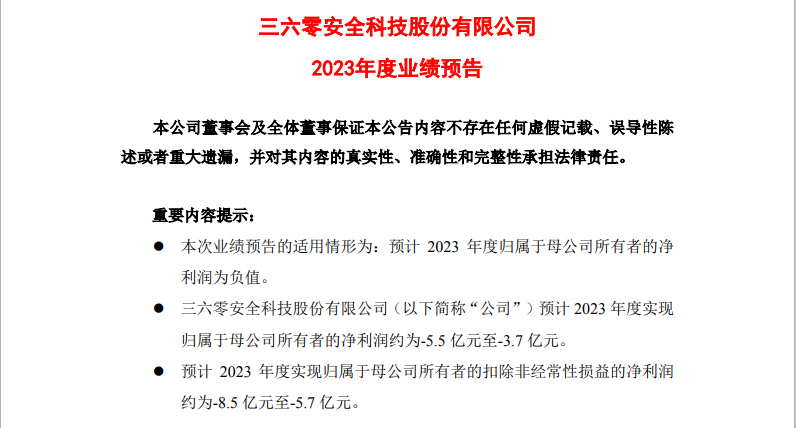 记者丨马永欣 见习生丨卓西峰 出品丨鳌头财经(theSankei) 1月31日,三六零(601360.SH)发布2023年度业绩预告,预计实现净利润亏损3.7亿元至5.5亿元。加上2022年净利润亏损的22.04亿元,三六零连续两年亏损。 三六零表示,2023年度业绩亏损主要受投资损益影响暨部分合联营企业亏损较大所致。 2021年10月,三六零选择入股哪吒汽车。2022年,三六零对参股公司合众新能源汽车股份有限公司(简称“合众汽车”,即哪吒汽车母公司)的投资收益亏损8.94亿元。 2023年第三季度报告显示,三六零前三季投资收益亏损3.85亿元,公司对联营企业和合营企业的投资收益亏损3.71亿元。 需要提及的是,2023年,哪吒汽车2023年交付量12.75万辆,同比下滑16%,在造车新势力中位列第6,是唯一交付量“开倒车”的车企。 有业内人士向鳌头财经表示,如果哪吒汽车迟迟不能盈利,将持续拖累三六零业绩,从而对股东利益造成不利影响。 完成对赌后业绩大降 三六零借壳上市后,连续5年盈利,近两年却连续巨额亏损,而周鸿祎只做了一件事情——入股哪吒汽车。 资料显示,三六零创建于2005年11月,逐步发展为中国最大的互联网安全服务和产品提供商,2011年登陆美国纽交所。 2015年6月,三六零创始人兼CEO周鸿祎宣布,启动公司私有化战略计划。 2016年7月,三六零私有化交易完成,从纽交所摘牌。2017年3月,公司完成股份制改造。 2017年11月,江南嘉捷发布了重大资产出售、置换及发行股份购买资产暨关联交易报告书(草案)。草案显示,三六零作价504亿元借壳江南嘉捷,同时承诺2017年至2020年扣非归母净利润分别不低于22亿元、29亿元、38亿元和41.5亿元,共计130.5亿元。 ![]() 2017年11月6日,在江南嘉捷和三六零联合召开重组说明会上,周鸿祎表示,在人工智能的研发已有3年,未来三六零经营会更多样。“未来360人工智能的4个方向,分别是与安防、广告、搜索分发以及智能硬件相结合。” 在2018年上市仪式上,周鸿祎指出:“随着中国GDP的增长,中国需要有一个与之相称的资本市场。在过去,很多互联网企业选择去国外上市,在未来,我们会看到各种新技术蓬勃发展。三六零尝试回归中国市场,未来还会有更多优质的互联网企业登陆A股,给A股的股民带来更多回报。” 2016年和2017年,三六零营业收入分别为99.04亿元和122.38亿元,同比分别增长-9.17%和23.56%;净利润分别为18.72亿元和33.72亿元,同比分别增长730.12%和80.15%,业绩较好。 2018年至2020年,三六零营业收入分别为131.29亿元、128.41亿元和116.15亿元,同比分别增长7.28%、-2.19%和-9.55%;净利润分别为35.35亿元、59.80亿元和29.13亿元,同比分别增长4.83%、69.19%和-51.30%,业绩出现较大波动。 2017年度至2020年度业绩承诺期间内,三六零累计实现扣除非经常性损益后归属于母公司所有者的净利润137.52亿元,较累计承诺净利润数超额7.02亿元,完成重大资产重组相关业绩。 完成业绩对赌后,三六零开始了“放飞自我”。 2021年,三六零实现营业收入108.86亿元,同比下降6.28%;净利润9.02亿元,同比下降69.02%。 2021年年报显示,三六零互联网广告及服务营业收入达63.06亿元,同比下降16.06%;智能硬件营业收入达20.63亿元,同比下降3.68%;互联网增值服务营业收入11.04亿元,同比下降2.67%;游戏营业收入10.4亿元,同比下降2.05%。三六零主要业务收入开始下滑。 “造车”不易股价跌去六成 业绩虽大幅下降,但三六零至少还是盈利状态,入股哪吒汽车后,公司开始亏损。 2021年10月,三六零公告称,公司拟以自有资金共计29亿元投资入股哪吒汽车,间接合计持有16.594%股权,成为哪吒汽车第二大股东。截至2021年12月31日,第一步交易涉及的转让协议履行了全部9亿元出资义务。 哪吒汽车2020年交付1.51万辆,位列造车新势力第5位。2021年前9月,哪吒汽车累计交付新车4.14万辆,其中9月销量交付7699辆位居新势力第3。 2022年6月,三六零通过了《关于转让参股公司部分股权的议案》,公司全资子公司三六零(北京)私募基金管理有限公司将持有合众汽车7999.44万元注册资本(未实际出资),对应合众汽车3.5320%股权转让给嘉兴鑫竹股权投资合伙企业(有限合伙)、深圳精诚开阔企业管理中心(有限合伙),转让对价为0元。 2022年,三六零实现营业收入95.21亿元,同比下滑12.54%;净利润亏损22.04亿元,同比下滑344.23%。 这一年,三六零的投资收益亏损了12.93亿元,其中公司对联营企业和合营企业的投资收益亏损9.46亿元,包括合众汽车8.94亿元的投资收益亏损。 2022年,哪吒汽车累计交付15.21万辆,同比增长118%,交付量升至造车新势力第一,定下2023年交付目标为25万辆。但哪吒汽车净亏损达69.19亿元,与上年同期相比,亏损29.08亿元。 ![]() 2024年1月31日,三六零发布2023年度业绩预告显示,公司预计实现净利润约为-5.5亿元至-3.7亿元;扣非净利润约为-8.5亿元至-5.7亿元。三六零净利润已连续两年出现亏损,最高亏损达27.5亿元。 三六零表示,报告期内,公司营业收入较去年同期略有下降,整体毛利与去年同期基本持平。本年度业绩预计亏损主要受投资损益影响暨部分合联营企业亏损较大所致。 其中,2023年第三季度报告显示,三六零前三季投资收益为亏损3.85亿元,公司对联营企业和合营企业的投资收益亏损3.71亿元。 哪吒汽车2023年交付量12.75万辆,同比下滑约16%,在造车新势力中位列第6,仅完成了交付目标的一半,是唯一交付量“开倒车”的车企。 近日,哪吒汽车CEO张勇公开发文“检讨”,指出哪吒