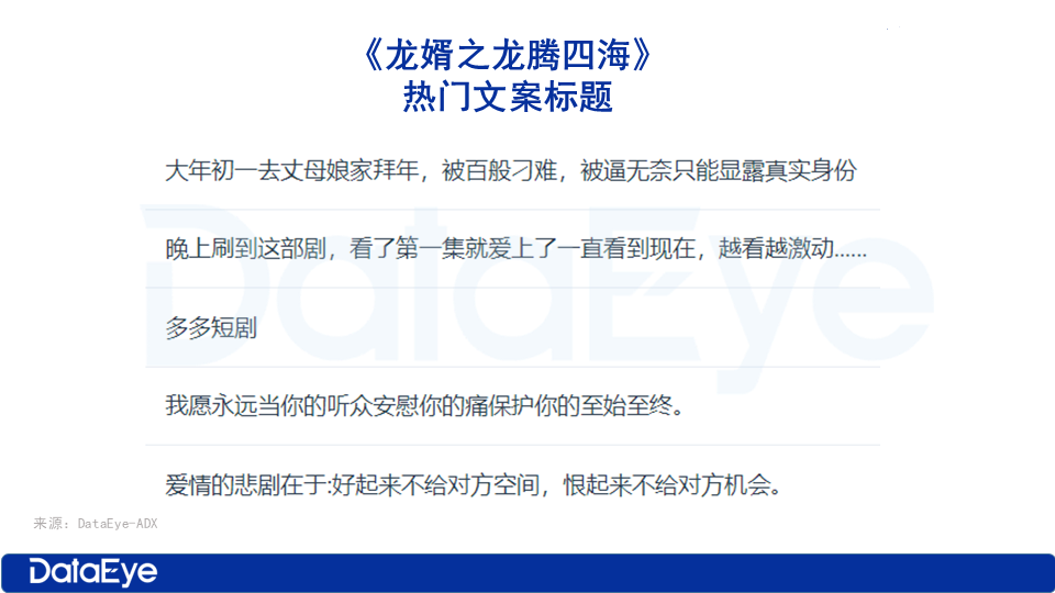 来源:DataEye 2024年春节期间,一批短剧新势力崭露头角。 新势力包括初创公司、大厂参股公司,以及转型玩家。 这些新势力虽然体量无法和头部相比,但在热力榜也占有一席之地。 今天,我们关注小梅文化及其上榜短剧《龙婿之龙腾四海》。 小梅文化是游戏人、媒体人转型做短剧的代表,同时做过小说,可以说是短剧新势力的典型代表。 一、游戏人转型短剧:《龙婿之龙腾四海》案例剖析 1、热力值消耗 ![]() △来源:ADX短剧版;DataEye短剧观察制图 根据DataEye-ADX数据,2月11日至16日,《龙婿之龙腾四海》热力值总额超280万。《龙婿之龙腾四海》于2月11日(正月初二)上线,上线当天跻身热力榜第14名。 DataEye短剧观察独家获悉,截至目前,《龙婿之龙腾四海》上线充值已突破600万元。《龙婿之龙腾四海》是小梅文化推出的首部短剧,首部作品上线10天充值600万,这个成绩可圈可点。 2、投放趋势 《龙婿之龙腾四海》上线以来整体投放呈现轻度化,上线当日仅有5条投放素材,单日投放峰值仅为80余组,素材类型全部为60秒以上的视频。 ![]() △来源:ADX短剧版;DataEye短剧观察制图 3、投放剧场 DataEye-ADX数据显示,《龙婿之龙腾四海》主投元元短剧(APP),占比约46.96%,其次为洋葱剧院(抖音小程序)、硕鼠短剧(APP),所有TOP剧场中微信小程序及APP均占4席。 ![]() △来源:ADX短剧版;DataEye短剧观察制图 4、投放文案 ![]() △来源:ADX短剧版;DataEye短剧观察制图 《龙婿之龙腾四海》近30天热门文案热词包括“丈母娘”“ 大年初一”“ 爱情”“ 百般刁难”等。 《龙婿之龙腾四海》热门文案主要突出逆袭、反转等特质。该剧属于男频题材爽剧,讲述了男主从傻子重生变成神医的传奇故事。 二、小梅文化入局短剧:游戏+影视+小说三重BUFF叠加,涉足剧本、承制两大环节 公开信息显示,《龙婿之龙腾四海》的承制方是北京小梅文化传媒有限公司。天眼查显示,小梅文化成立于2023年3月,注册资本100万,其下业务包括短剧影视制作、影视剧本开发、小说IP改编等。 小梅文化母公司北京小梅科技有限公司,是一家小说平台,成立于2021年3月。小梅科技平台旗下拥有原创小说版权800多部,代表作品包括《乡医小渔民》《天价盛宠:闪婚老公穷得只剩钱了》等。 目前来看,在短剧三个简化环节(剧本、制作、投放),小梅文化参与了剧本、承制两大环节,在投放环节,小梅文化主要与第三方合作。比如《龙婿之龙腾四海》投放主要由北京阅友科技有限公司负责。 在剧本环节,小梅文化除了依靠小梅科技的小说资源,还专门设立了剧本工作室,旗下编剧大多拥有爆款短剧代表作,其中不乏千万级产品。 小梅创始人徐红梅表示,公司最大的优势是拥有小说资源(自有版权),这也意味着公司对于内容的把控和数据更加透明。 在承制环节,小梅影视制作团队的主理人王鹏, 拥有丰富的影视经验,代表作品包括《无上总裁》《千金罪妻不好惹》《鬼门十三针》《狂赘奶爸不好惹》 《重生1992》等。 此外,小梅也涉足了短剧分销。2023年底,小梅也推出了短剧剧场—— “书友剧场”短剧小程序,目前该平台已上线几十部短剧。 值得关注的是,北京小梅文化创始人徐红梅曾就职于中手游、掌阅、央视网,拥有游戏、小说、媒体三个领域的工作经验。 创始人的复合背景,也使得小梅文化的发展路线不同于传统短剧公司。 由于小梅文化拥有游戏+影视双重背景,公司正在考虑入局互动影视剧,目前公司已和多家游戏公司进行接洽。 在题材上,小梅文化未来会挑战新的题材,不仅限于男频女频,小梅文化后续即将上线《天尊归来》《我的冰山女总裁》等短剧作品。 三、2024春节后,短剧新势力崛起! 2024年春节后,国内涌现了三支短剧新势力! 第一类:初创公司。代表公司:小梅、巨准互娱等。 第二类:大厂参股公司。代表公司:腾讯参股公司剧点、映宇宙参股公司美光盛世等。 第三类:转型玩家。代表公司:游戏公司昶飞、互联网公司序言泽等。 近期为何越来越多的新势力崛起? 首先,市场层面,短剧行业高速增长,且仍处于红利期。 据艾媒咨询数据,2023年中国微短剧市场规模达373.9亿元,同比增长267.65%,预计2024年超500亿,2027年超1000亿元。近千亿的市场空间,自然吸引大批公司入场淘金。 2024年以来,新势力巨准互娱凭借短剧《萌宝神助攻,爹地哪里逃》连续两天登顶热力榜榜首,游戏公司昶飞凭新剧《老祖宗驾到》曾强势闯入TOP3。 其次,产品层面,短剧内容相对简单可快速做出,产品周期不长。短剧制作趋于模板化,进入门槛远小于传统影视行业。对于游戏、小说、互联网等跨界选手来说难度并不算高。 像游戏公司擅长做内容和投流,对于模板化的短剧是降维打击,小说平台拥有丰富的IP资源,有大量的网络小说可以改编成剧本。 最后,技术层面,AIGC技术的发展也降低了内容创作门槛。近期火爆的Sora已经初步具备了制作短剧的技术可能性。未来,短剧团队借助Sora等工具创作短剧将成为可能。 那么,新势力的机会点在哪儿? 第一,题材差异化。比如,近期亲情、年代剧题材热度飙升,而在一个月前,萌宝题材热度居高不下。 比如,自春节后,亲情向短剧热度持续火爆。《人有悲欢离合》、《我在八零年代当后妈》、《我最亲爱的》等皆为亲情向短剧,且近期排名都较靠前。《美人在八零》《傻子学霸,开局高考震惊全球》等年代剧也多次跻身热力榜前