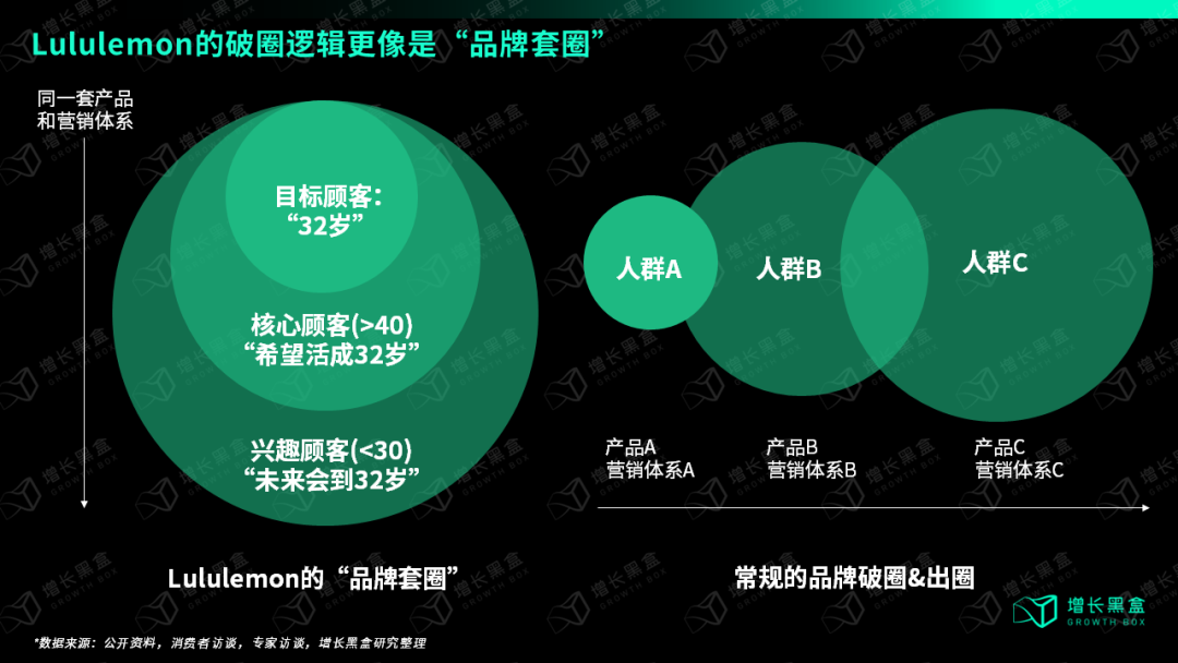1. 逻辑之谜:lululemon的破圈为何与众不同? 要研究lululemon的破圈路径,得先回答一个商业模式的问题:lululemon到底在赚谁的钱? 大家或许听过lululemon的发家史:创造一个让中产女性为之狂热的生活方式,这群高消费能力的人就会源源不断为之买单 - 按照威尔森自己的说法,lululemon的顾客就是年入10-15万美金、未婚、高学历的32岁的“超级女孩(super girls)”。 不过,我们用常识想想,自己身边能有几个年入百万的女性精英? 根据数据推算,在lululemon最大的北美市场仅有400万人符合上述条件。也就是说,哪怕在100%渗透率的前提下,每人每年都买10条100美金的瑜伽裤,lululemon只能赚40亿美金。事实上,lululemon在2023年的营收接近100亿美金。 对于品质的高要求,注定了lululemon无法像快时尚品牌一样不断拓展SKU。其早年的品类和款式非常单一,就算顾客的复购率再高,围绕一小波有钱人做生意的天花板并不高。 所以只有一种可能:lululemon根本不靠“超级女孩”赚钱。 十几年之前,时任CEO克里斯汀(Christine Day)道出了背后的秘密[3]。其实lululemon一直都有两类完全不同的用户: 首先,lululemon最忠诚的客户的确是“超级女孩”,被称为目标顾客(target customer)。整个品牌文化就是围绕她们去构建的,也是品牌最先渗透的人群。虽然这些人在参与活动、口碑传播上非常积极,用大量的行动为lululemon投票,但这些白领精英有更多的品牌选择空间,对lululemon销售额贡献不是最大的。 她们真正的角色是诱饵(attractor),也就是行走的”广告牌“。作为瑜伽爱好者、铁人三项运动员、跑步者等,她们自身就是当地社区中的运动潮流引领者,自然吸引了另一类核心顾客(core customer)的追随。 核心顾客年龄通常在40-45岁,或许没有目标顾客那么喜欢运动、追求时尚,但对于生活品质的要求却很高,比普通中产更加富有。她们真正用钱为lululemon投票,舍得花大价钱去买产品,从而构成了lululemon主要的收入来源。 因为,核心顾客们认定这种生活方式“让自己看起来更像32岁”。lululemon先通过一群人的生活方式“建圈”,再让它“破圈”成为另一群人的梦想。 这个路径不仅沿用至今,还扩展出一类兴趣圈层,即青少年和Z世代。相当于在“超级女孩”的成长之路上就提前做了布局,他们现在没钱不代表未来没钱。lululemon今天的战略早就不是聚焦瑜伽运动,而是范围更大的潮流时尚,所以会瞄准对时尚最敏感的人群。顺便一提,lululemon已经是美国青少年第三喜爱的服装品牌了[4]。 ![]() (资料来源:lululemon investor day) 在中国市场,我们同样观察到lululemon的客户有两种明显的分层:
