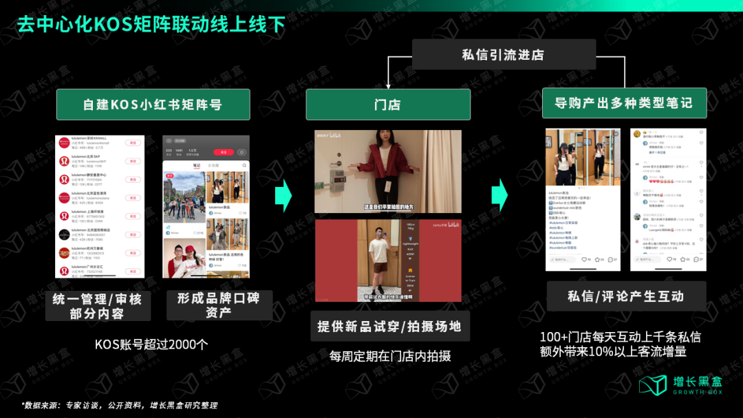 为什么会有这么多营销素材?通过AI算法的识别发现:私域的图片大多属于日常穿搭照,而它们来自2000多个小红书的账号 - 即小红书源源不断为私域提供销售物料。 此时我们有了一个大胆的假设:内容体系才是关键所在 - 将导购能力数字化,借助内容链接消费者和全域零售场景。通过去中心化生产和分发内容,再经由中心化管理监督,从而解决个性与规模的矛盾。 经过多方面调研,我们最终还原出了一套线上线下、公域私域联动的“组合拳”:依托门店导购打造KOS,通过小红书传播内容并引流线下,再利用企业微信拉动线上增量。这不仅保留了导购的个性化元素,还能够通过规模化的方式线上传播,同时在总部的管理下减少风险、提升运作效率。 ![]() 我们先看第一层:用去中心化的方式生产海量内容,联动线上线下。