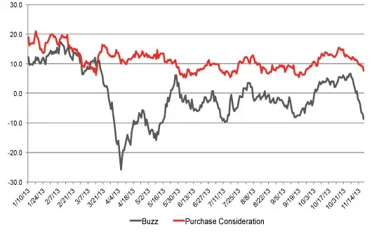 可以看到,虽然lululemon门店增加了很多,但同店增长率却创下历史新低,坪效也进入了下滑的状态,整整持续了5年。在北美,作为曾经坪效仅次于苹果的零售标杆,这个表现只能用糟糕来形容。 ![]() 从库存的角度来看:由于要给接下来的扩张做准备,lululemon必须储备大量库存。2011-12接连几个季度,公司的库存增长率都在50%以上。 但问题是Lululemon不拥有任何生产设施,到今天都是纯OEM模式。它从50多家供应商那里采购必要的面料,然后交给20多家工厂去生产。而最核心的luon面料占公司总用量30%,十年来却只有中国台湾Eclat Textile Co这一家供应商。 如果外包公司远离国外制造中心,质量监控能力就有很大阻碍。lululemon当年的供应链管理能力还未达到一流水准,短时间内交给上游这么多订单压力,谁能保证工厂不出问题? lululemon的库存从2011年就开始大量积压,2016年后才逐步恢复正常,给财务带来了很大压力。 ![]() “因为对自己创立的lululemon失去了信心,我竟然靠着买卖nike和under armour的股票大赚一笔,这真是莫大的讽刺!” 威尔森在自传中写道,2013-2017年是lululemon“失去的五年”,投资任何一家竞品的股票,都会比自己创办的公司更赚钱[1]。 2013年,lululemon已经创造了股价4年翻18倍的巅峰。然而,从当年1月开始,公司突然接到大量用户投诉:其经典款的瑜伽裤太“透”了,如果去做俯身的瑜伽动作,那就相当于没穿裤子。 麻烦的是,所有采用Luon材质的裤子都有问题 - 而这批货占到所有女士下装库存的17%!为了挽回用户口碑,lululemon不得不花费6500万美金的代价,在2013年3月召回了所有存在问题的产品[6]。 本来用户们都期待着一个真诚的道歉,不料创始人威尔森在采访中神补刀:“坦白说,有些女性的身体实际上并不适合瑜伽裤......更重要的是对大腿的摩擦,一段时间内有多少压力。”[7] 整个舆论立刻炸了锅:裤子质量不行,反倒是用户自己身材的问题? 回想一下去年某头部主播的翻车,可谓是惊人的相似:“有的时候找找自己原因,这么多年了工资涨没涨, 有没有认真工作?” 到底是媒体恶意剪辑,还是他自己太嚣张,真相不得而知。但可以确定的是,lululemon的业绩因此大受影响。 数据显示,在事件发生的一年内用户对lululemon的购买意愿,已经降低到原来的三分之一(红线);而关于品牌的认知,也从正面下降到负面(黑线)[8]。 ![]() 这次事故带来的不仅是当下的信誉和库存受损。由于公司忙着去弥补产品召回带来的库存空缺,精力都在旧产品上,导致产品创新没跟上,市场竞争力下降。而同时期under armor、nike甚至gap都表现优异。 另一方面,公司因此事件产生了巨大管理层变动,甚至威尔森本人都被踢出了董事会,导致延误了Q4的销售旺季。而lululemon40%的销售额都来自于Q4。 到了2014年,lululemon的市值基本上已经腰斩了。幸亏lululemon有DTC模式支撑,利润率比一些奢侈品还高,这才能够在2018年走出低谷。 6. 结语 至此,我们得以从lululemon身上看到一个顶级品牌不断破圈的逻辑和路径: