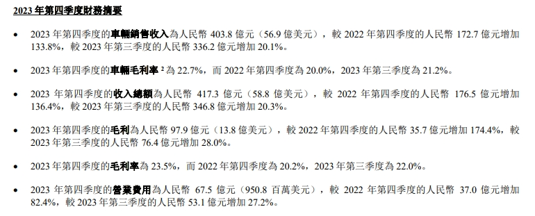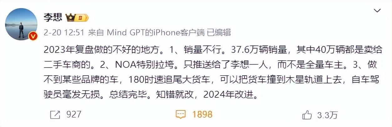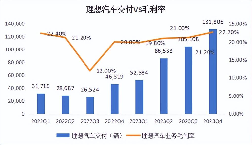 作者 | 刘亮 编辑 | 趣解商业 2月26日晚间,理想汽车(2015.HK)公布了2023年第四季度和2023年全年的财报。 2023年第四季度,理想汽车营收为417.3亿元,同比增长136.4%;2023年全年实现营收1238.5亿元,同比增速173.5%。自此,理想汽车正式成为中国“新势力”车企中第一家年营收破千亿元的车企。 ![]() 图片来源:理想汽车财报截图 不过,随着2024年1月问界汽车销量反超理想,同时开年各家车企又开始降价大战,加上理想MEGA等其他纯电车型的上市,今年理想汽车整体的成本、营销费用预计也会随之上升。 那么,在新的一年,在新挑战、新打法之下,理想还会“香”吗? 01.李想“破大防”?李想,似乎“破防”了。 前几天,理想汽车的创始人李想发了条微博复盘2023年做得不好的地方,他说了三点:第一,销量不行,“37.6万辆销量,有40万辆都是卖给二手车商的”;第二,NOA拉垮,“只推送给了李想一个人”;第三,做不到像某些品牌的车,180时速追尾大货车而驾驶员毫发无损。 ![]() 图片来源:微博截图 网友们一看,这一番看起来自我检讨实际上阴阳怪气的说辞立刻引起了讨论,不少网友评论说这个微博似乎是在“阴阳华为”;于是网友们戏称,“打不过华为,破防了。” ![]() 图片来源:微博截图 就在2月初,问界汽车和理想汽车分别公布了2024年第一个月的销量成绩。 2024年1月份,问界全系交付3.30万辆,环比增长35%;相较之下,理想在1月份销量环比下降6成至3.12万辆,落后问界1800辆。 虽然这个差距看起来还不是很大,不过要知道这已经是在理想开年全系降价最高超过3万元的情况下完成的业绩,并且理想汽车2024年的全年销量目标为80万辆,所以1月份3万辆出头的成绩就似乎显得并不尽如人意。 “车fans”创始人孙少军更是发微博表示,1月销量之所以重要是因为按照各个车厂产能的规划,1月拿到销冠基本意味着2024年第一个季度会被“问界包圆”。 ![]() 图片来源:微博截图 而随着近期大量新车的发布也可以预见,新能源汽车市场在三月会迎来更大的价格战。 实际上,理想和问界的竞争早就开始了。 去年李想就曾经在微博上说“2022年三季度,问界M7的发布和操盘,直接把理想ONE打残了,我们从来没遇到过这么强的对手,很长一段时间我们毫无还手之力。”他说,华为的超强能力直接让理想ONE的销售崩盘、提前停产,一个季度就亏损了十几亿。李想还表示,在2022年9月底的雁栖湖战略会上达成一个重要的共识,全面学习华为,学习最先进的企业。 不管李想是真学习还是假谦虚,问界也丝毫没有“手软”。2023年12月一辆理想L7在广东省清远市发生严重交通事故,在高速上追尾大货车,事故造成小汽车驾驶员及一名乘客死亡,另一名乘客受伤。结果随后在12月26日问界M9的发布会上,余承东就专门展示了M9被大货车挤压的碰撞测试视频,称A柱、B柱、C柱、D柱都没有变形的情况。可以说,“火药味”满天飞。 ![]() 图片来源:微博截图 问界这次销量反超理想的主力军是改良版的M7。按照问界官方的说法,新款M7共投入了5亿进行大改造,这些钱用于车身、底盘和性能,以及空间设计和布局,还有智能驾驶和智能座舱。新车在增加激光雷达、摄像头、降低车身高度、新增棕色方向盘和内饰等更新的情况下,售价由老款的26万元起售降到了24.98万元起售。相较之下,车型相似的理想L7,其30万元之上的售价就让很多消费者直呼“想卖了理想换问界”。 理想自然也感受到了来自新问界M7的冲击。此前曾有媒体报道,理想汽车部分门店推出了一项政策,只要是交了问界新M7定金的,拿着定金截图购买理想汽车可以报销定金,让客户没有任何损失;另外,给其他车主的权益,改定车主也全部享有。 不过问界很快就推出了应对策略;具体做法是,车辆如发生交付延迟,会给用户200元/天的补贴,最高1万元。问界还给出了一个附加条件:2023 年 11 月 30 日 (含) 前完成大定支付的问界新 M7 用户可以享受此次计划;用户可以按照按超出天数 (车辆已到店日期-交付方案已确认日期-等待周期) 获得提车关爱现金补贴。 ![]() 图片来源:微博截图 问界背靠华为,不仅有自带的流量还有华为自身品牌的调性会吸引一部分商务用车的用户。几套连招对峙,以1月份问界销量暂时领先告一段落。 不过理想其实还可以有进一步的降价动作,从2023年第四季度的财务数据来看,理想的毛利率是22.7%,但是从年平均售价来看2023年理想汽车平均售价为32万元,较2022年的33.1万元已经 有所降低,这已经是L7的降价活动带来的影响。而且频繁降价也会影响理想想要持续走高端车型的品牌形象;所以降价这把“双刃剑”,还得悠着用。 02.“车海”与“出海” 2月26日,理想汽车公布了2023年第四季度和全年的财务数据,也在电话会议上透露了全年的重点战略。 在毛利率上,理想汽车还是“遥遥领先”。2023年第四季度,理想汽车业务毛利率仍超过20%的水平;相较之下,同为“新势力三巨头”的蔚来和小鹏汽车最新公布的2023年第三季度的毛利率分别是11%、-6.1%。 ![]() 图片来源:理想汽车财报截图 电话会议上,理想汽车销售与服务副总裁邹良军还透露,2024年第一季度的预计总交付量在10-10.3万辆;以此计算,那么其3月份的交付量就要预计超过5万辆。同时,邹良军还表示,“在6月的交付量将会达到7万台”,“今年年底月销量超过10万台”。 受到财报公布信息的积极影响,理想股价一路飙升。截至2月27日收盘,