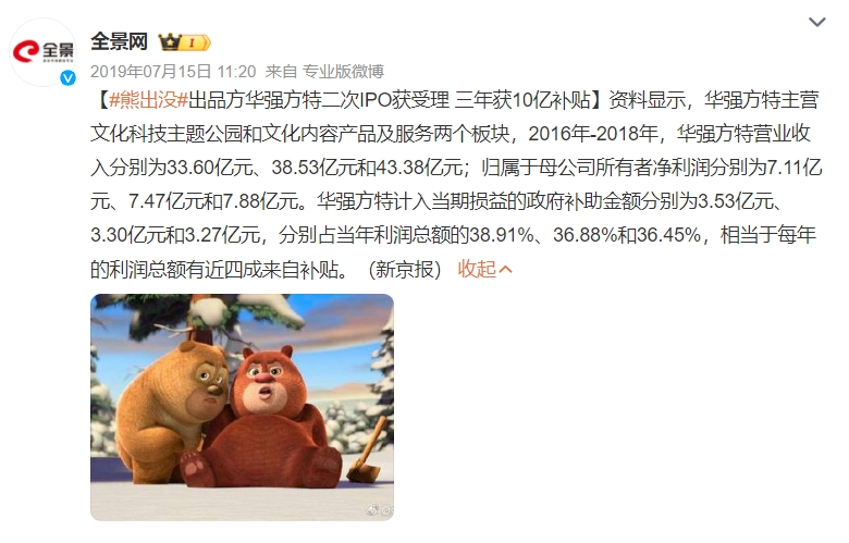 作者 | 武丽娟 编辑 | 趣解商业 春节假期虽已结束,但春节档电影“票房大战”还在继续。 今年春节档最大的亮点是谁?除了“贾玲减肥100斤”的《热辣滚烫》之外,《熊出没•逆转时空》无疑是最大黑马,春节期间(2月10日—2月17日)票房超越了张艺谋导演的《第二十条》以及刘德华主演的《红毯先生》,登上票房前三名的宝座。 熊大、熊二和光头强,实属春节档老面孔,很多网友戏称,“张艺谋、刘德华都打不过熊出没”。 ![]() 图片来源:猫眼专业版截图 《熊出没·逆转时空》的第一大出品方为华强方特(深圳)动漫,是华强方特的全资子公司,其主要出品方有7家,还有浙江横店影业、中国电影股份、天津猫眼微影、万达电影等16家联合出品方。 除了拥有“熊出没”IP,华强方特还是国内与华侨城集团、长隆集团并列的三大主题公园集团之一, 已成为全球前五大主题公园集团之一。作为国内文旅龙头企业,华强方特(834793.NQ)以95亿元的市值名列新三板前10位,这其中,“熊大、熊二”功不可没。 拥有知名IP、打造主题乐园,相似的商业模式,被称为“最像迪士尼的中国公司”,华强方特与迪士尼百年打造的梦想王国和商业帝国还有多远? 01.赢麻了!10年10部75亿票房 从熊大、熊二、黄头强,到吉吉国王萝卜头,都是小朋友们耳熟能详的动漫形象。2012年,《熊出没》系列动画片第一部亮相CCTV-1,便一炮而红,憨厚搞笑的台词,不少小朋友都能模仿几句。 2014年,华强方特乘胜追击,《熊出没》首次推出贺岁大电影,《熊出没•夺宝熊兵》上映,获得2.47亿票房,是首部突破2亿元票房的国产动画。 此后的10年间,《熊出没》每年都会在贺岁档或春节档“刷脸”(2020年除外),前9部总票房超过57亿。2017年到2022年,该系列电影票房基本在5亿到10亿之间,2023年《熊出没·伴我“熊芯”》以14.95亿元的成绩,稳坐春节档票房第三宝座。 ![]() 图片来源:太平洋证券研报截图 在国产动画电影票房前15名中,《熊出没》系列电影有7部。 今年春节档的,很多成人观众联想到漫威的《复仇者联盟4》《X战警》《头号玩家》等好莱《熊出没·逆转时空》,高质量制作和有趣的故事情节吸引了大量观众。影片制作中还隐现了大量科幻元素坞大作。 截至2月26日下午,《熊出没·逆转时空》总票房已超过18亿元,进入中国影史动画电影票房前三位。排名前两位的是《哪吒之魔童降世》(50.36亿元)和《长安三万里》(18.24亿元)。有电影机构给出其20亿的预测票房。至此,“熊大、熊二”十年间狂揽超75亿元票房。 ![]() 图片来源:猫眼专业版截图 同时,据灯塔专业版数据,《熊出没》10部电影已经为背后相关出品公司带来超26亿元的分账收入。华强方特在财报中透露,第十一部大电影也已在制作中。 诞生12年的《熊出没》已然成为中国动画领域热门IP之一,也为华强方特的业绩增长增砖添瓦。 其实,“熊”不仅仅活跃在荧屏,华强方特在金主IP上衍生出的主题公园、酒店等文旅项目,才是其重磅业务。 02.“熊出没”之父:左手动漫,右手文旅 华强方特旗下有三大业务:主题公园、特种电影和数字动漫;其中,主题公园业务起步最早、规模最大。 其实,华强方特最早是从事计算机系统集成的公司,2005年,研发出了室内数字游戏项目,并为国内主题乐园、大型商场购物中心提供技术。 2006年,华强方特与世纪金源集团合作,在重庆建了一个占地4万平方米的户外主题公园,开始构建主题公园业务。 2007年,华强方特与芜湖市政府合作,建设了第一家主题乐园芜湖方特欢乐世界。 根据华强方特官网内容显示,目前华强方特在全国17个省共运营30余个方特主题乐园。不过,这些项目多位于二三四线城市。 ![]() 图片来源:华强方特官网截图 2020年至2022年,受到疫情反复的影响,华强方特等主题乐园运营收入增长受限。 2022年,华强方特实现营收45.39亿元,同比增长0.92%;净利润亏损6077.66万元,亏损幅度同比收窄75.22%。其中来自文化科技主题公园板块的营收为34.95亿元,同比下滑6.14%;主题公园运营营收23.39亿元,同比下滑10.93%;文化内容产品板块实现营收10.12亿元,同比增长35.35%。 ![]() 图片来源:华强方特2022年报截图 从营收结构来看,以2022年为例,其文化内容产品业务占比仅二成左右,而近八成营收主要来自于主题公园业务。 华强方特此前披露的《招股书》显示,主题公园收入来自门票、园内二次消费两部分,门票收入占比超70%,二次消费仅占不到30%。二次消费重就包含“熊出没”IP的衍生品。 亏损之下,2022年,华强方特开始以“熊出没”的产品品牌,拓展上下游产业链,线上在玩具、衍生品上进行开发,线下铺开实体项目和旅游经济。比如设计生产了T恤、盲盒、音乐盒、STEAM玩具等,并拓宽电商渠道,构建了全平台体系销售渠道。 随着消费复苏,国内旅游市场逐步恢复生机。2023年上半年,华强方特实现28.7亿元的营收,同比增长43%,净利润2.9亿元。其中文化科技主题公园运营收入19.77亿元,同比增幅达174.47%,打破了自2021年以来的持续亏损记录,由盈转亏。 ![]() ![]() 图片来源:华强方特2023半年报截图 2023年,华强方特进一步推出“动漫+文旅”融合模式,再度押宝“熊出没”IP。今年2月,首个“熊出没”主题公园“熊出没欢乐港湾”在浙江临海正式开业。 不过,在主题公园的游玩体验上,消费者“吐槽”也是常有的事。在小红书平台,有网友称方特乐园为迪士尼的“平